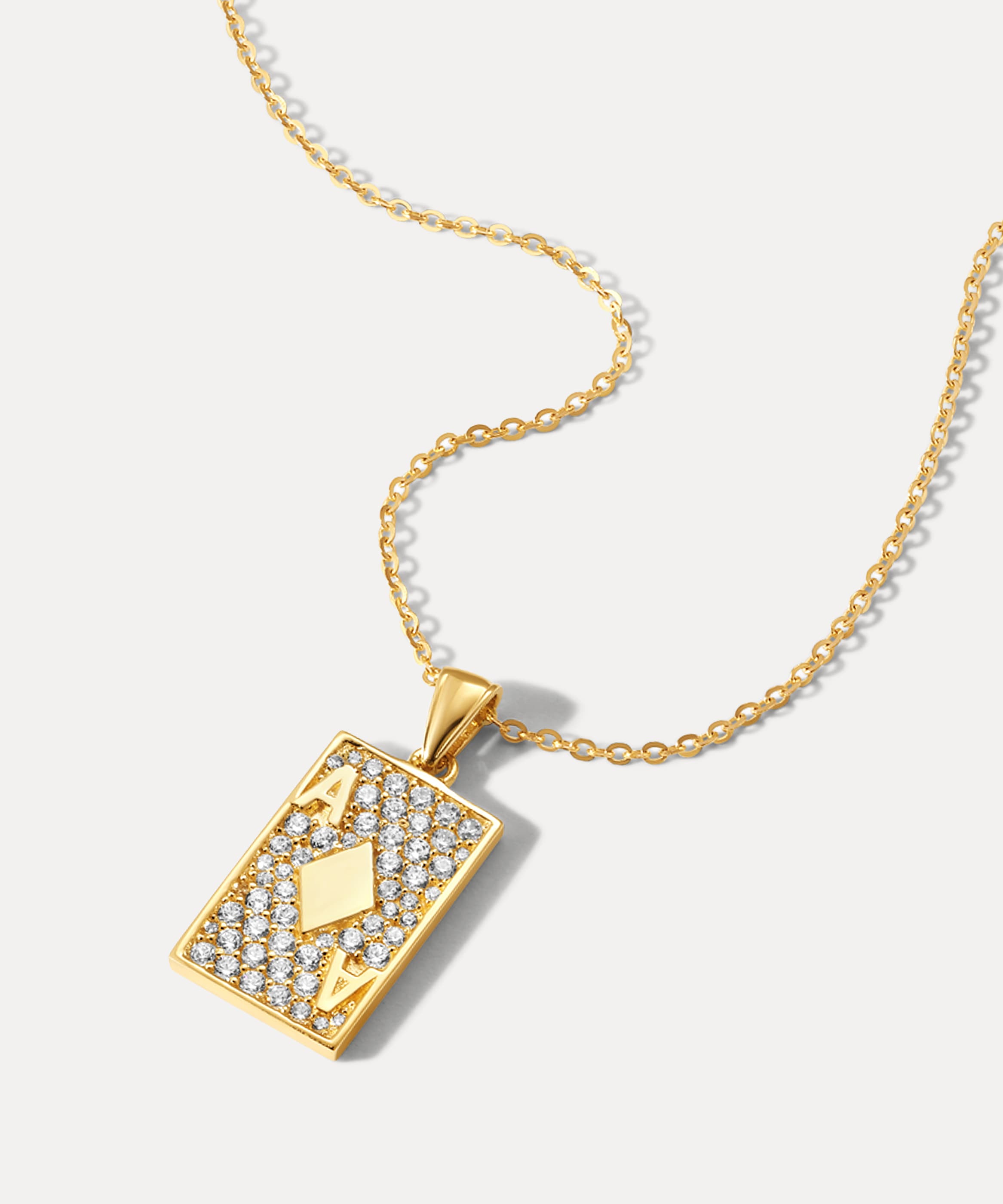 Inspired by the most powerful card in the deck, the Ace of Diamonds Pendant is a standout piece designed to turn heads. A field of round CZ stones surrounds a raised diamond motif, anchored by signature “A” markers at the top and bottom.
