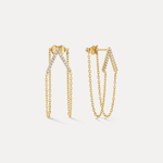 A pavé-set “V” brings structure and sparkle to the front, while twin 14k gold chains drape elegantly to the back, forming a double-take-worthy silhouette. Lightweight and architectural, they move with you — striking the perfect balance between bold geometry and subtle motion. Equal parts refined and edgy, they elevate any look — no extra styling required.