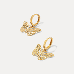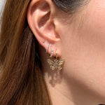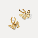 Delicate, dimensional, and full of movement. The Butterfly Hanging Huggies feature a sculpted butterfly charm with diamond-cut detailing and a hammered finish that catches and reflects light from every angle. Cast entirely in solid 14k gold — from the charm to the textured huggie — these earrings offer shimmer with every step and a secure, comfortable fit thanks to a hinged clasp. A playful take on polished gold, made to flutter.