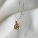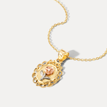 Inspired by vintage portraiture, this necklace blends old-world charm with modern craftsmanship. At its center, a three-tone floral motif—rose gold flower, white gold leaves, and a yellow gold base—rises above a textured gold backdrop. The scalloped, lace-like frame is finished with filigree details that echo Victorian-era design.