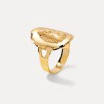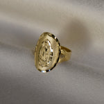 A tactile statement of faith and tradition. This ring features a bold, raised depiction of Our Lady of Guadalupe — sculpted in three-dimensional detail for a design you can see and feel. Crafted in solid 14k gold, the softly brushed oval face is framed by polished, faceted edges that catch the light with every movement. With open shoulders and a tapered band, it’s a modern take on a timeless symbol of devotion and protection.