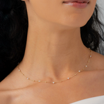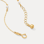 Soft luster meets sharp shimmer in a balance of contrast — with hand-wired pearls linked along a gold chain, accented by ultra-reflective beads. Refined yet playful. Finished with an extender tipped with a gold bead for the perfect drape.