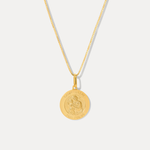 The Pray For Us Necklace features a solid 14k gold medallion of Saint Joseph holding the infant Jesus — a powerful symbol of protection, guidance, and quiet strength. Engraved around the border are the words Saint Joseph Pray for Us, adding a layer of intention to this weighty, cherished piece.