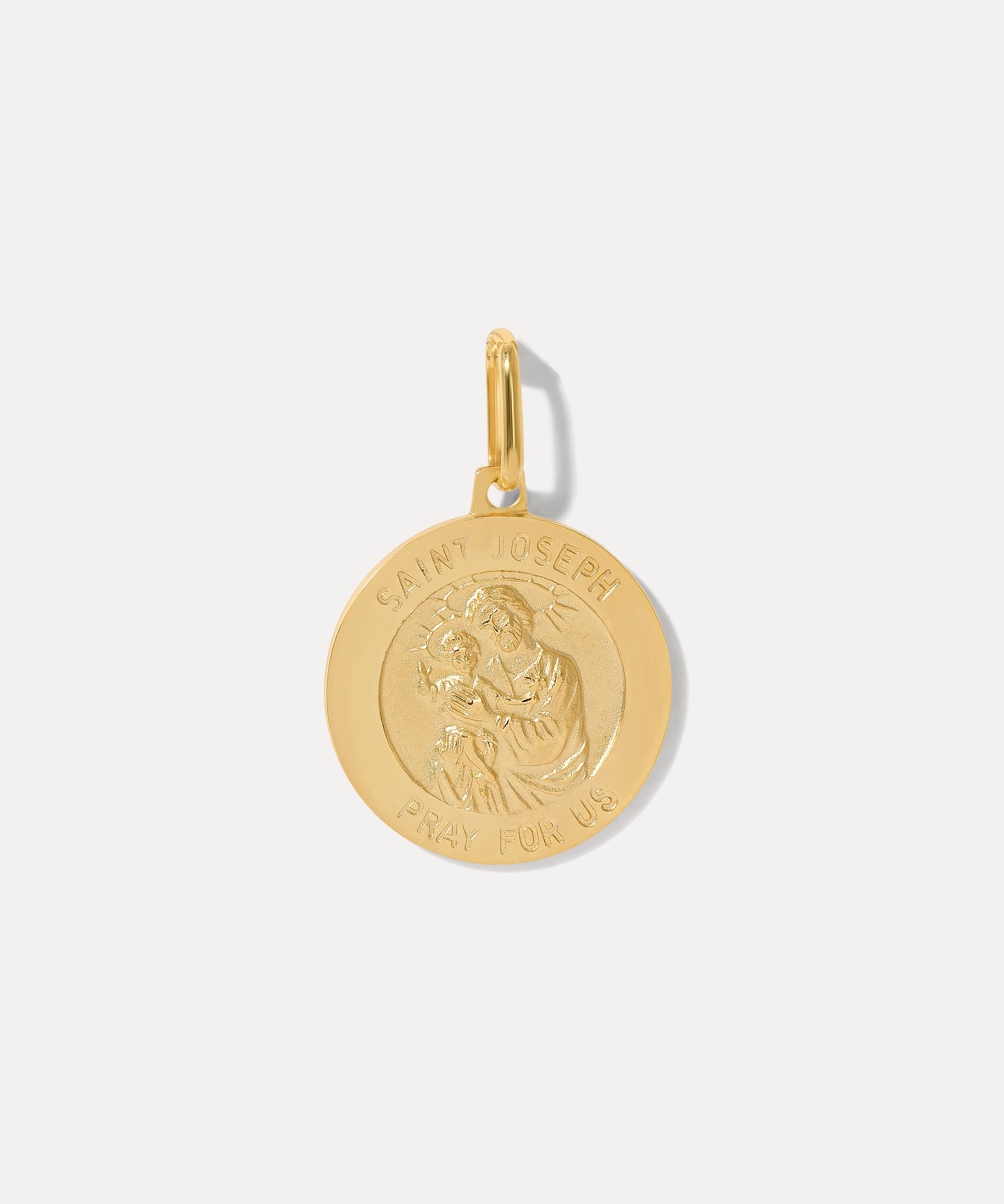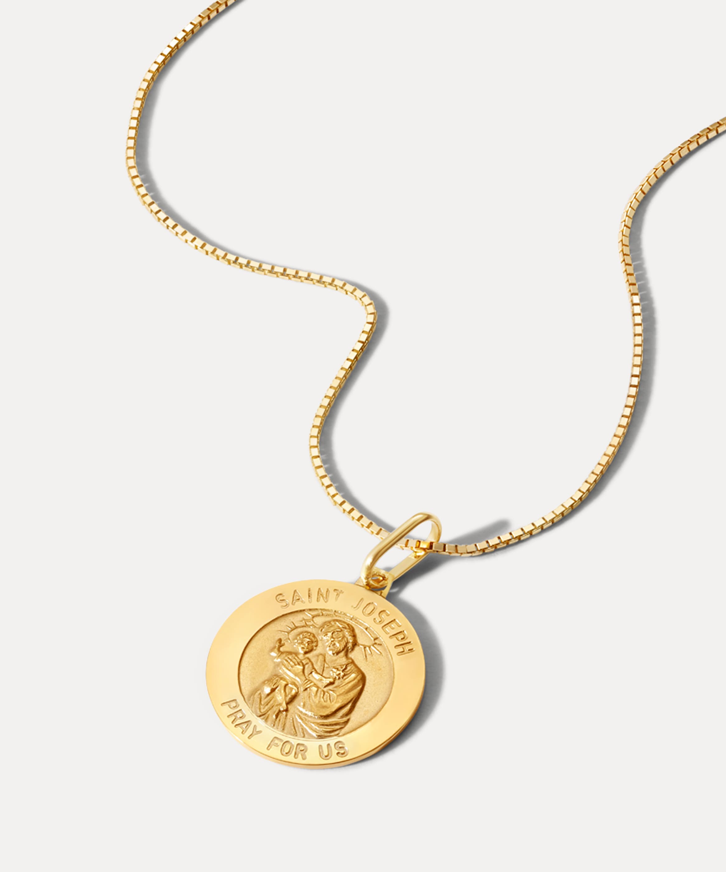 The Pray For Us Pendant features a solid 14k gold medallion of Saint Joseph holding the infant Jesus — a symbol of protection, guidance, and quiet strength. The phrase Saint Joseph Pray for Us is engraved around the border, adding intentional meaning to this weighty, cherished piece.