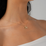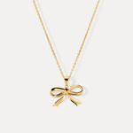 Shaped like a soft ribbon in solid 14k gold, this pendant captures the gentle folds of a tied bow — polished to highlight its curves and suspended from our signature chain, tying it all together. Sculptural in form but unexpectedly dainty, it makes a subtle statement on its own or layered.