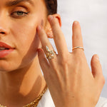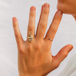 A symbol of transformation and eternal renewal, this 14k gold serpent coils around the finger with sinuous elegance. Etched with a pattern of scales and crowned with two piercing eyes, it’s a bold statement ring that commands attention — equal parts mystic and modern.
