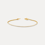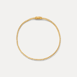 The Tennis Bracelet features a slim 14k gold band set with a continuous line of round white cubic zirconia stones in a pavé setting, wrapping the wrist in timeless brilliance.