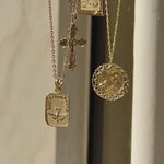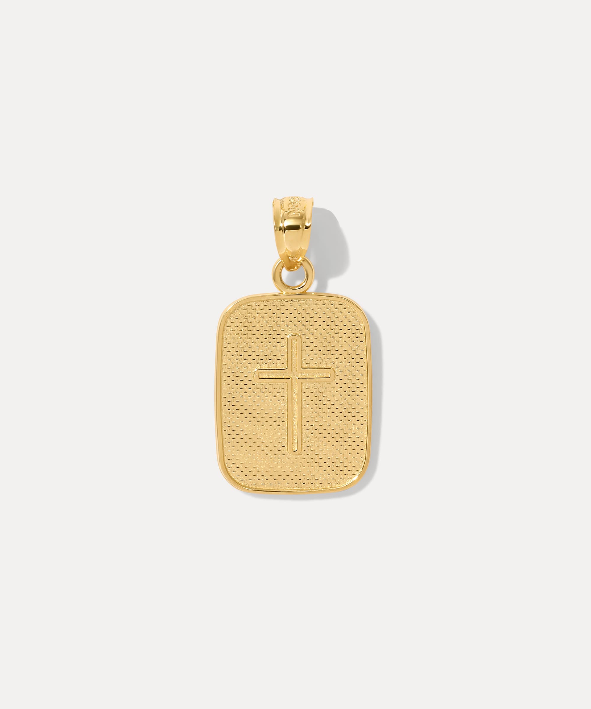 This reversible pendant honors the Holy Spirit in both word and symbol. One side features a descending dove — a sacred representation of peace and the divine — with “ESPÍRITU SANTO” embossed above a hammered gold surface. On the other, a raised cross over the same textured finish.