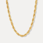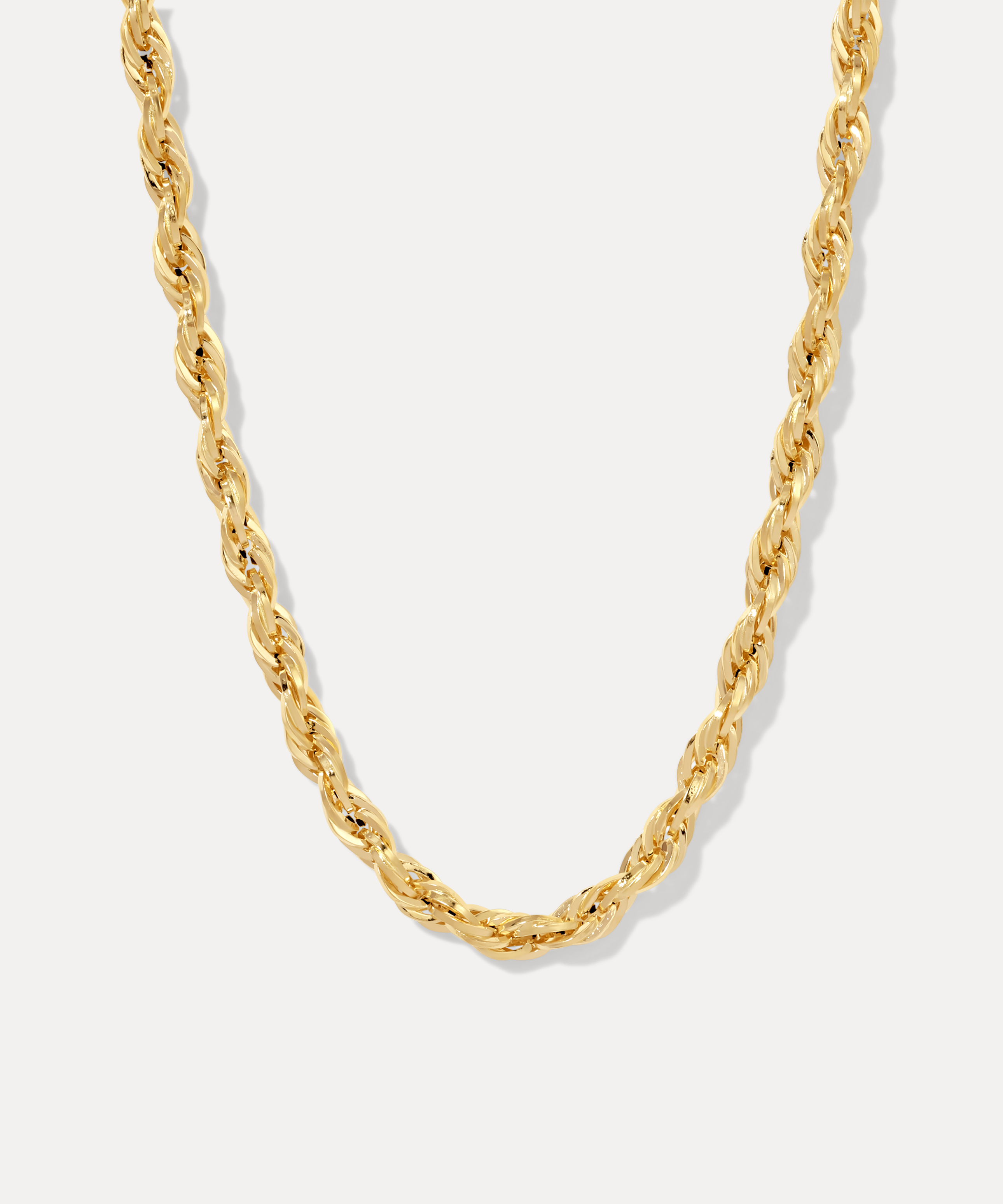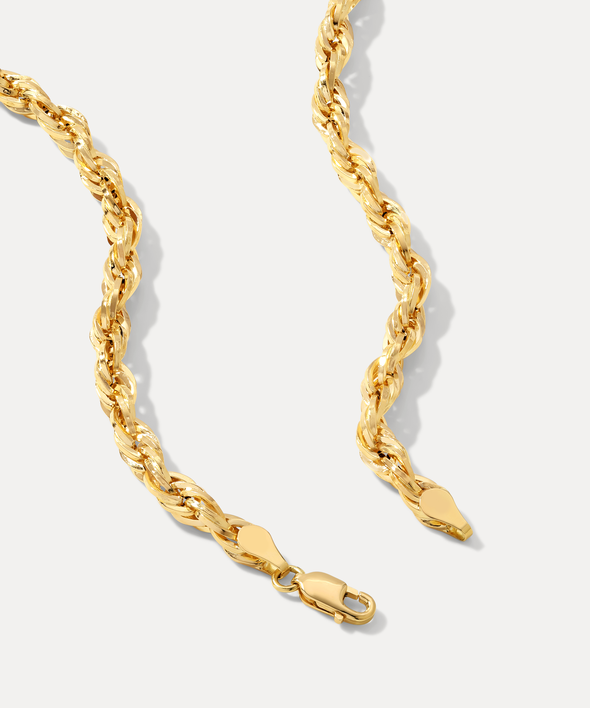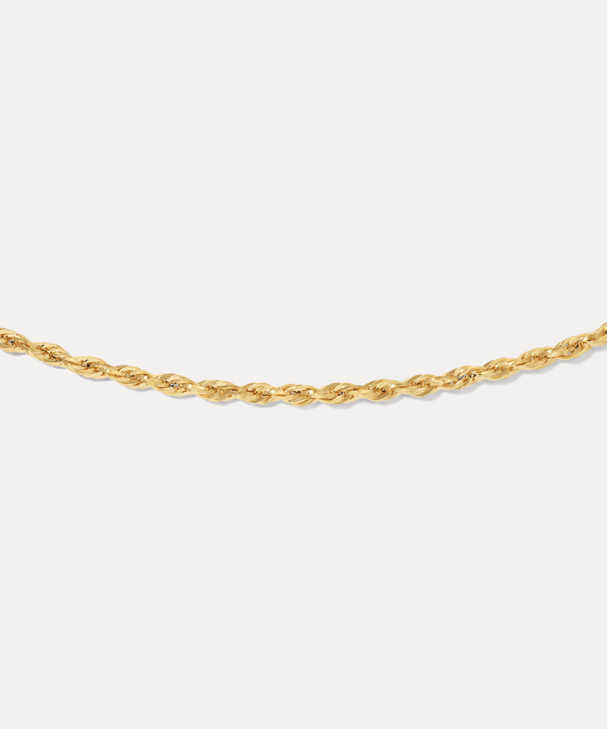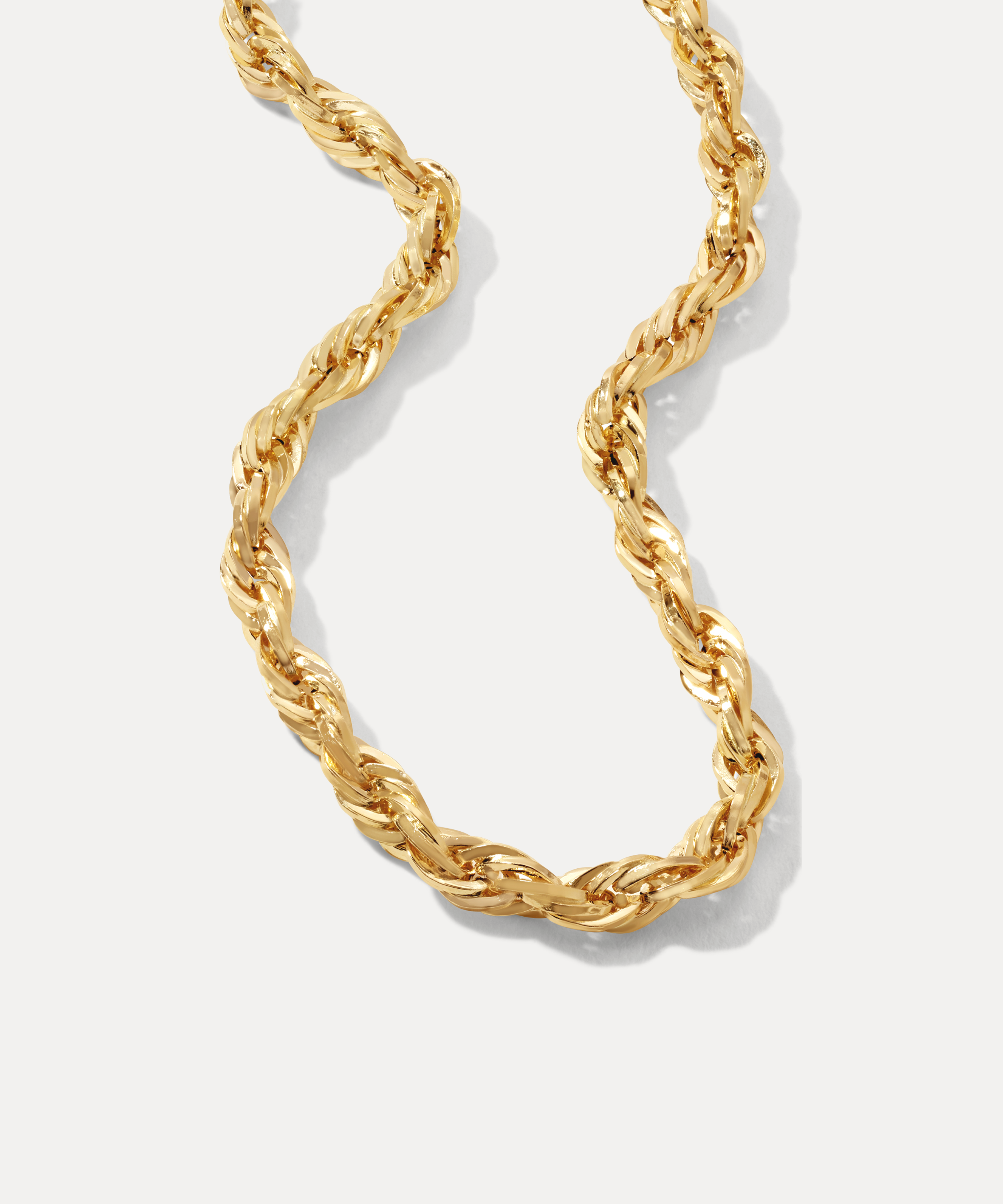 A timeless statement with serious presence. The Rope Chain’s thick, spiraled links catch and reflect light from every angle, casting a golden glow that stands out. Crafted in 14k gold with a hollow-core design, it delivers bold texture without the bulk — confident, classic, and easy to wear.