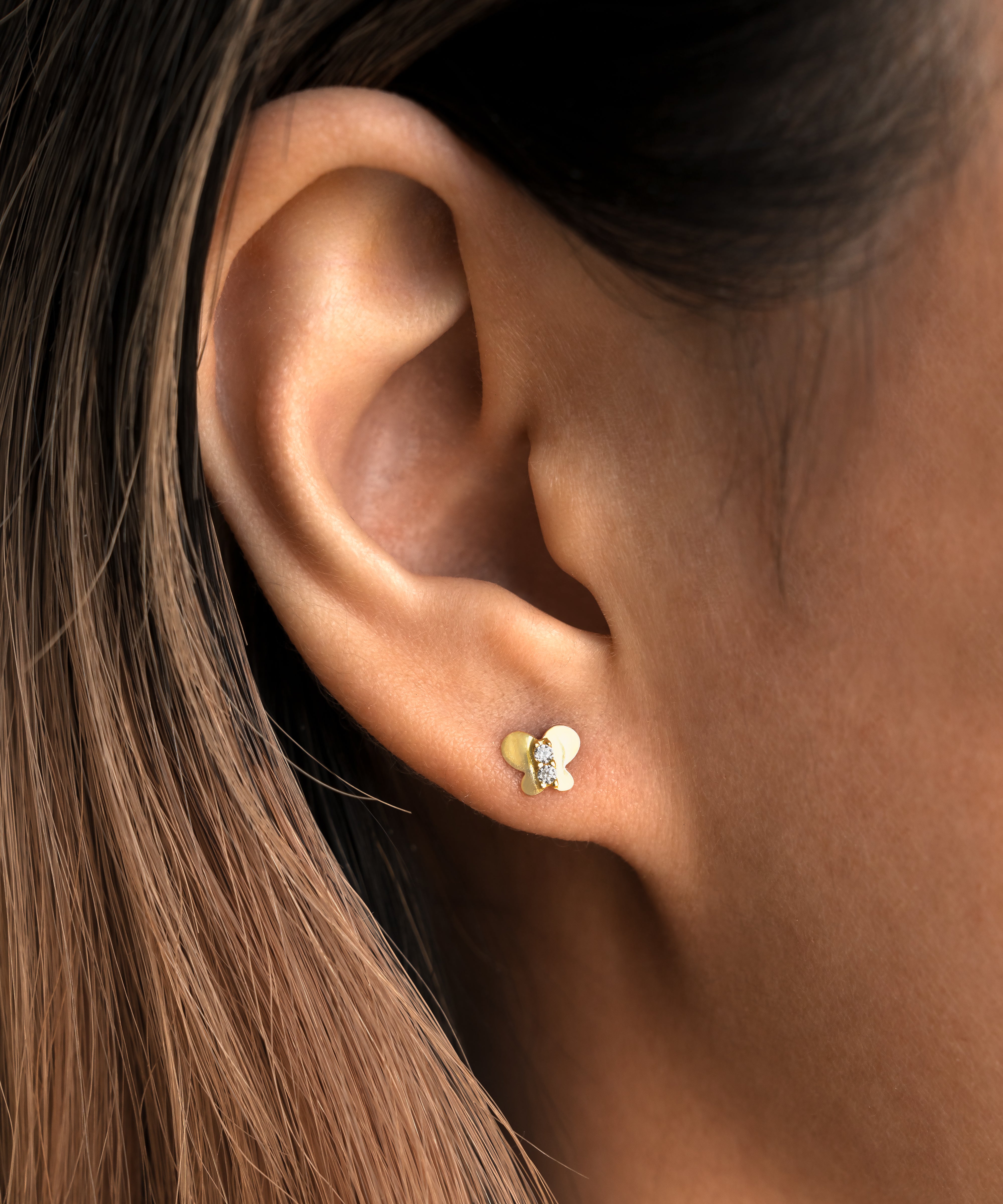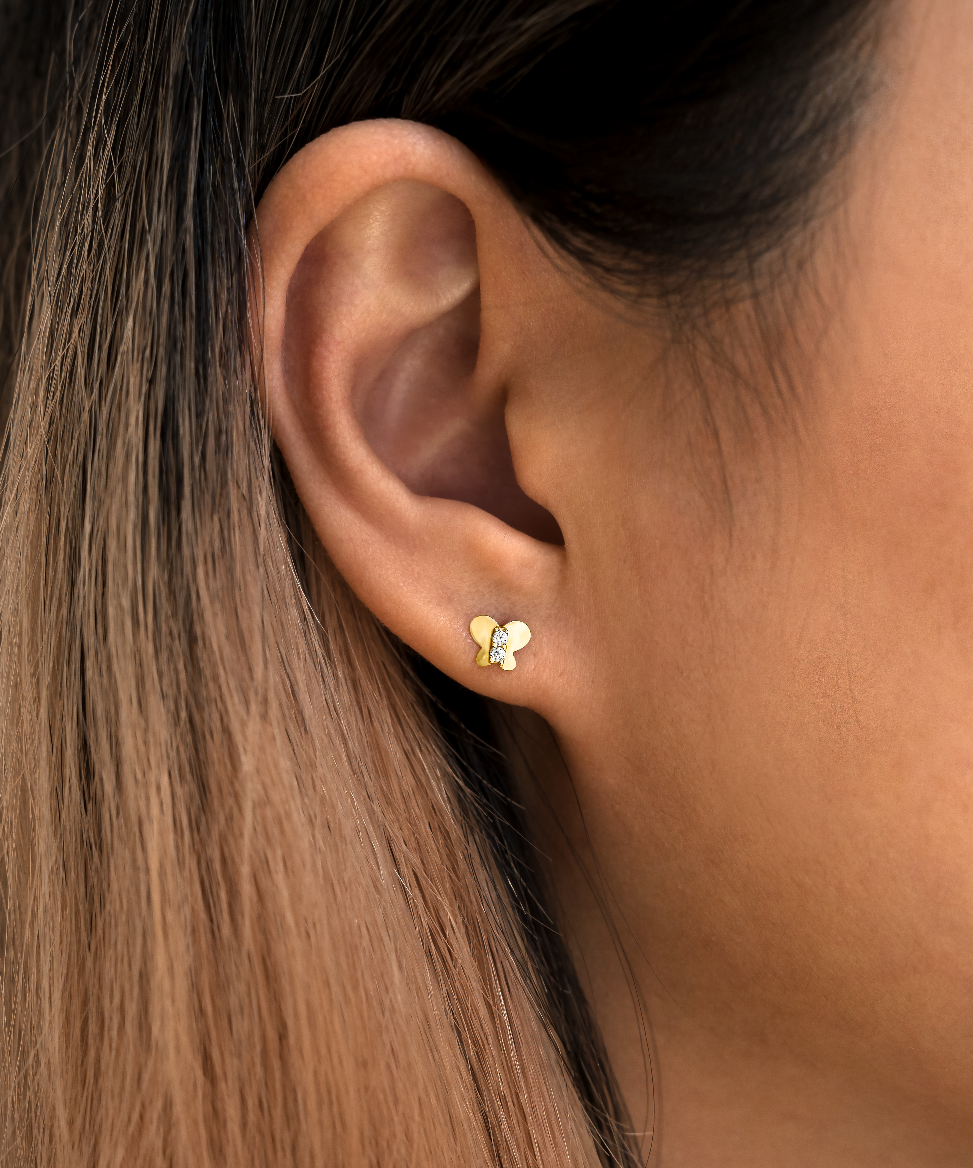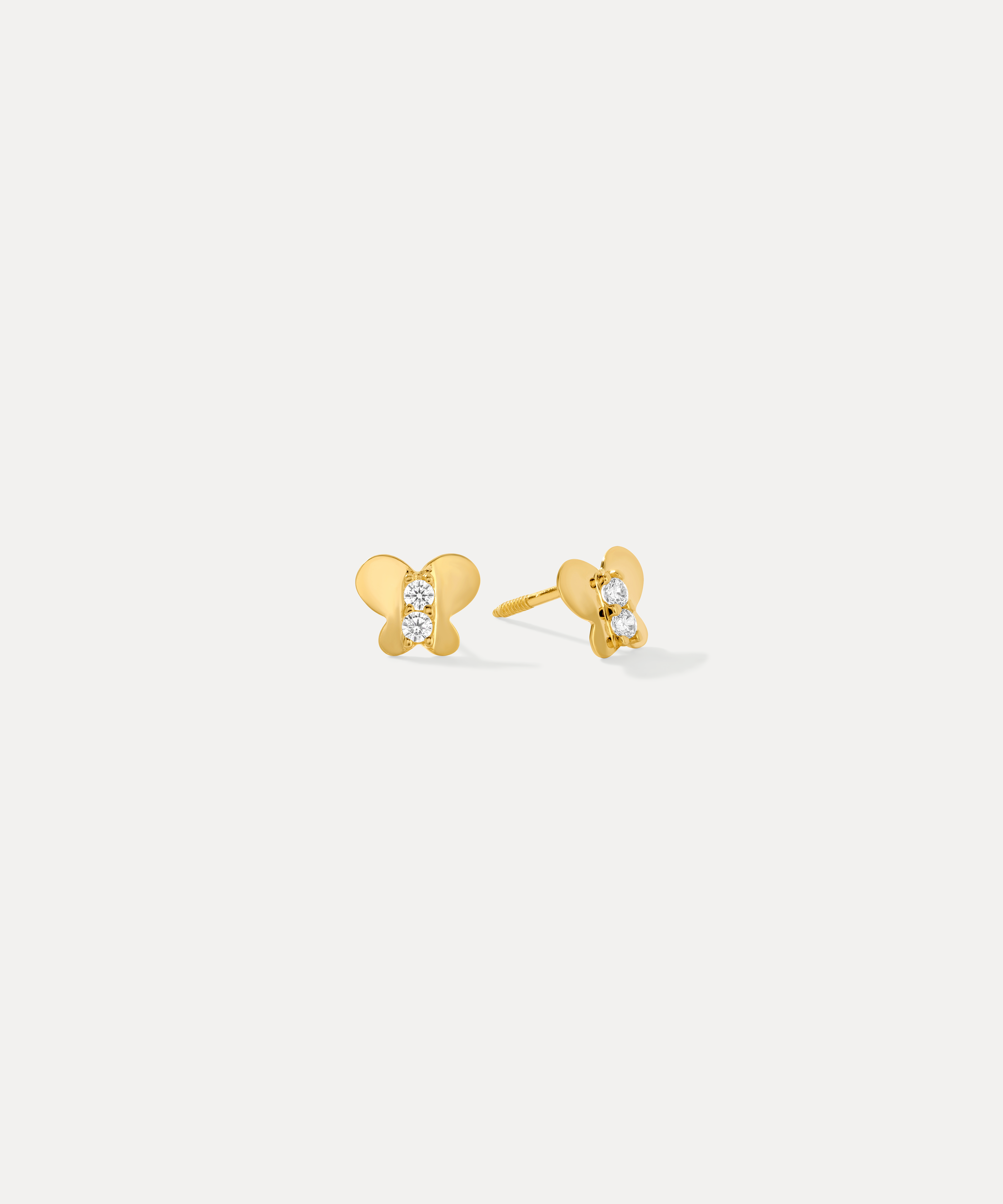 The Baby Butterfly Studs distill a favorite symbol down to its most charming form. Cast in solid 14k gold, their softly rounded wings are anchored by two brilliant white CZ stones. Finished with a secure threaded post for all-day comfort and shine.