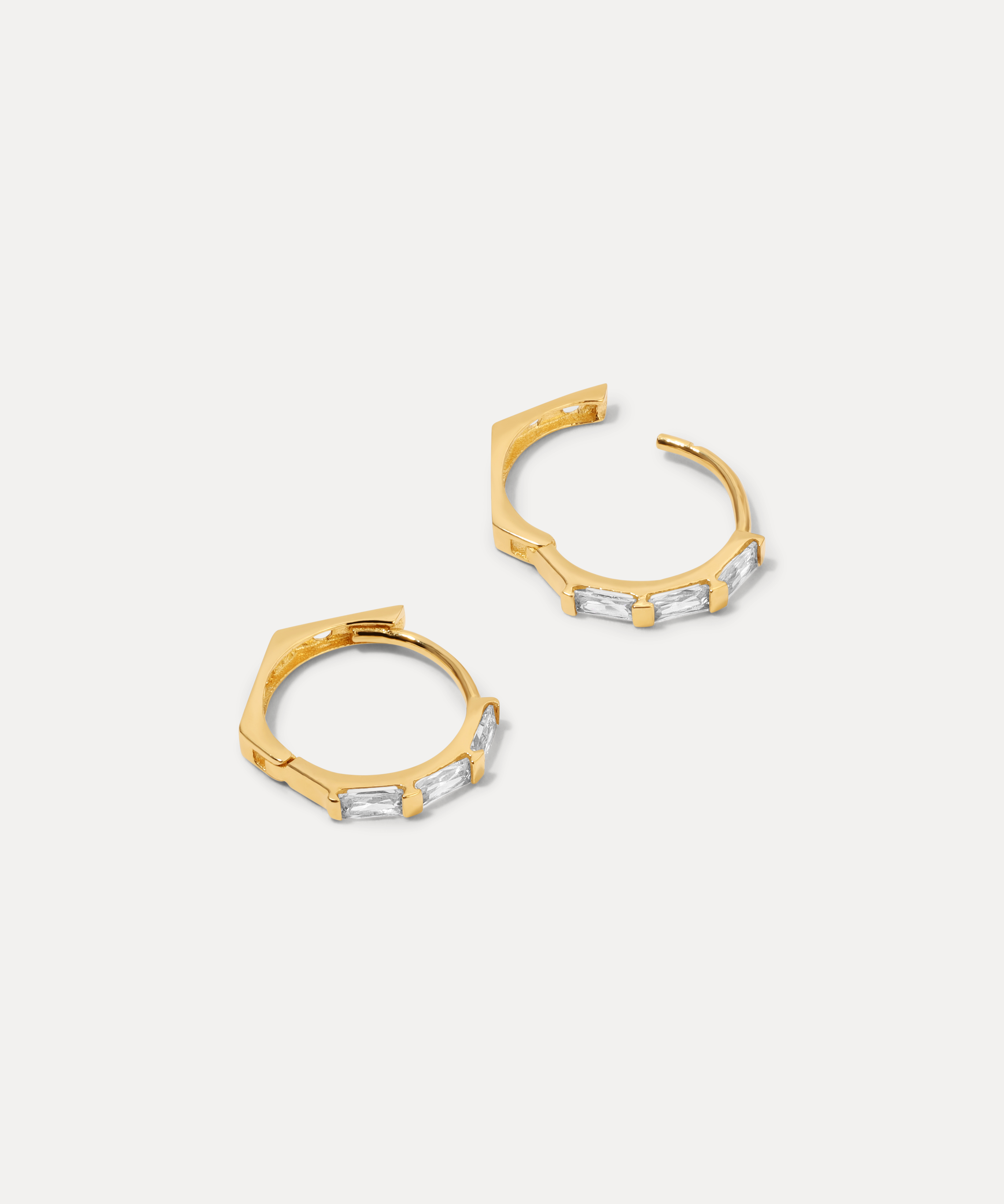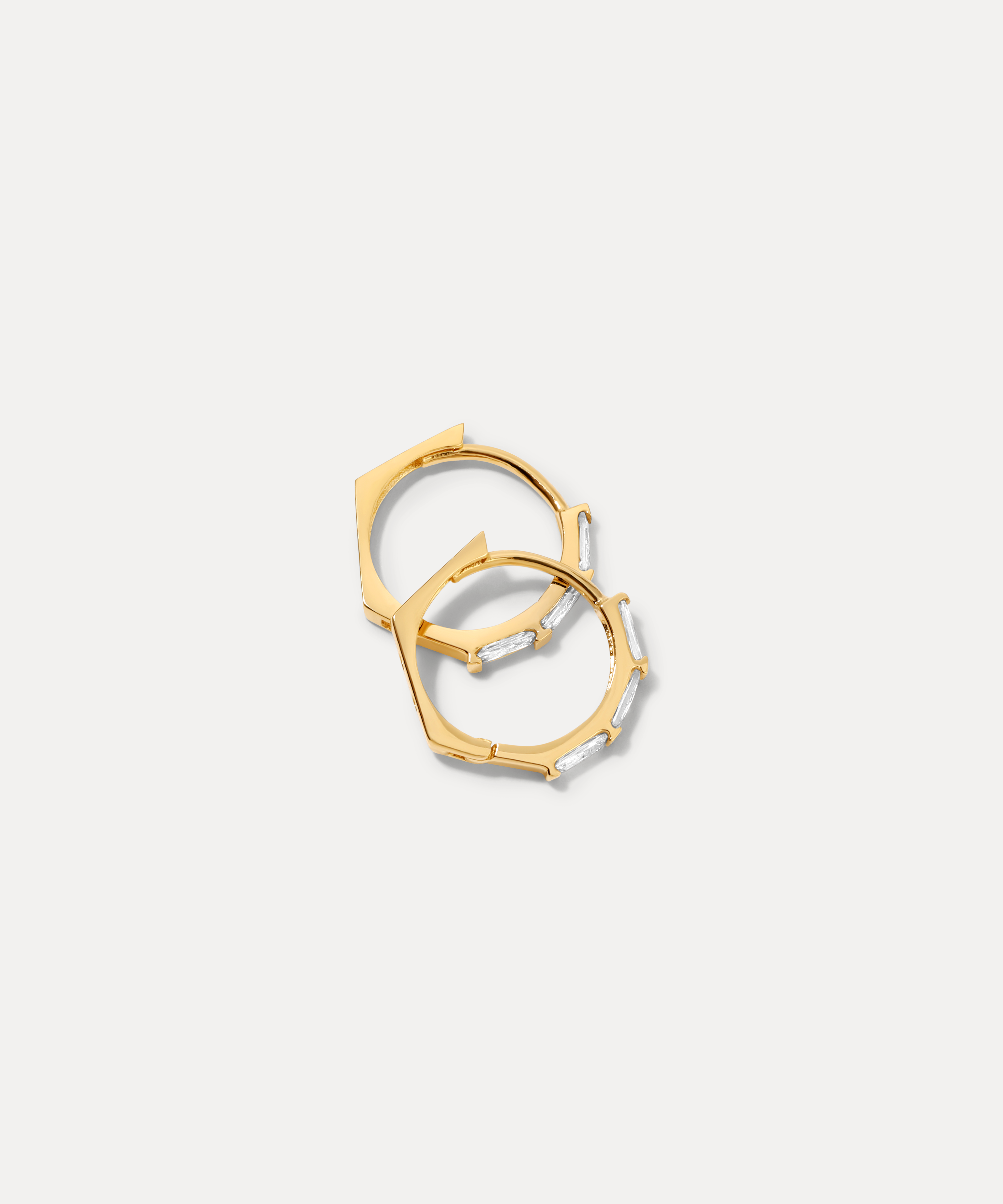 Crafted in solid 14k gold and set with a clean row of baguette-cut stones, these huggies deliver structured shine with a minimalist edge. Refined, modern, and endlessly stackable — they’re the kind of piece you’ll keep in rotation for years.