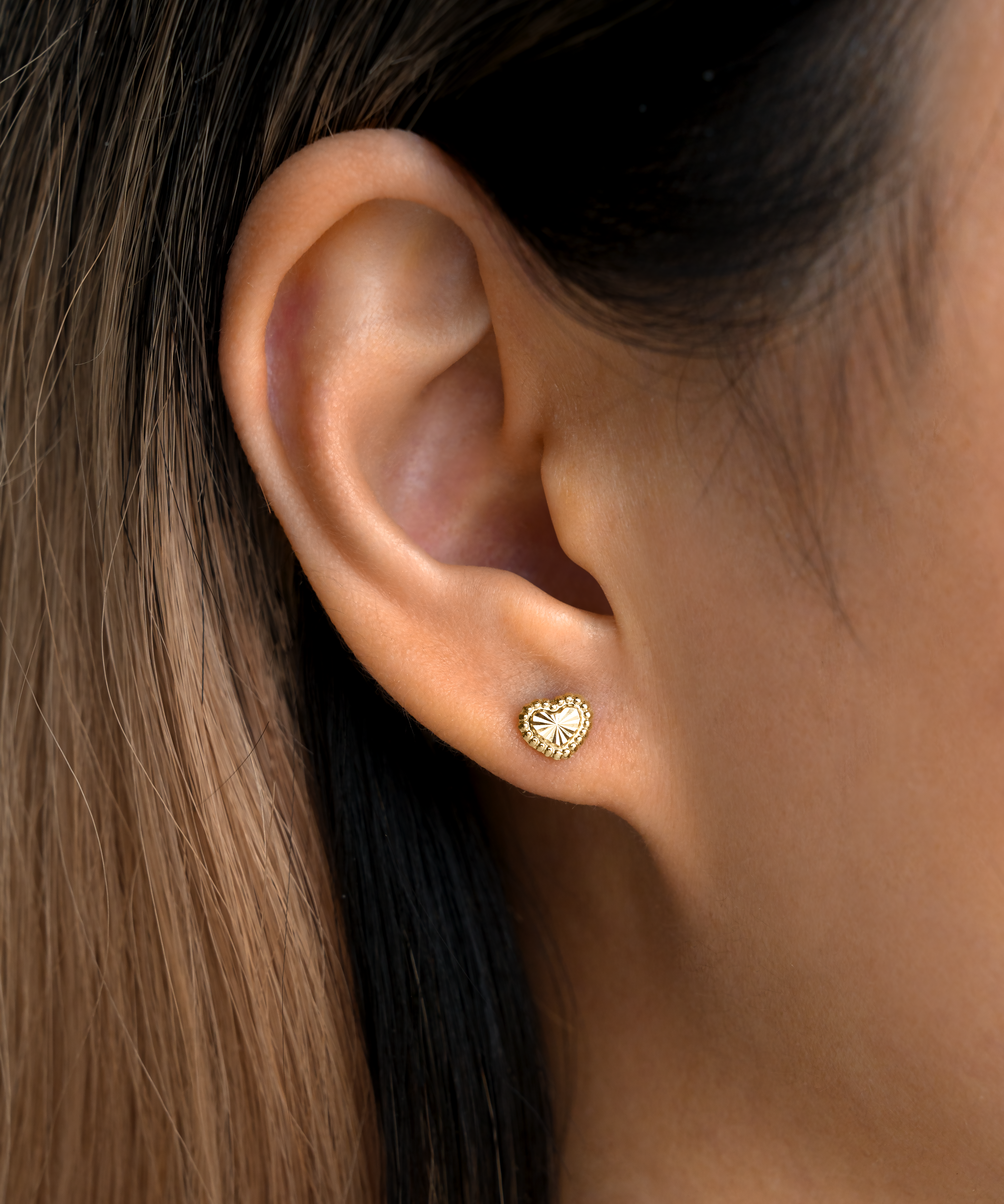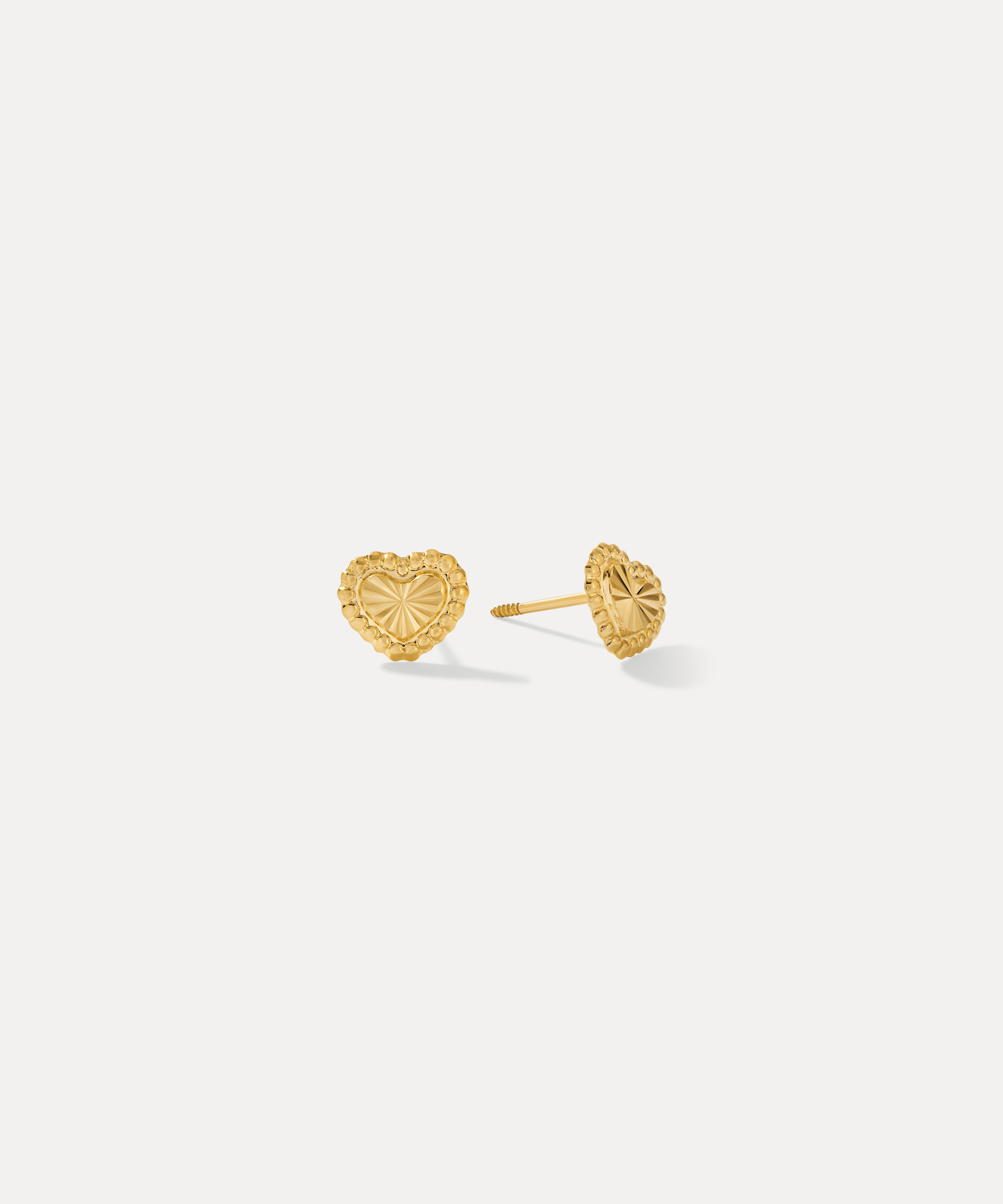 The Beaded Sunburst Heart Studs feature a radiant sunburst center framed by a delicate beaded edge — a sweet shape with sophisticated detail. Cast in solid 14k gold and finished with a secure threaded post, they’re perfect worn solo or paired with an ear cuff for an easy, everyday stack.