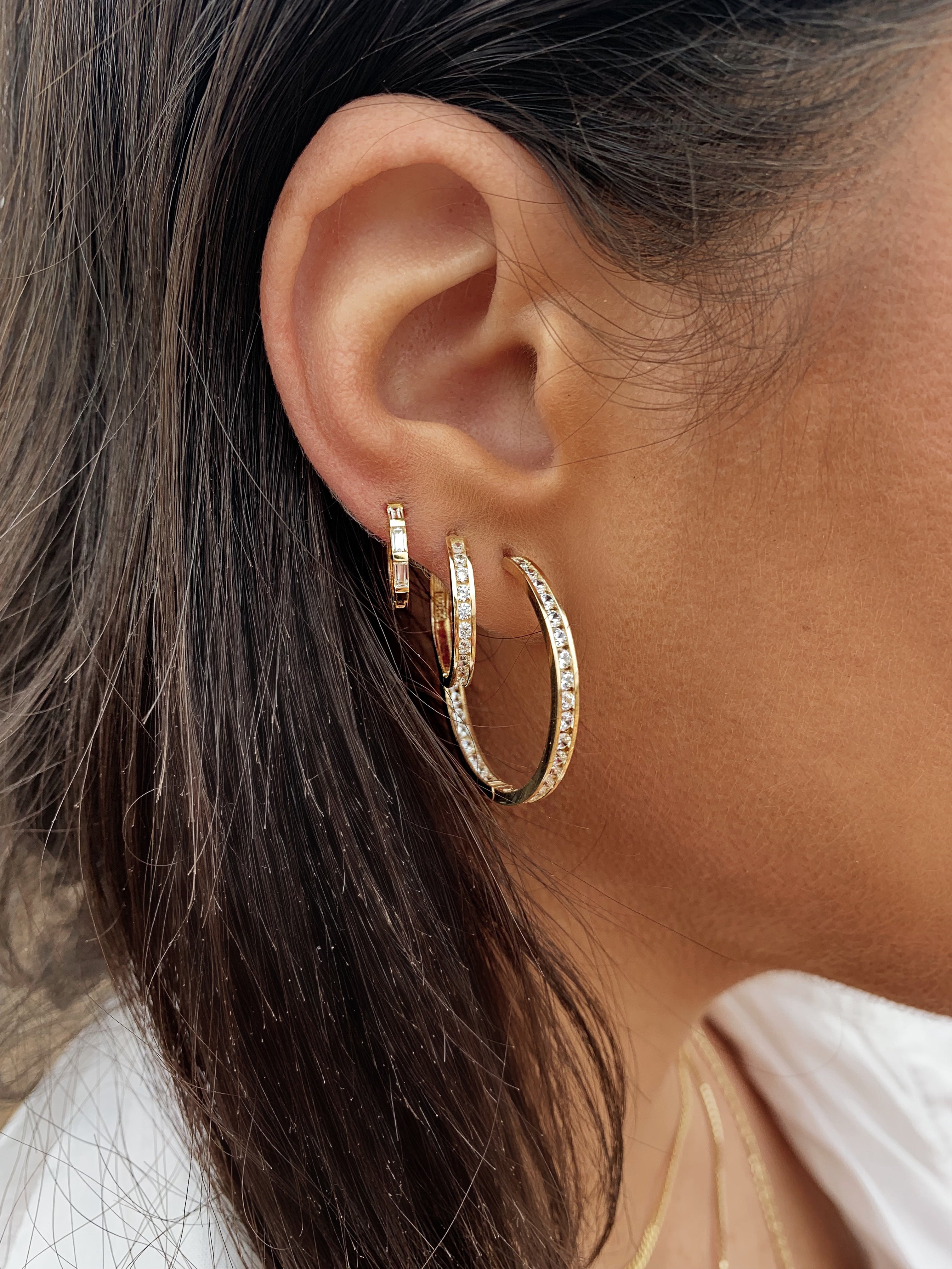 Geometry, softened by shine. The Demi Channel Hoops feature a row of pavé-set stones along the front, framed by raised channel walls that add depth and structure. A half-eternity layout keeps the profile clean, while the 14k gold and high-polish finish let them transition seamlessly from everyday to elevated.