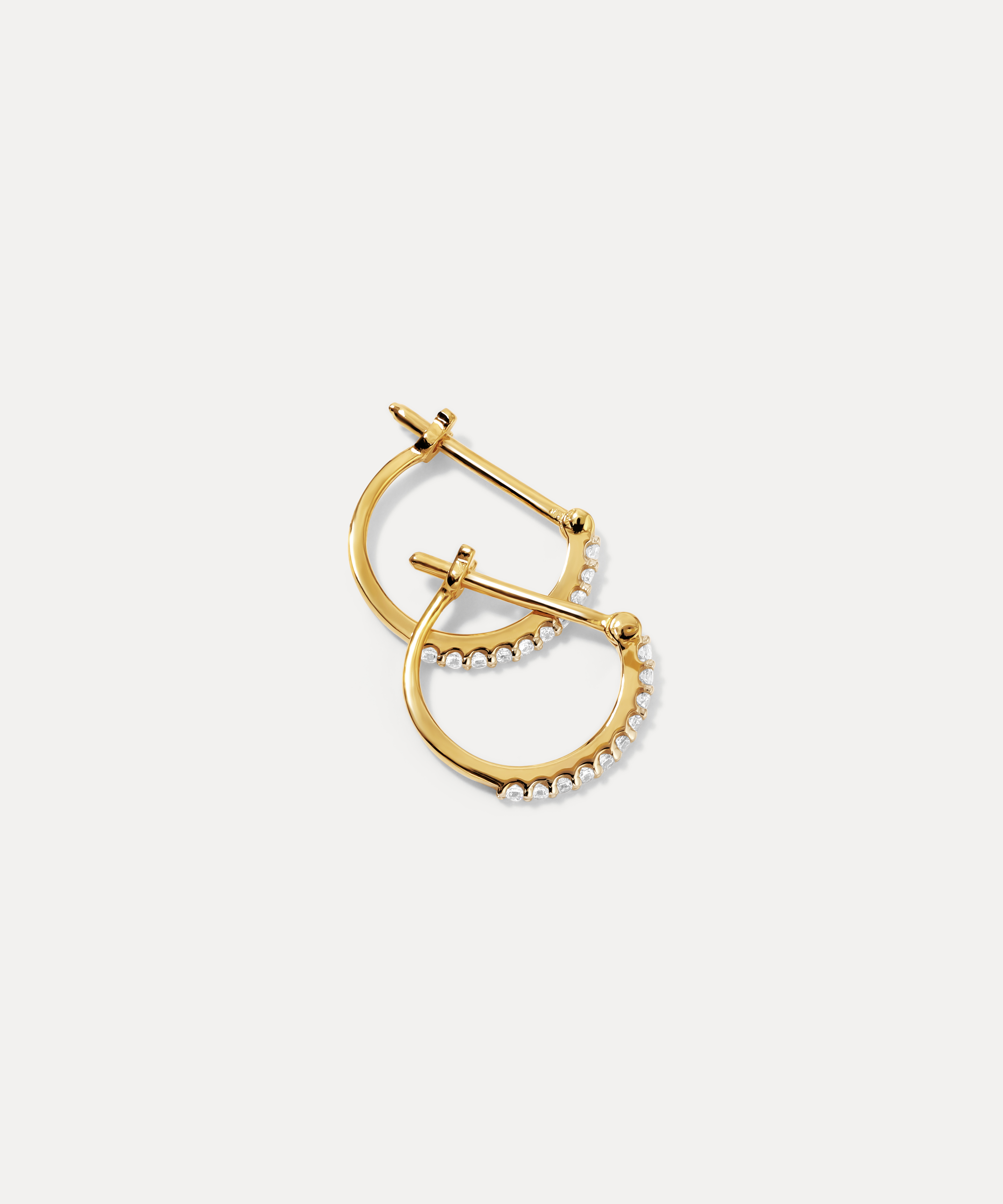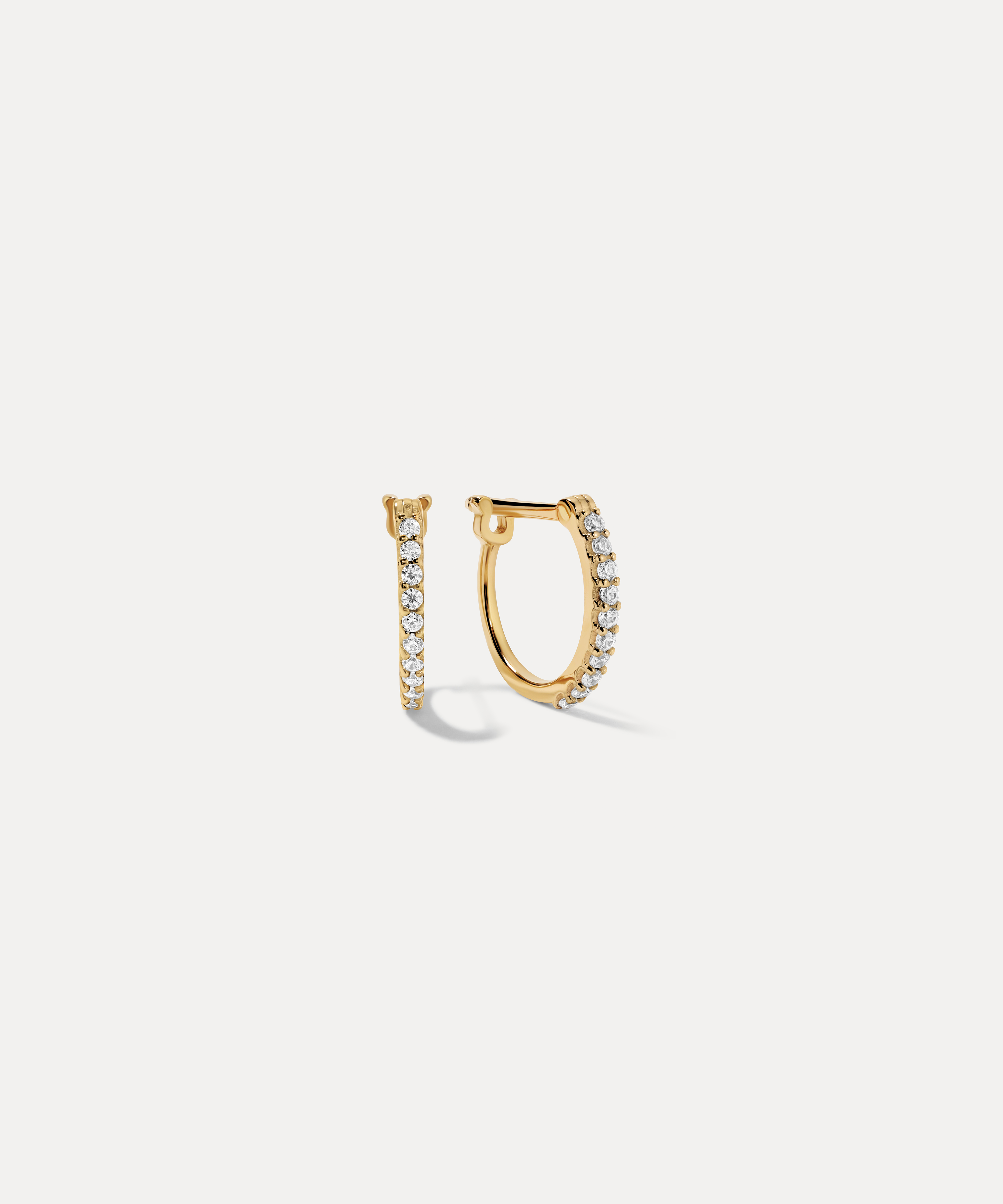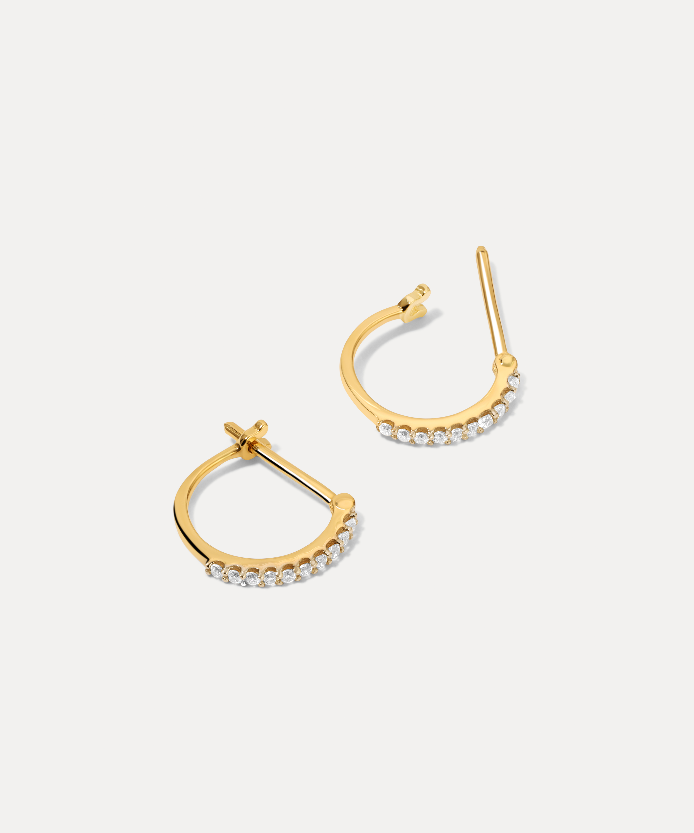 Designed to hug the ear with ease, the Demi Pavé Huggies bring just enough sparkle to elevate your everyday. A row of pavé-set white CZ gemstones lines the front half, offering understated shine without overwhelming your look. With a snug fit and secure latch back, these are low-maintenance, high-impact essentials.