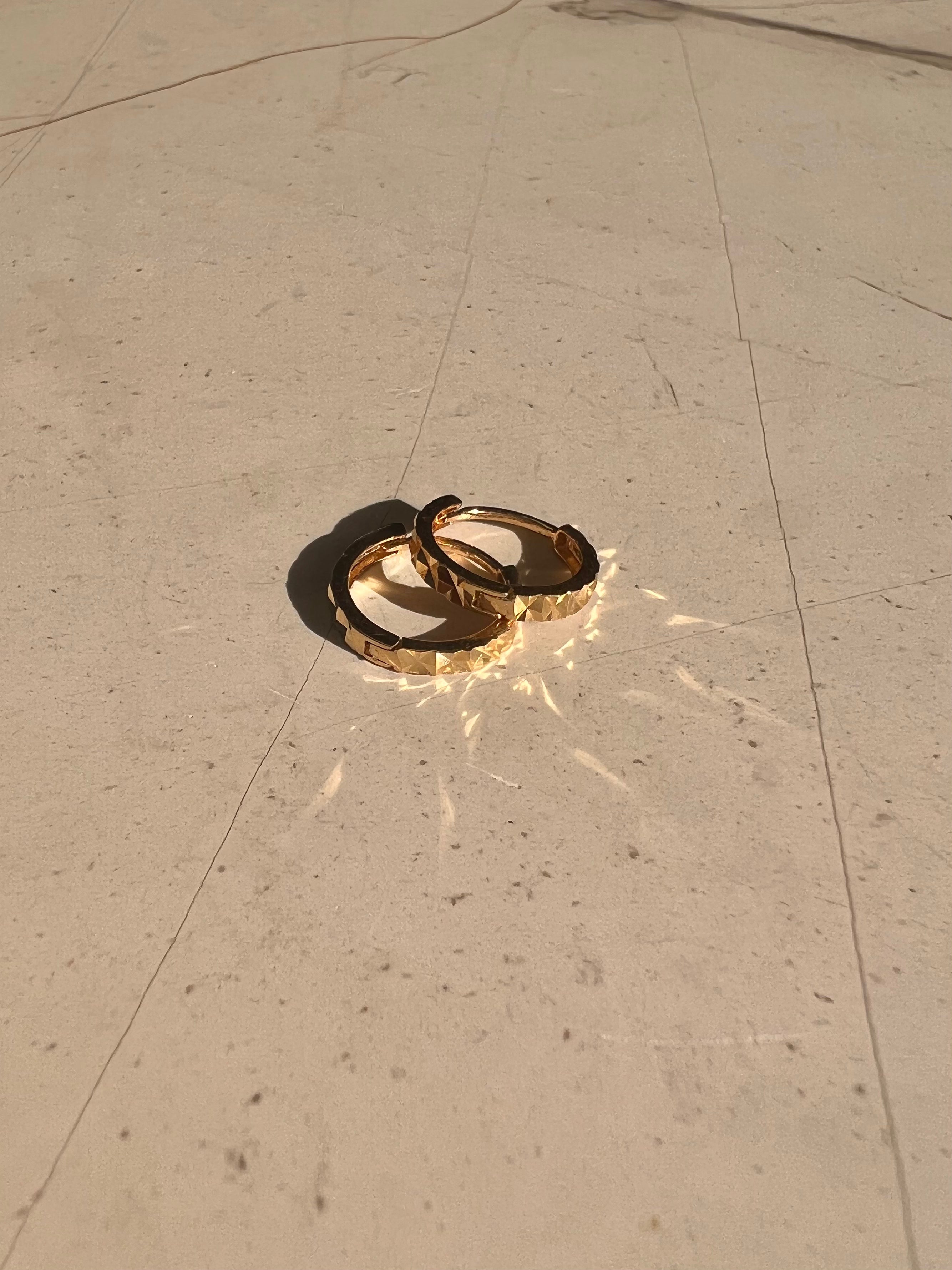 These are not your average huggies. With a faceted, diamond-cut surface carved into a subtle checkerboard pattern, each angle is designed to reflect light — creating a striking, mirror-like shine that turns heads with every movement.