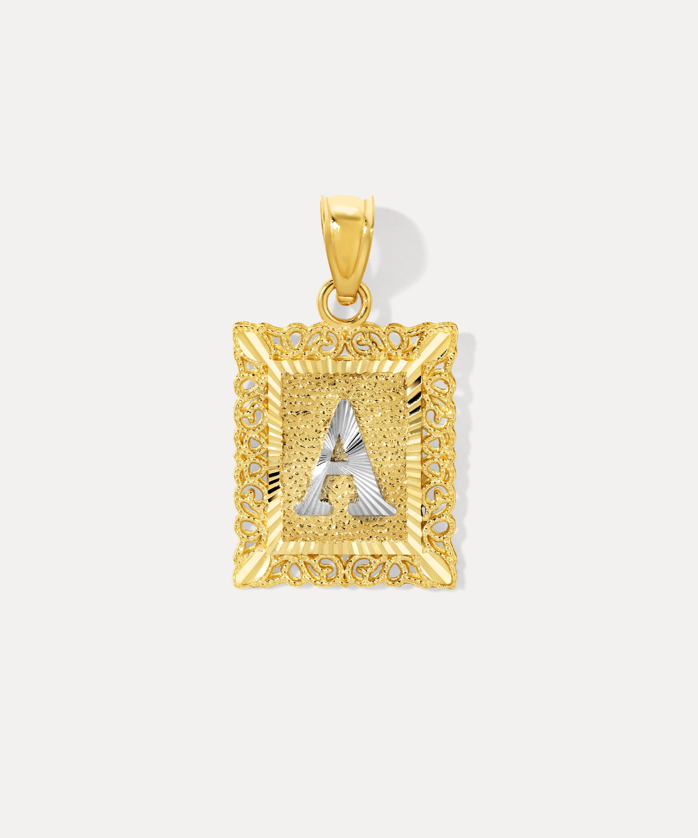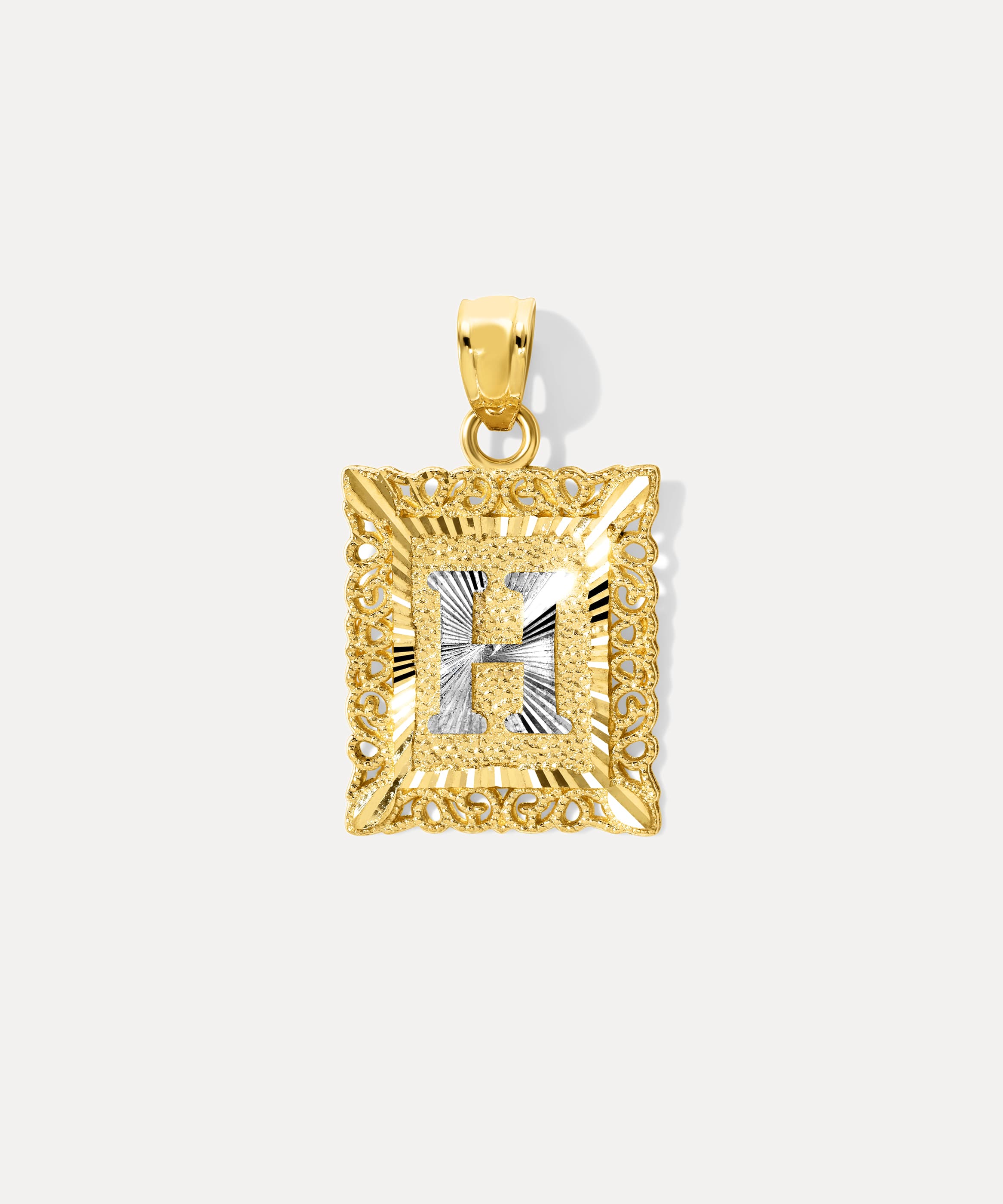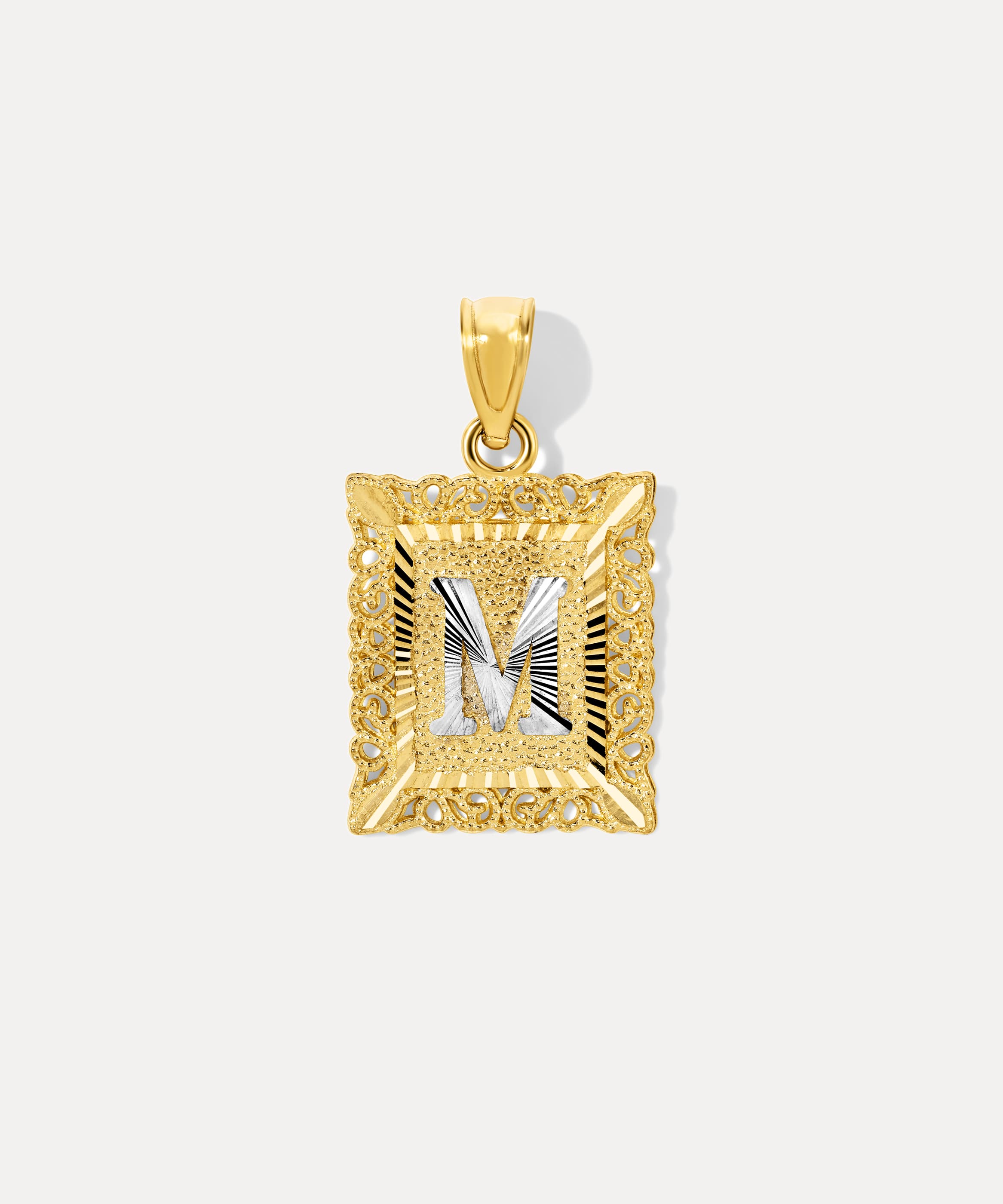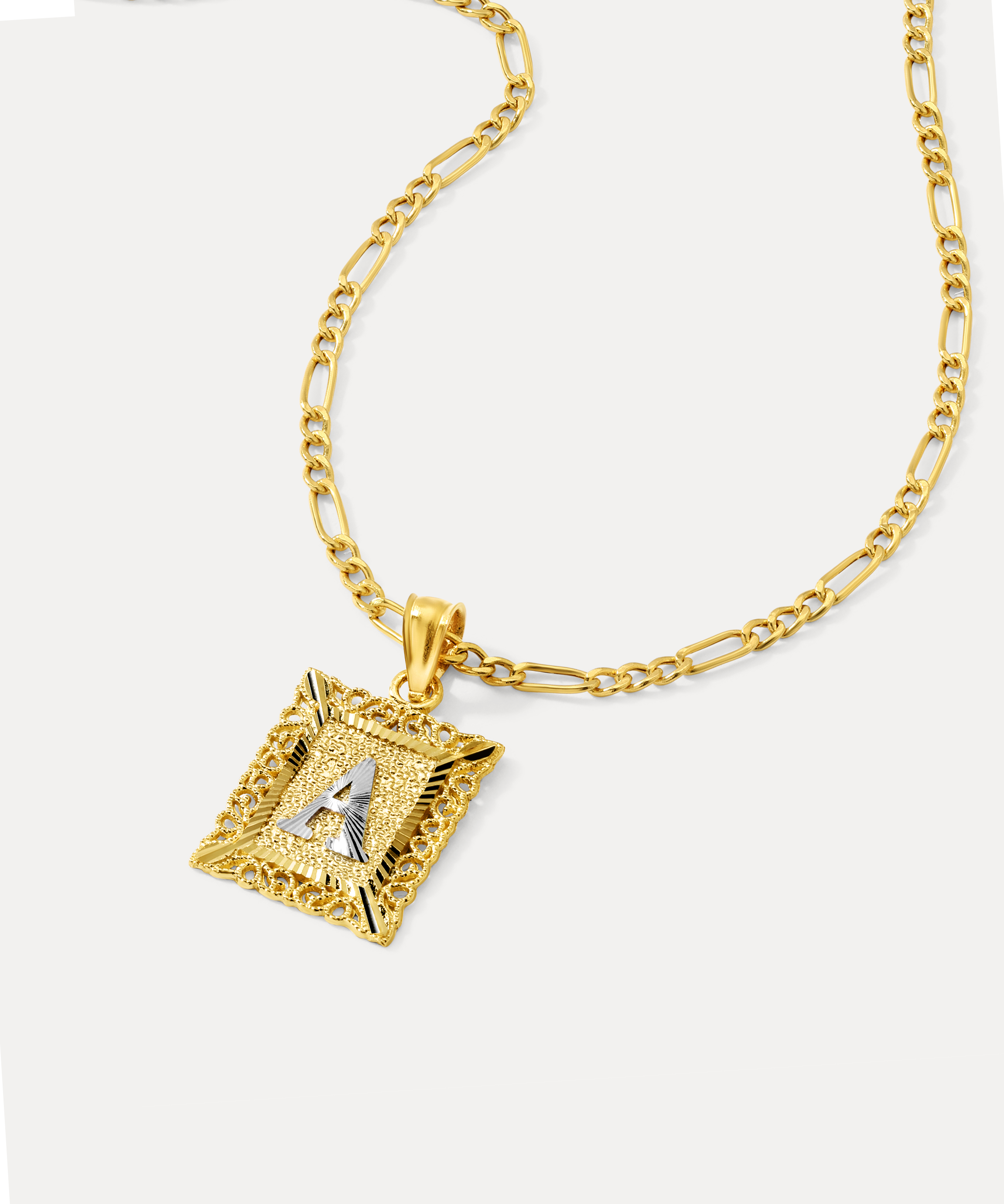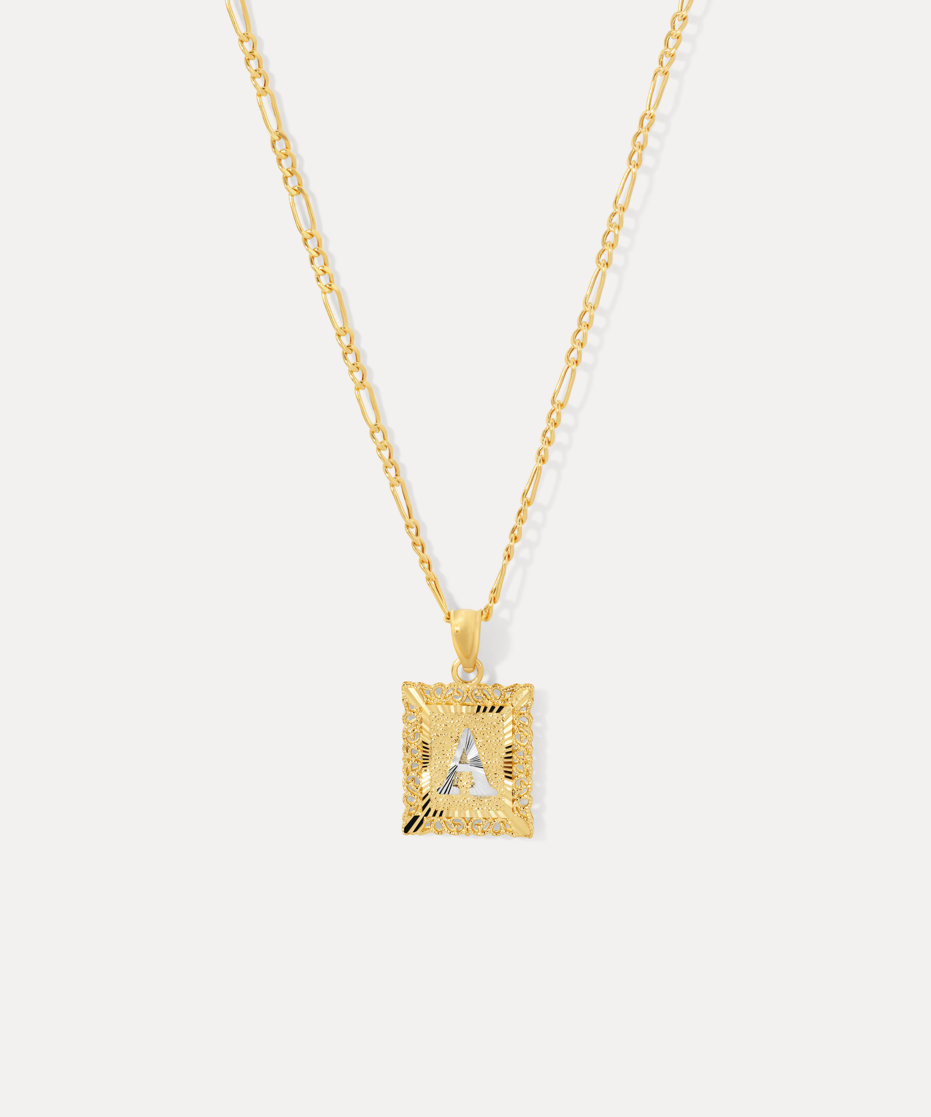This personalized necklace features your chosen initial in white gold, set within a square 14k gold frame. Intricate scrollwork and a hammered, radiant-pattern background add vintage texture and shine. Paired with our Small Figaro Chain, it’s a signature piece with heirloom energy.