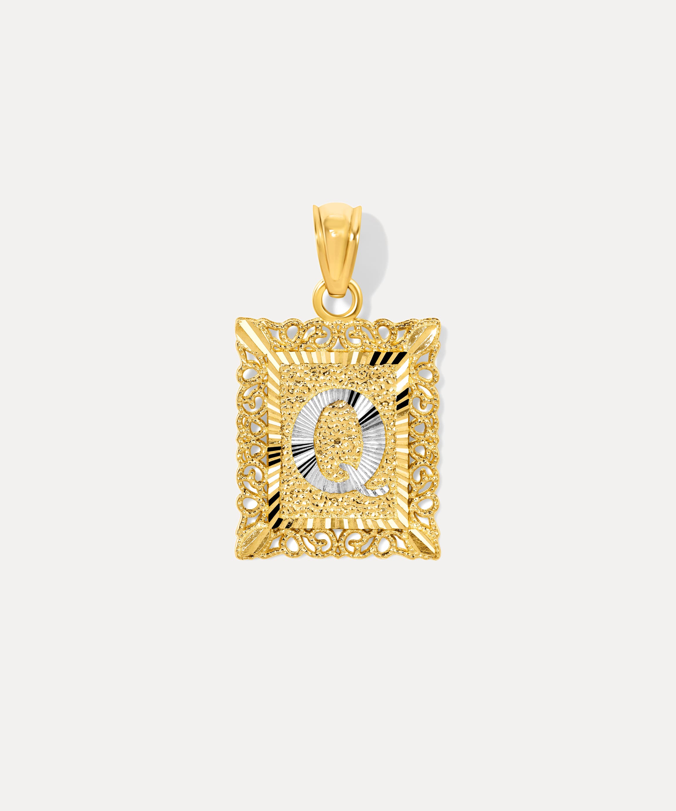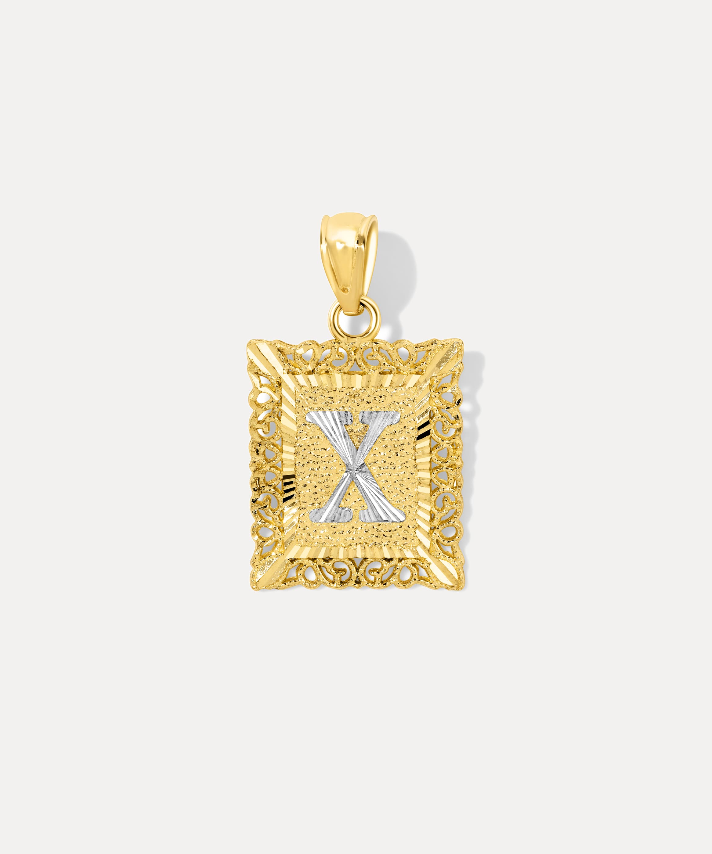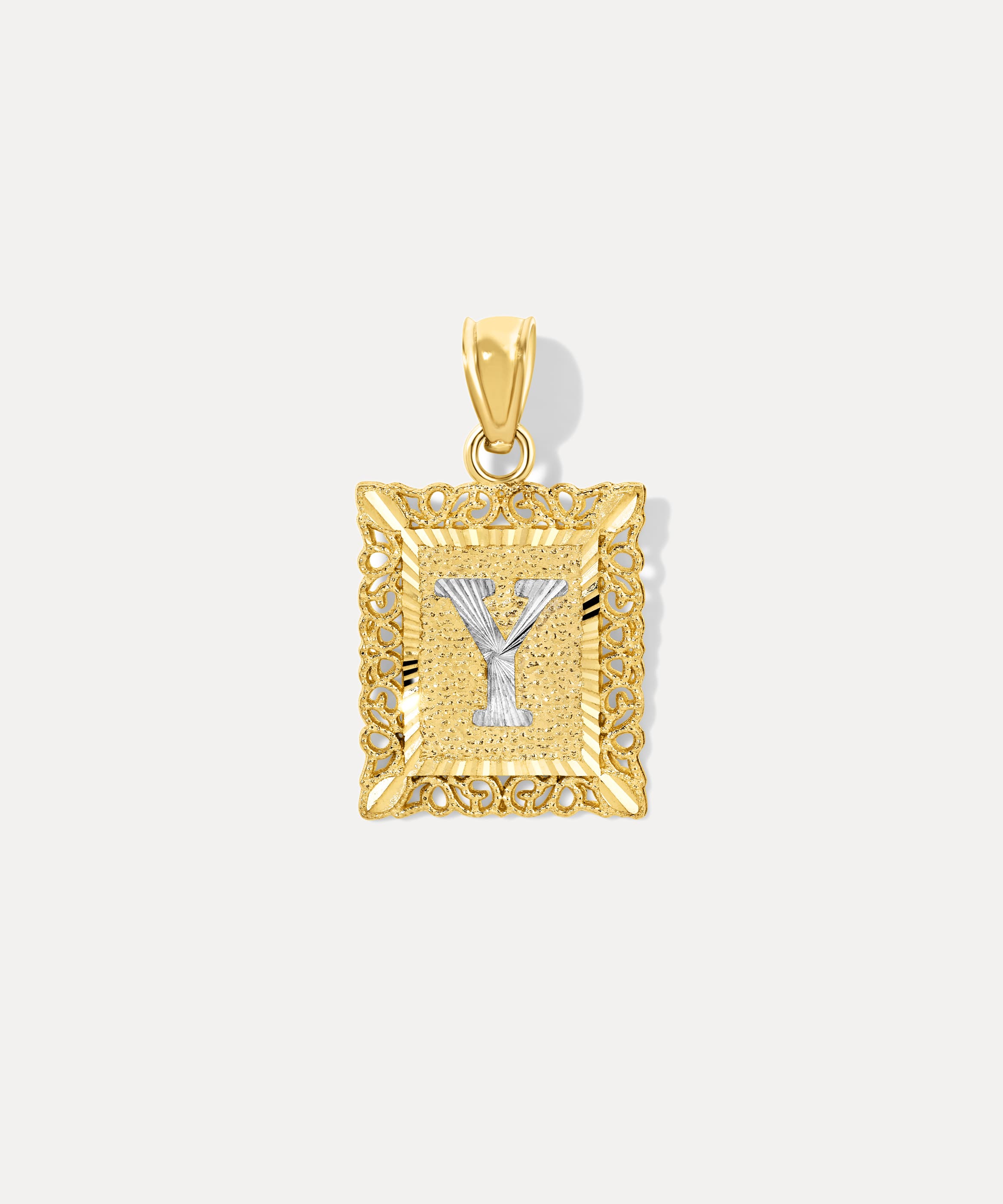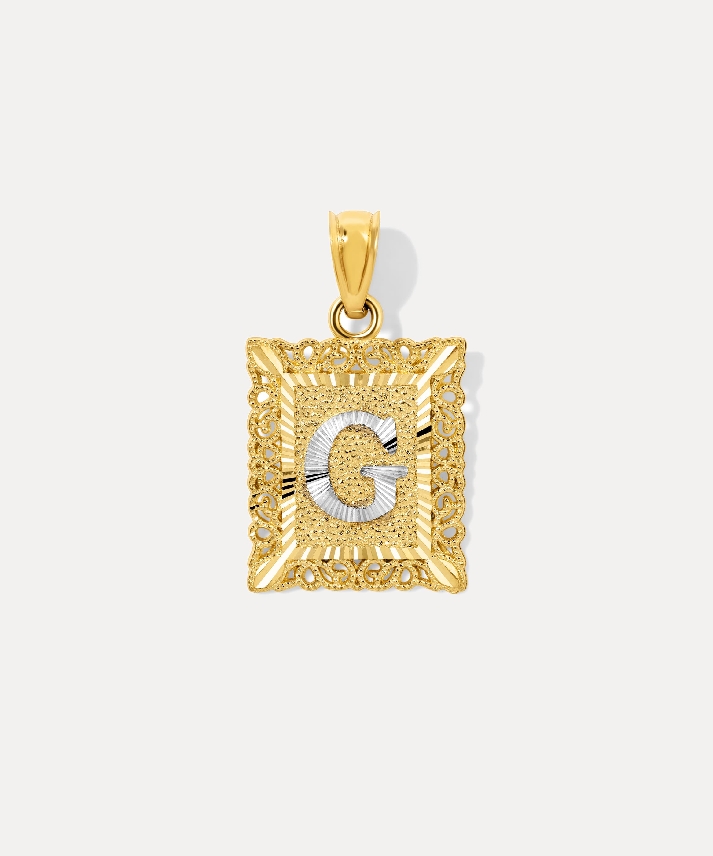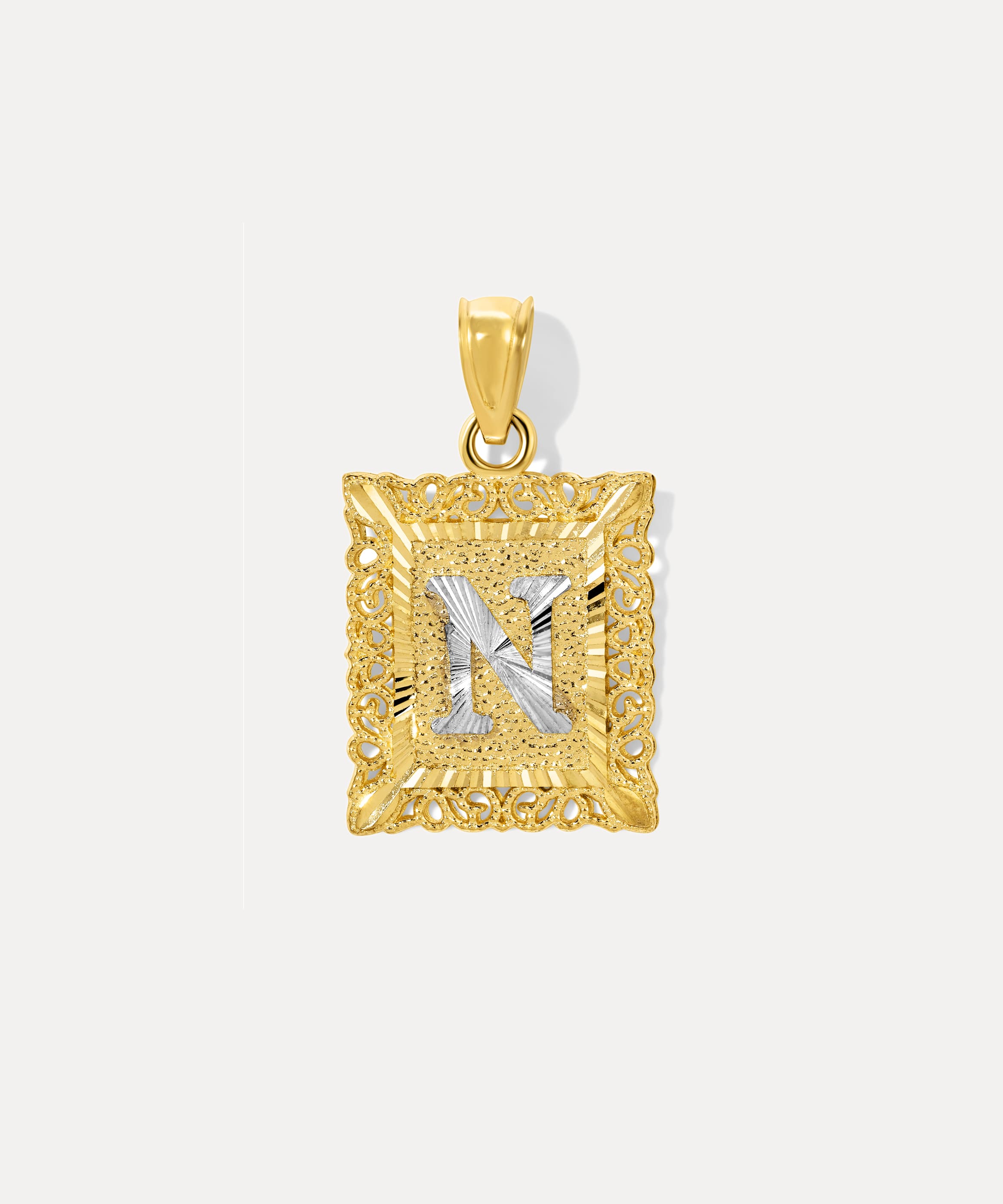 This personalized necklace features your chosen initial in white gold, set within a square 14k gold frame. Intricate scrollwork and a hammered, radiant-pattern background add vintage texture and shine. Paired with our Small Figaro Chain, it’s a signature piece with heirloom energy.