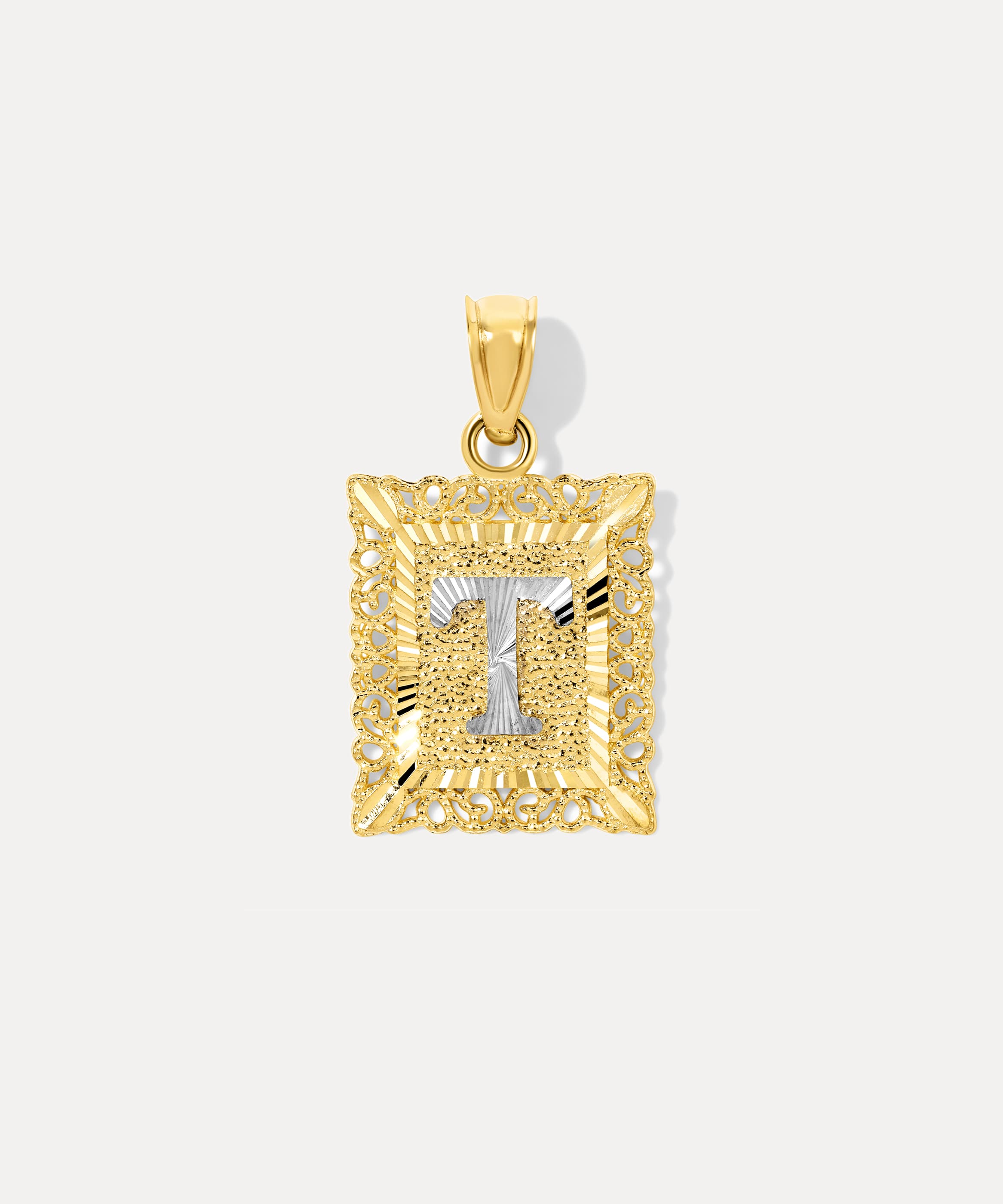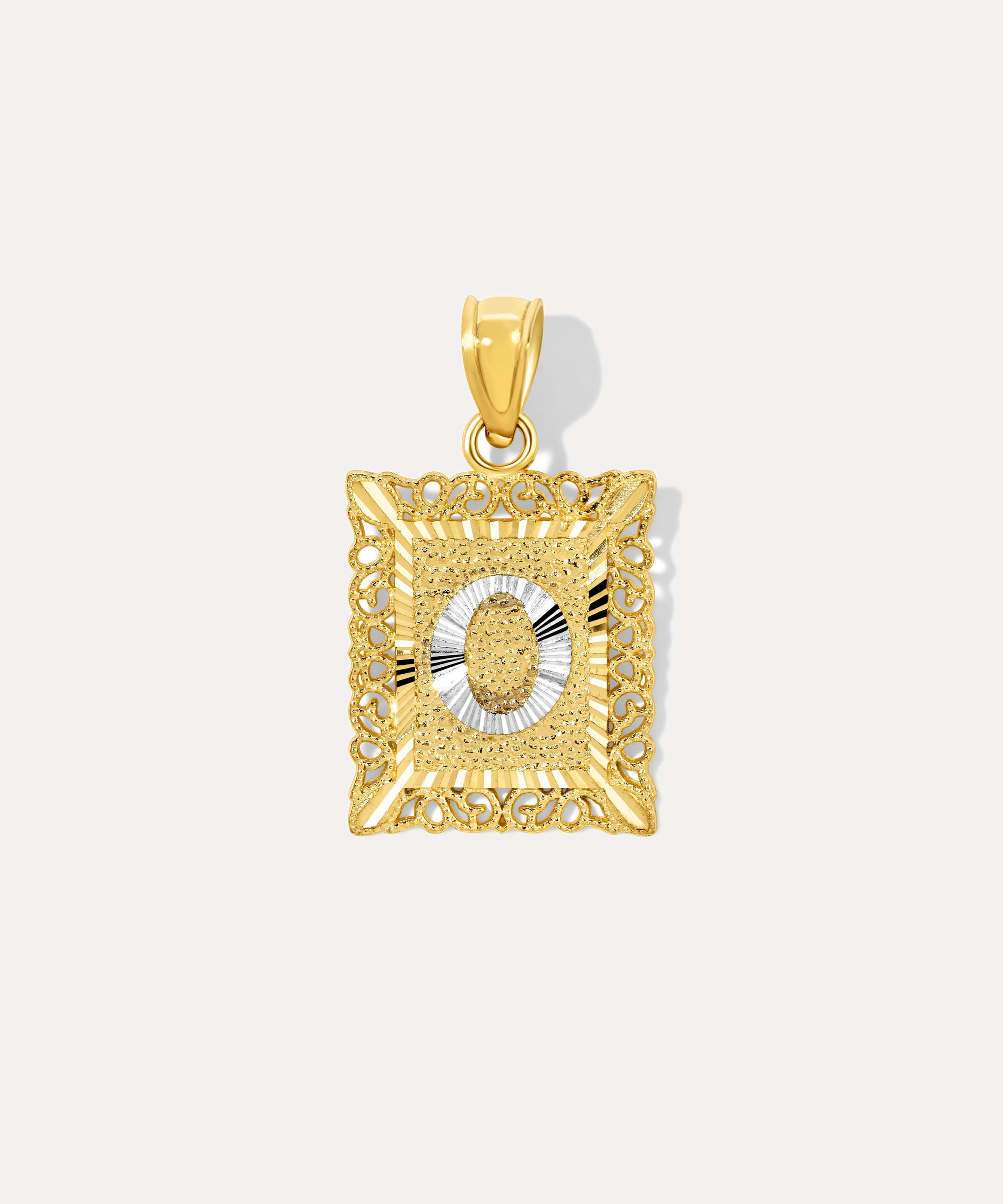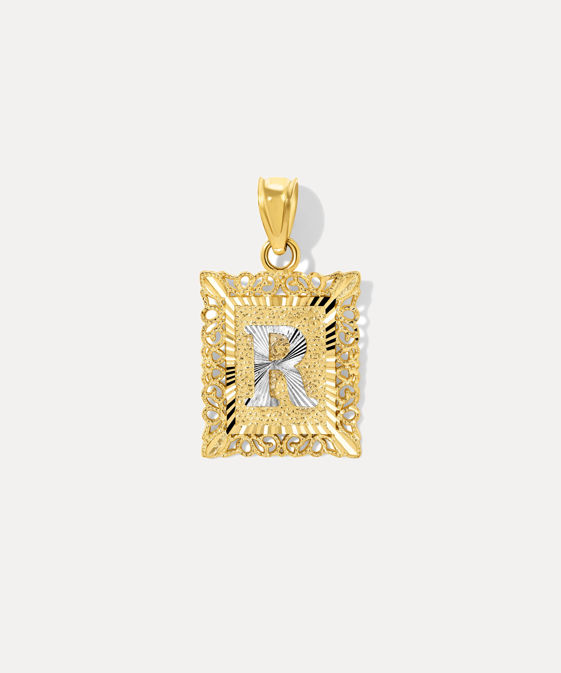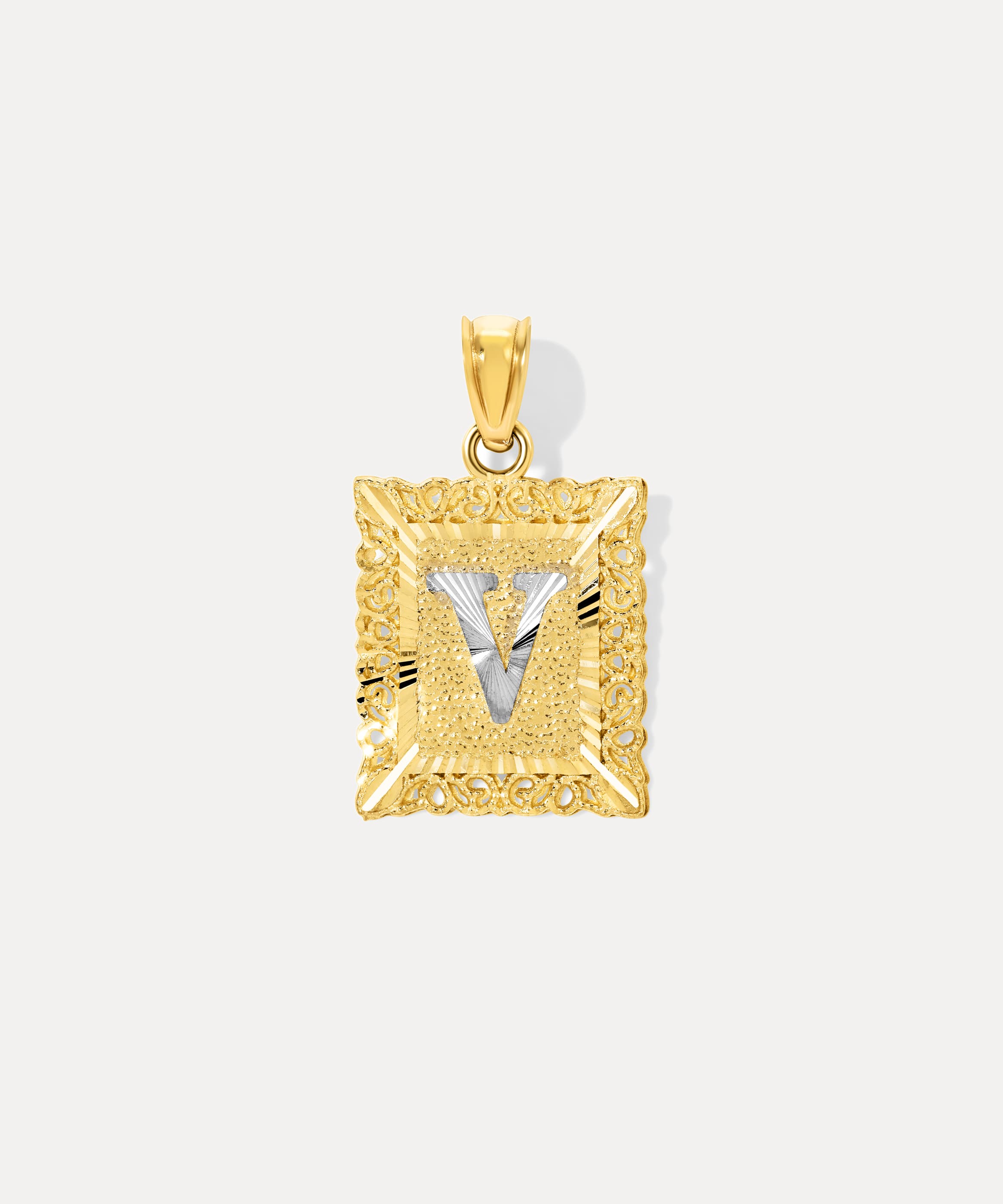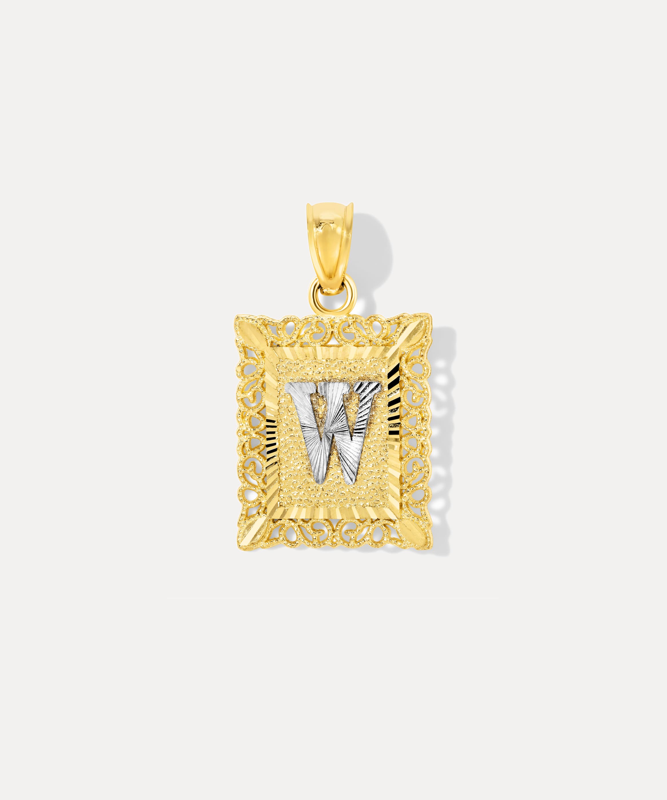 This personalized necklace features your chosen initial in white gold, set within a square 14k gold frame. Intricate scrollwork and a hammered, radiant-pattern background add vintage texture and shine. Paired with our Small Figaro Chain, it’s a signature piece with heirloom energy.