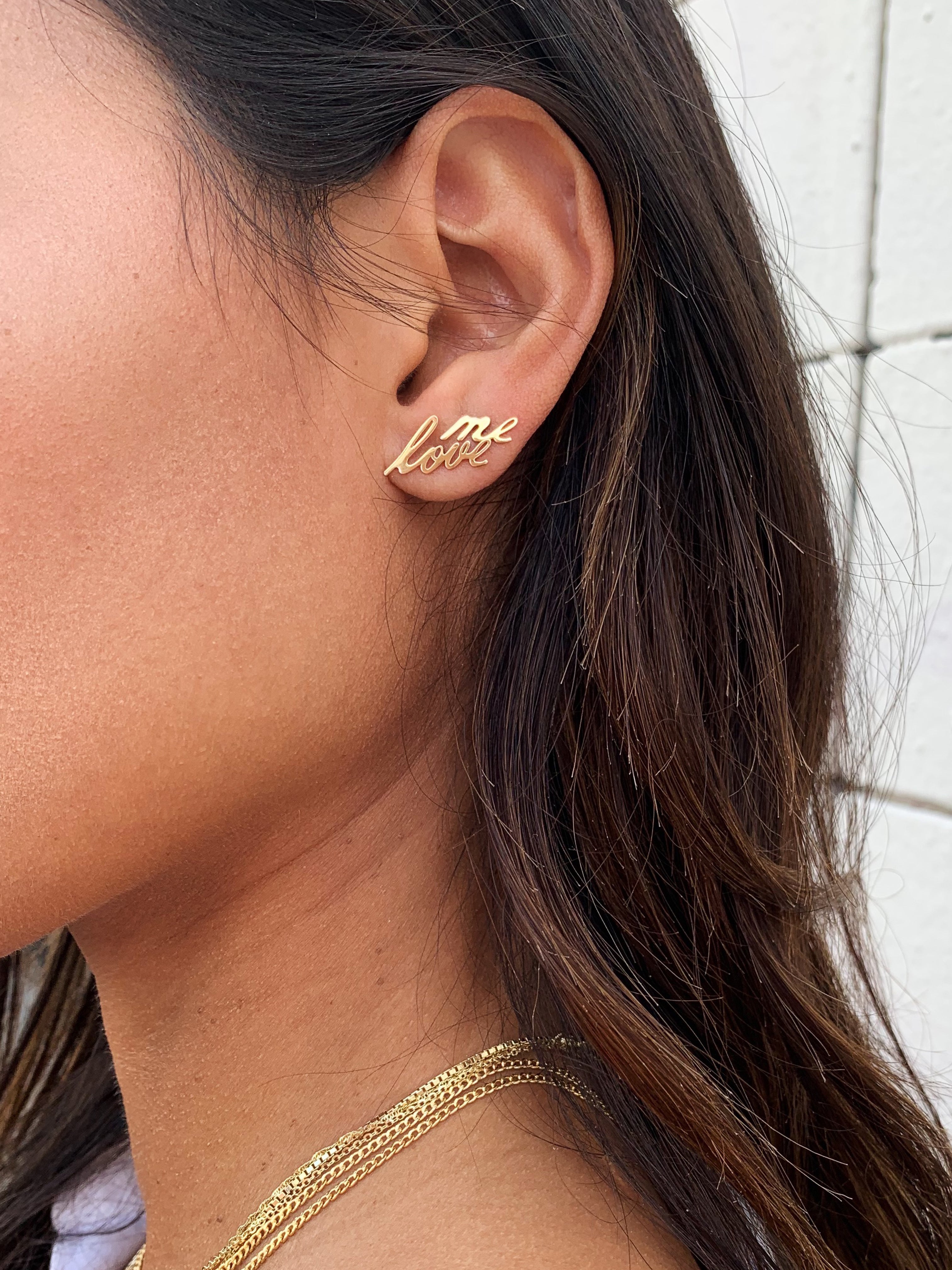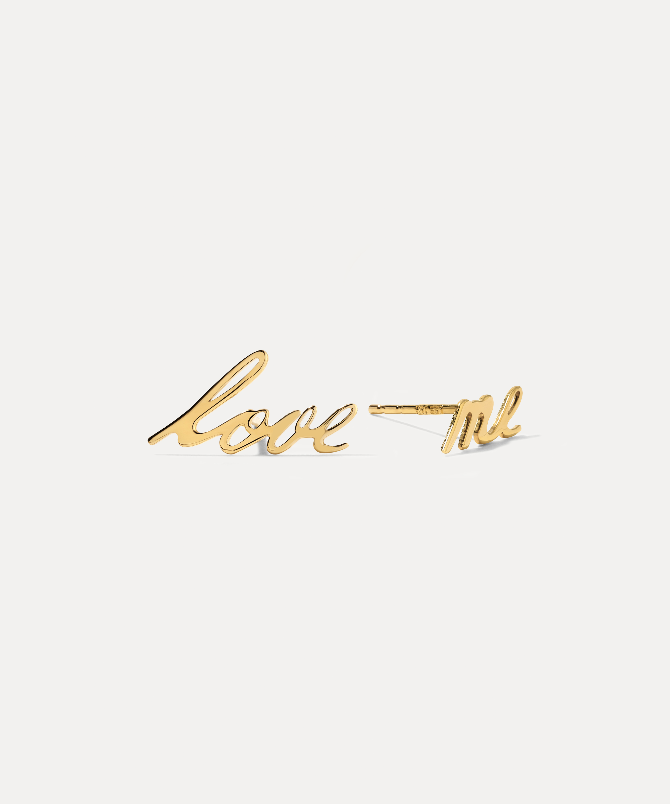 The Love Me Studs spell out “love” and “me” in a cursive typeface — designed to be styled your way. Wear one on each ear or stack both on the same ear for full effect. Cast in solid 14k gold and polished to a mirror shine, they’re a playful, feel-good gift (especially if you're gifting yourself).