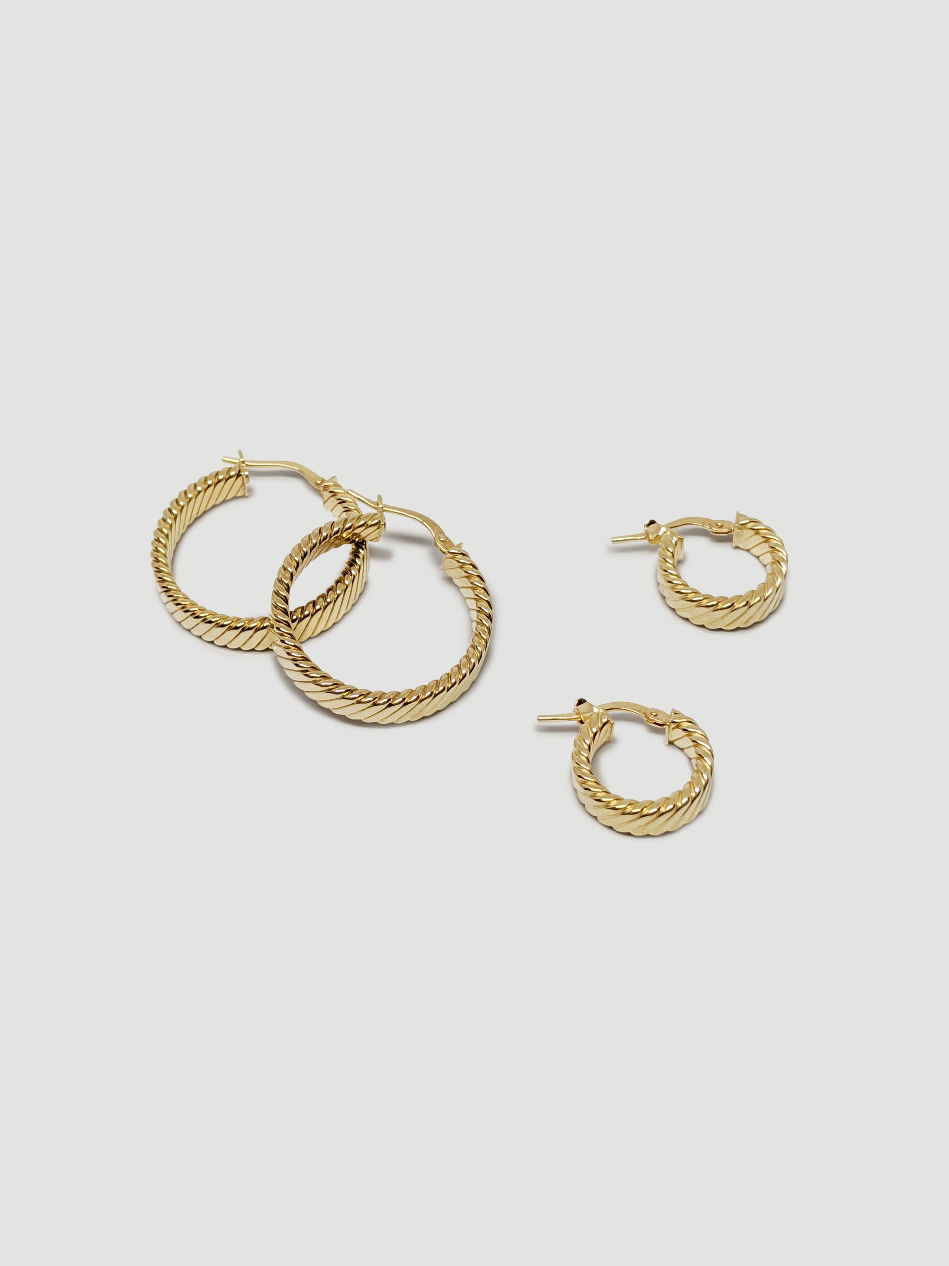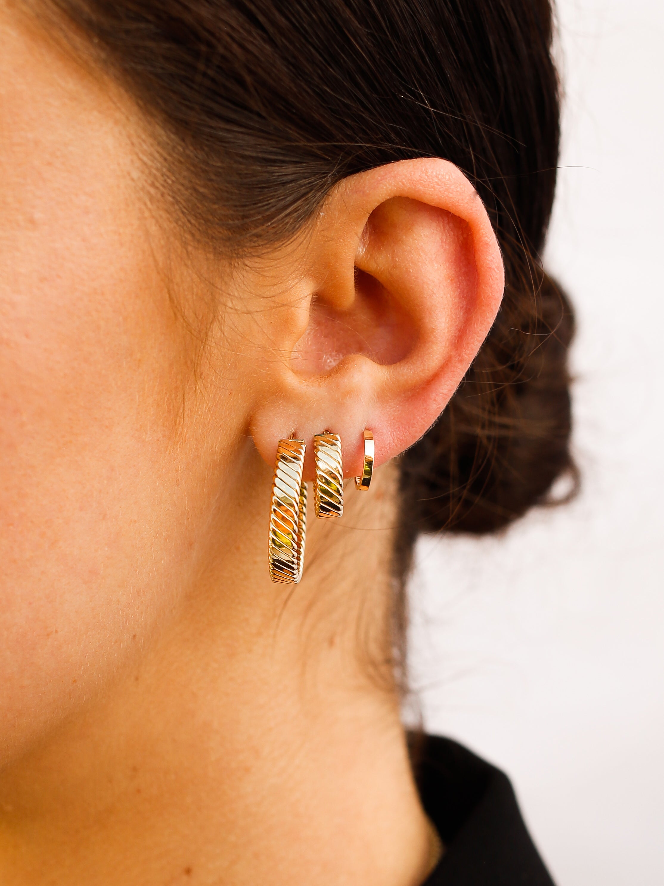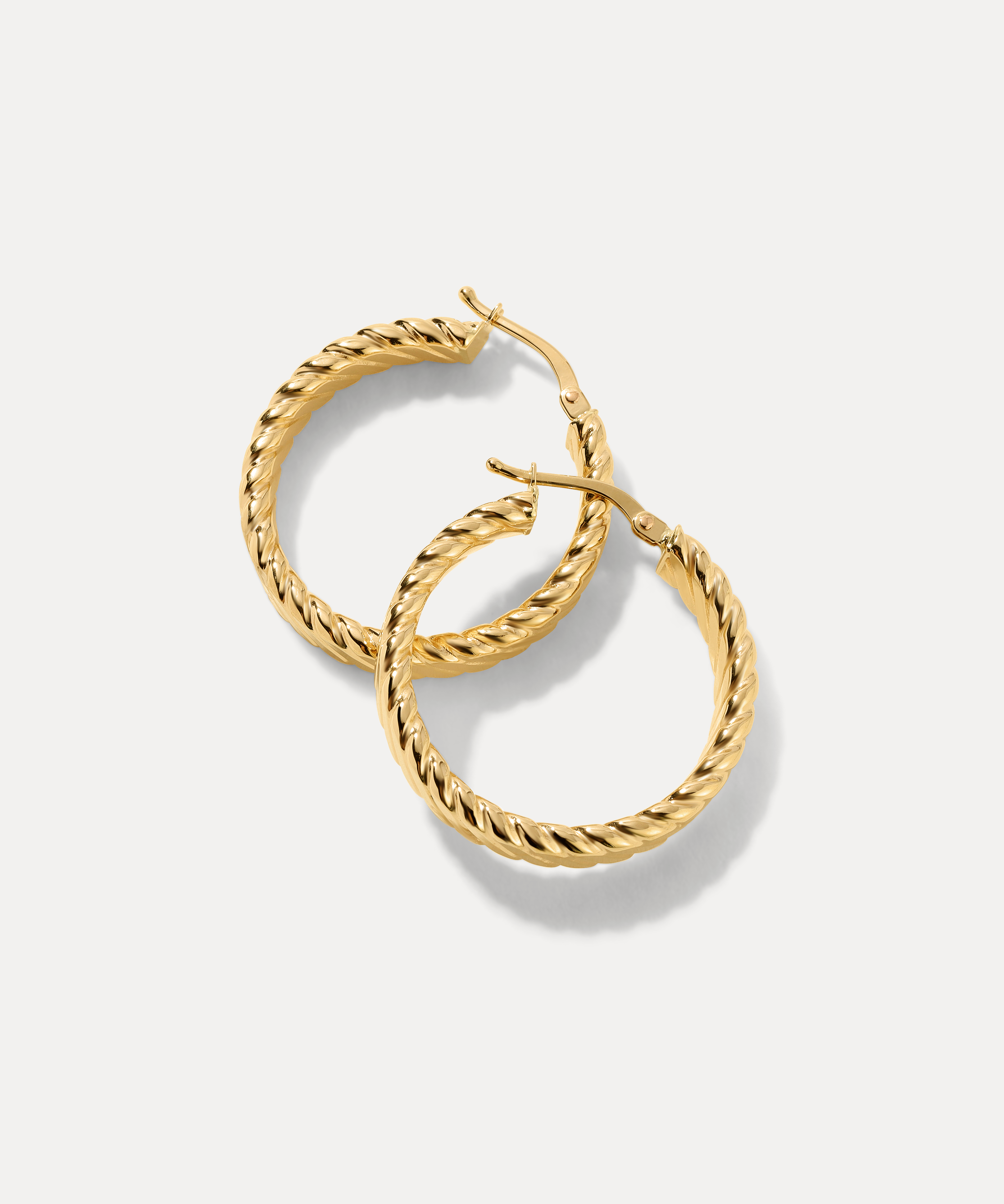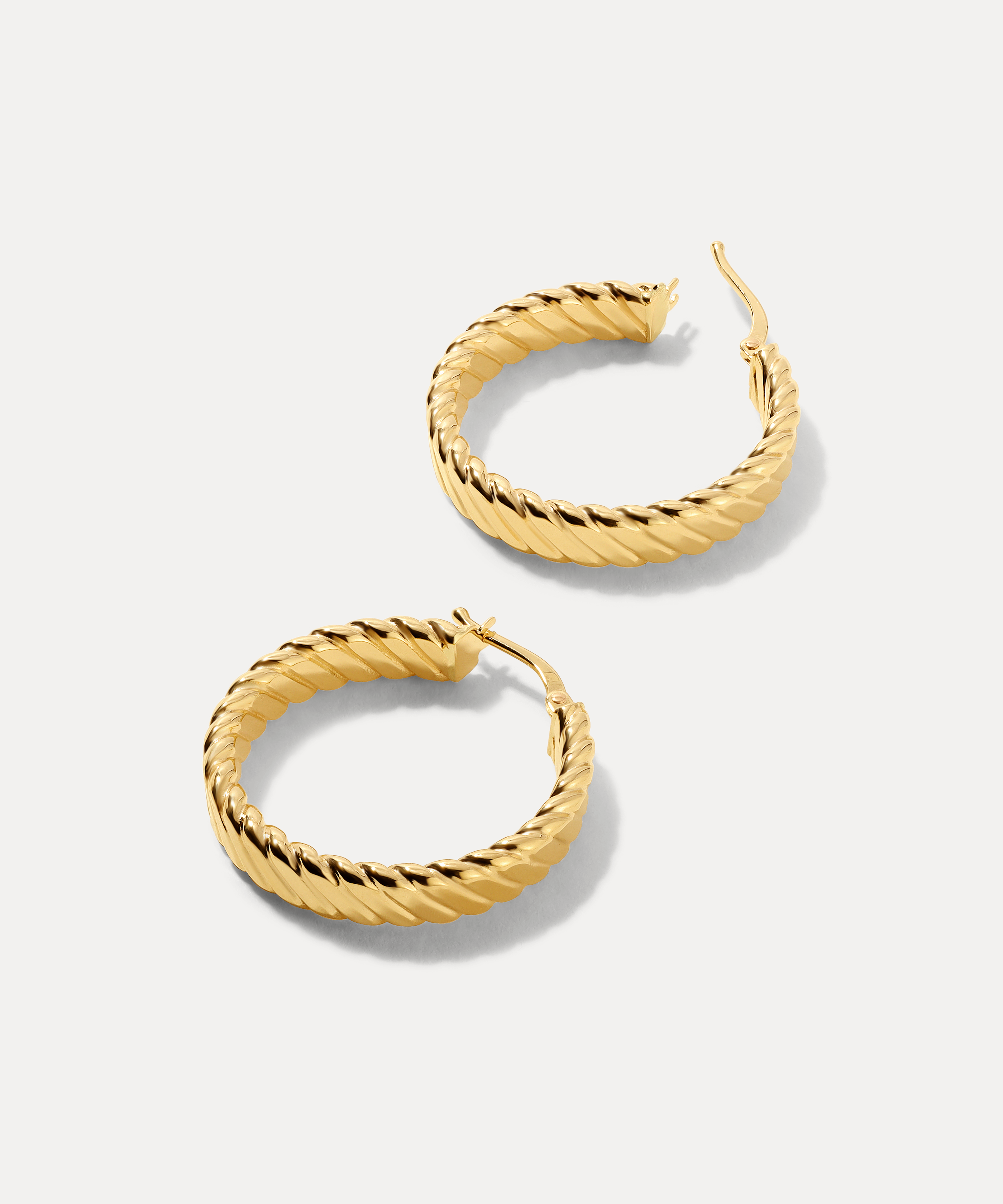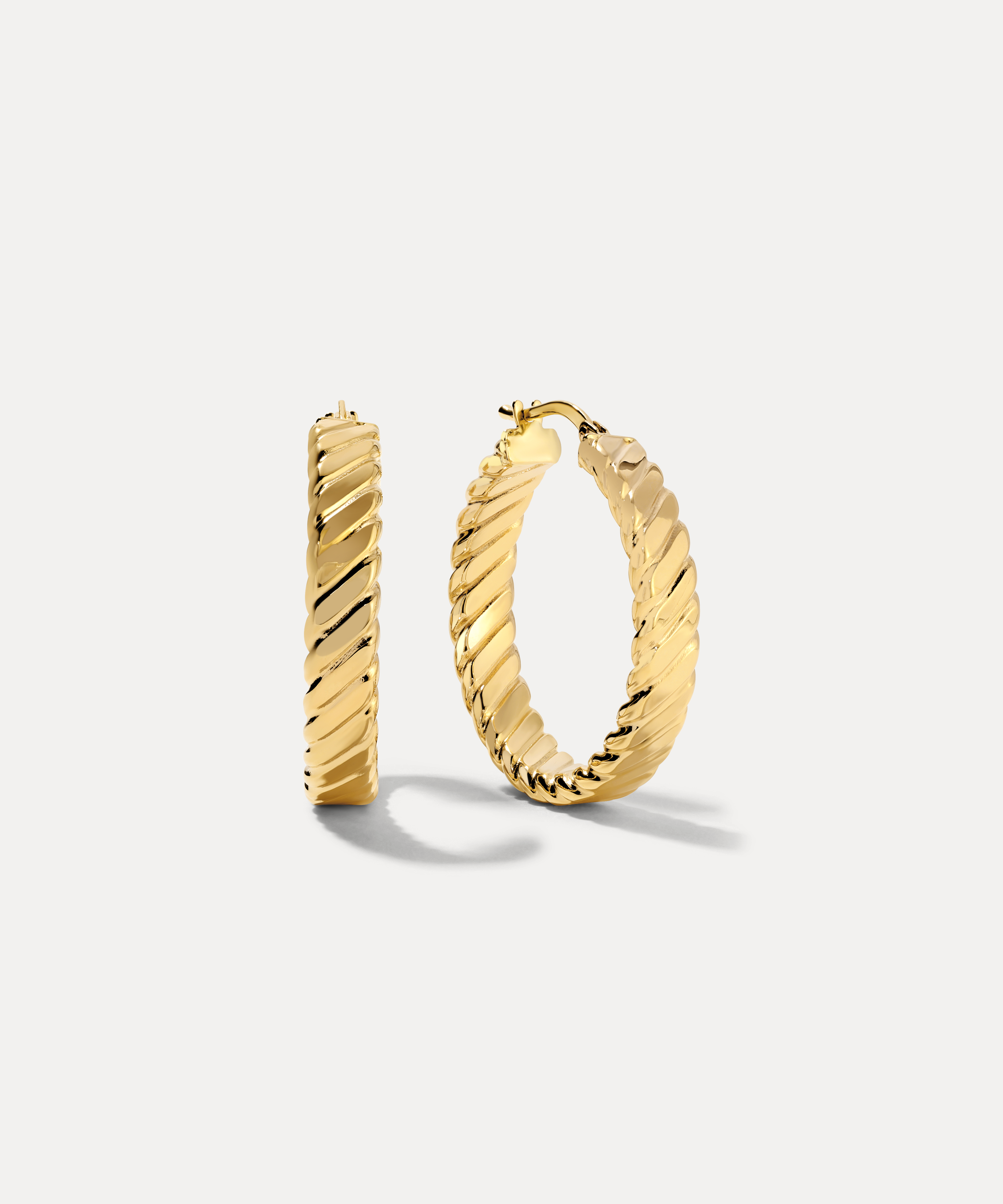 A spiraling silhouette meets high-polish shine in these statement-making hoops. Cast in solid 14k gold with a hollow, lightweight design, the Señorita Hoops offer serious presence without the weight. Their wide, sculptural twist catches light with every step — made to turn heads, day or night.