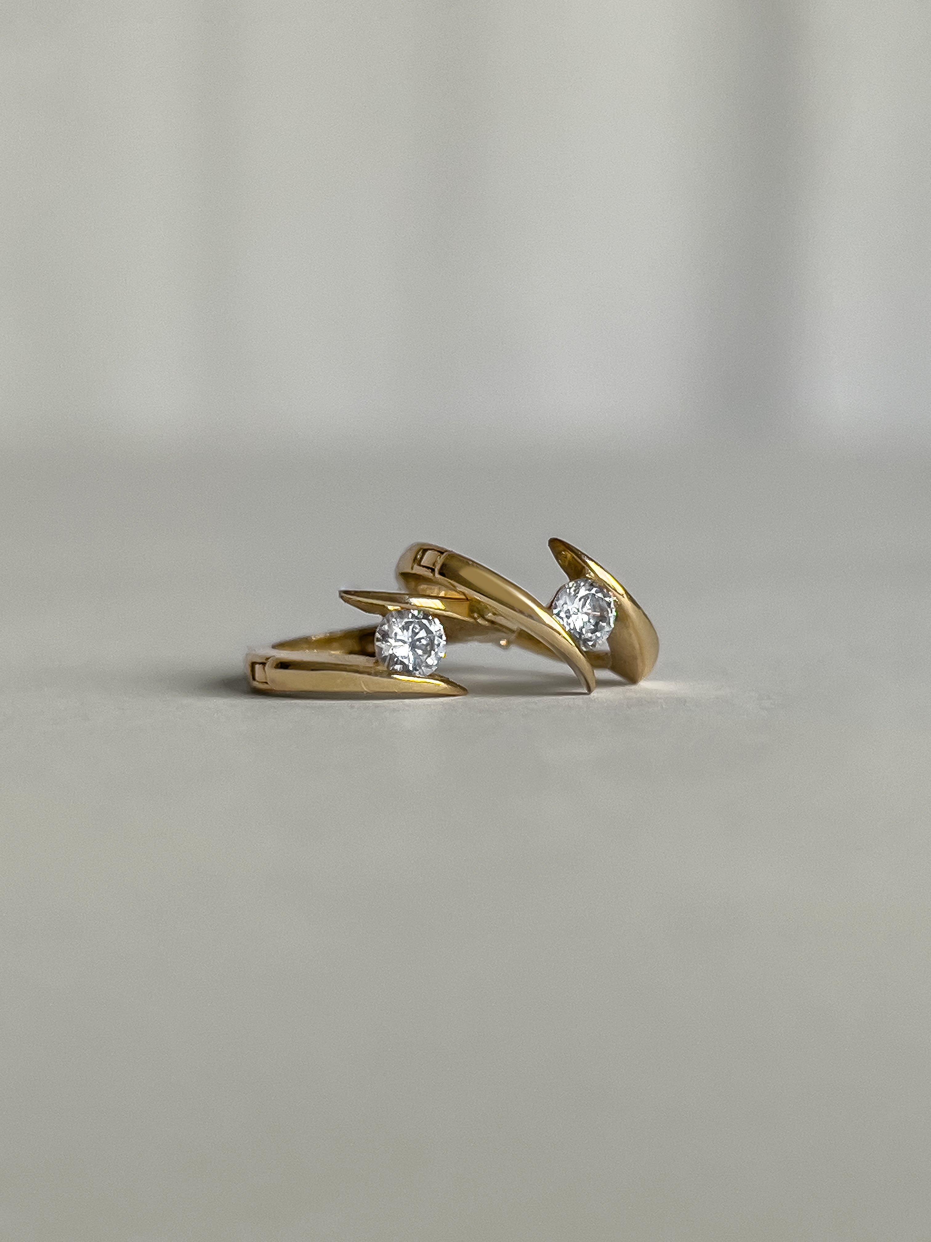 Meet the most sculptural style in our Solitaire Huggies lineup. These 14k gold huggies hold a single clear gemstone in a unique split-wrap setting that creates an open, swirled silhouette—giving the illusion of movement and edge from every angle.