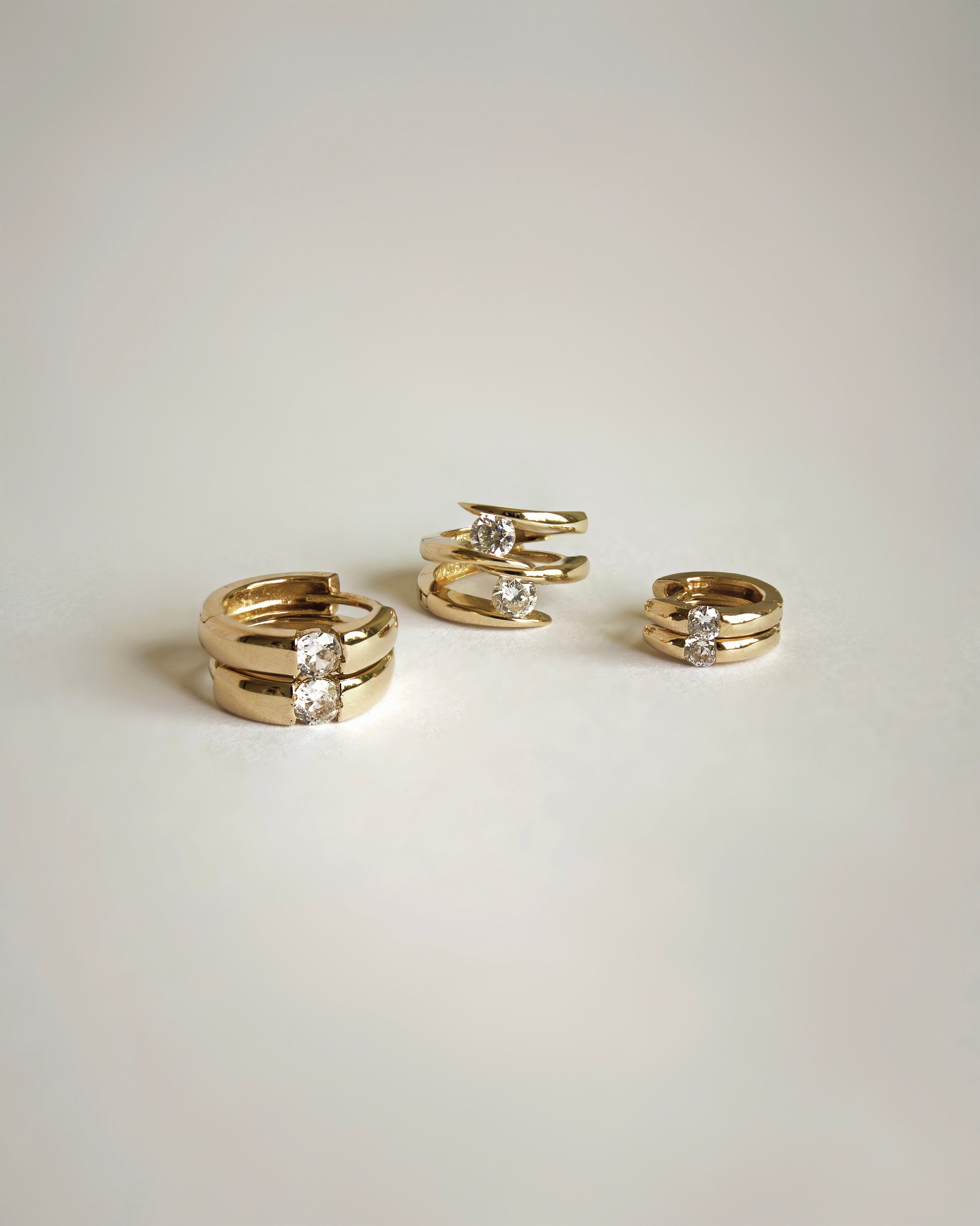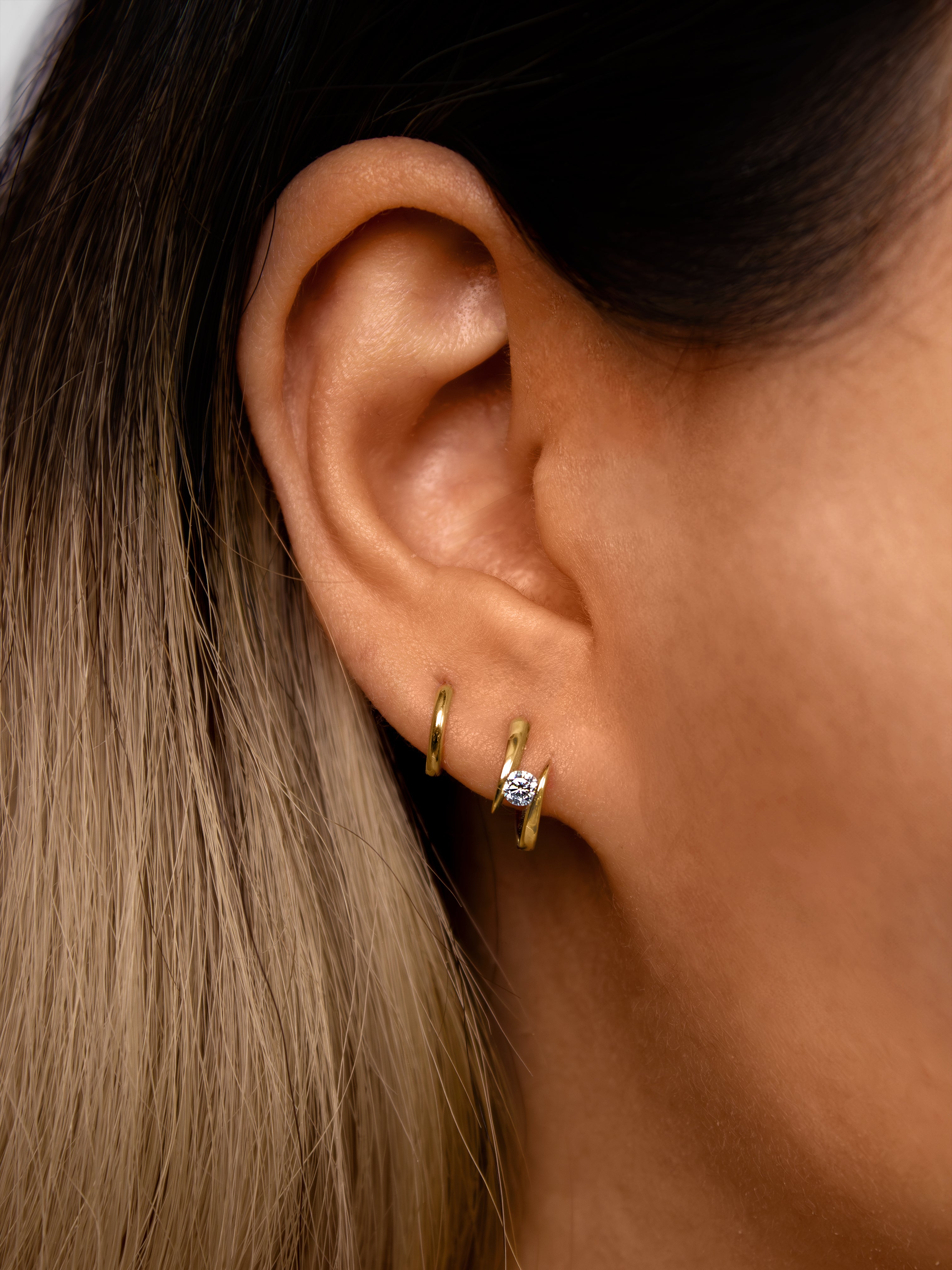 High-polish, solid gold with a secure latch-back closure that clicks into place for everyday ease. Part of the Solitaire Huggies Trio including the Baby Solitaire Huggies & the Solitaire Huggies.