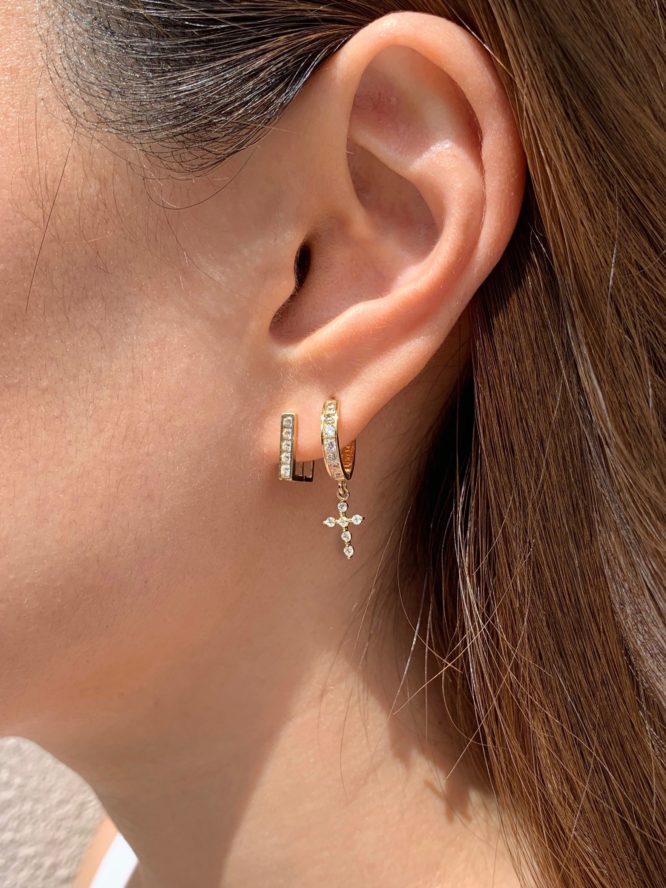 A fresh take on a classic. The Square Huggies bring clean lines and unexpected structure to the everyday earring lineup. Cast in solid 14k gold with a rectangular silhouette, each earring is set with a vertical row of brilliant white stones that frame the ear with just the right amount of sparkle. Sculptural, polished, and refreshingly modern — a bold new shape for your rotation.