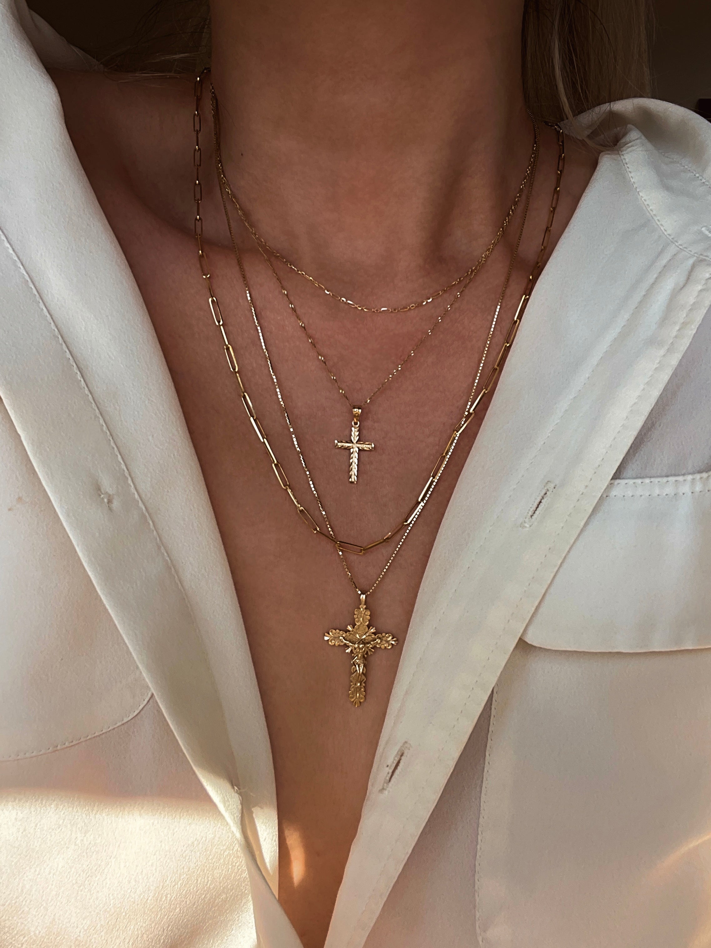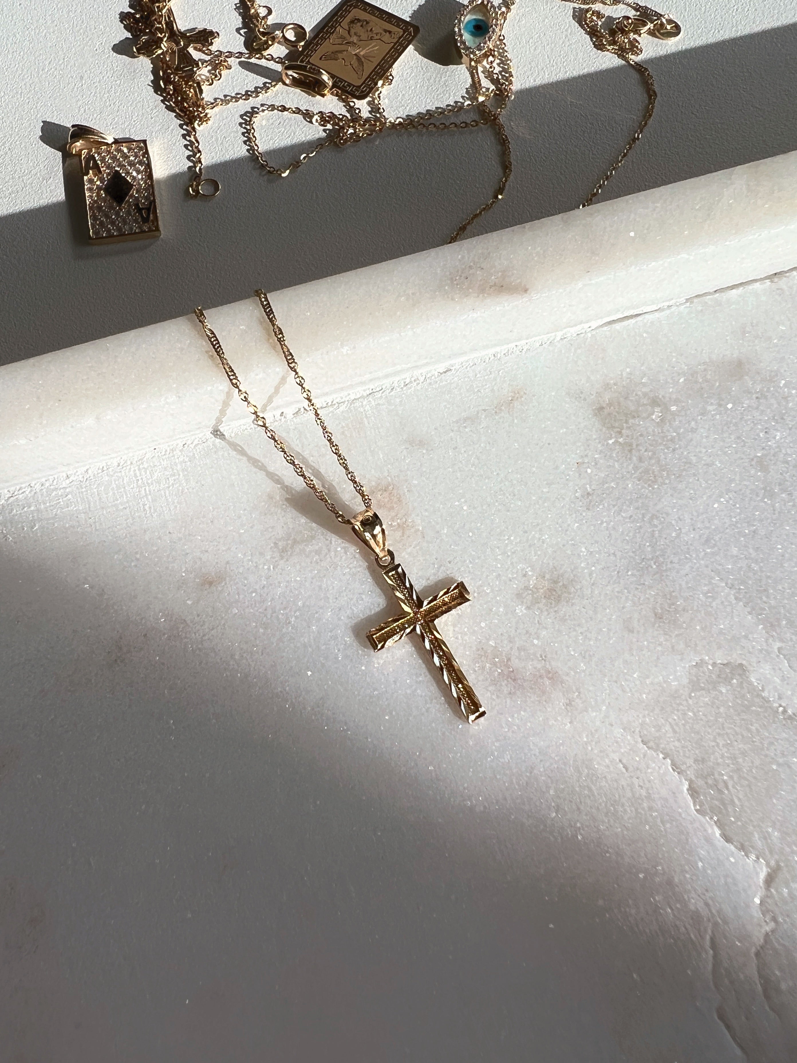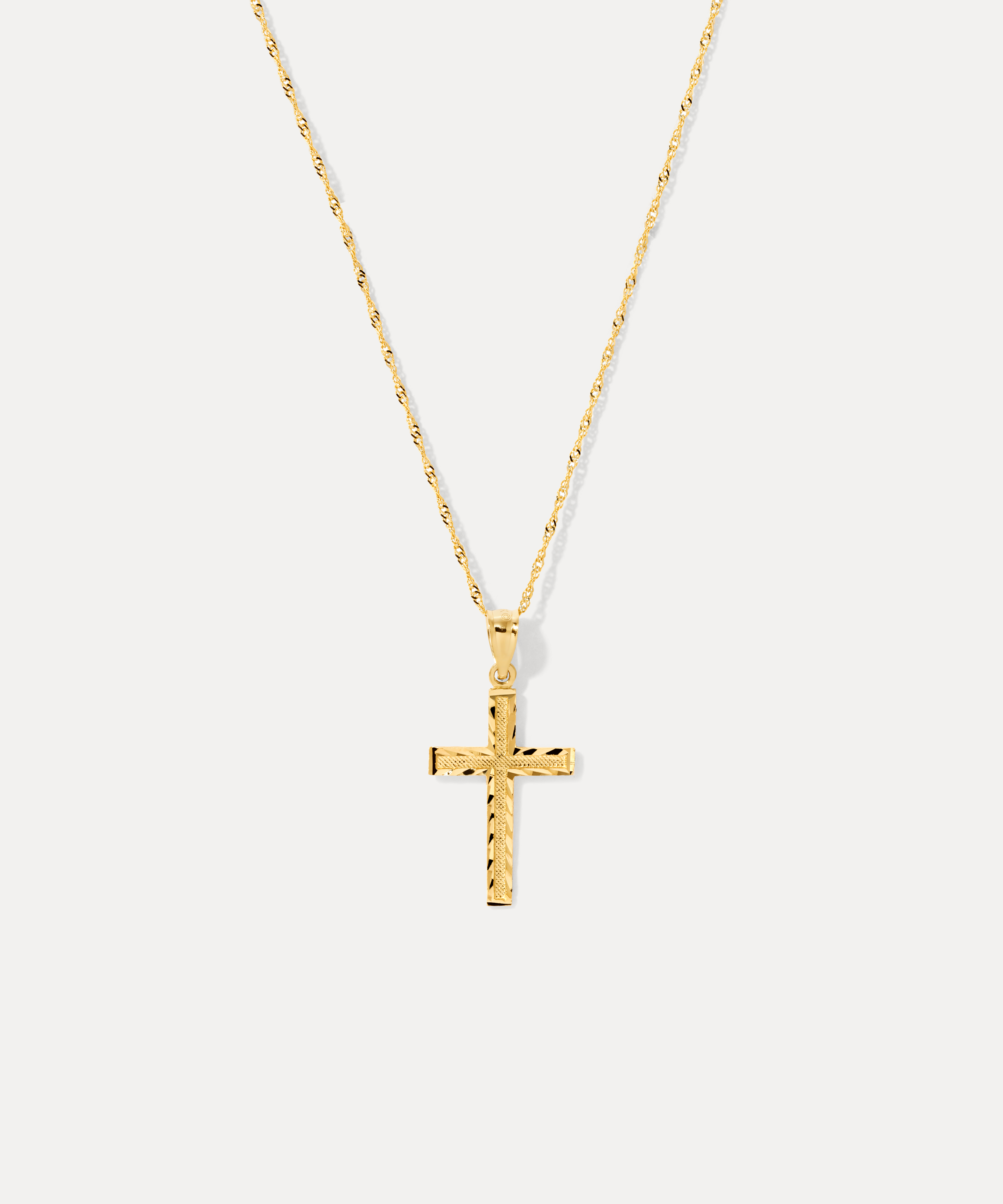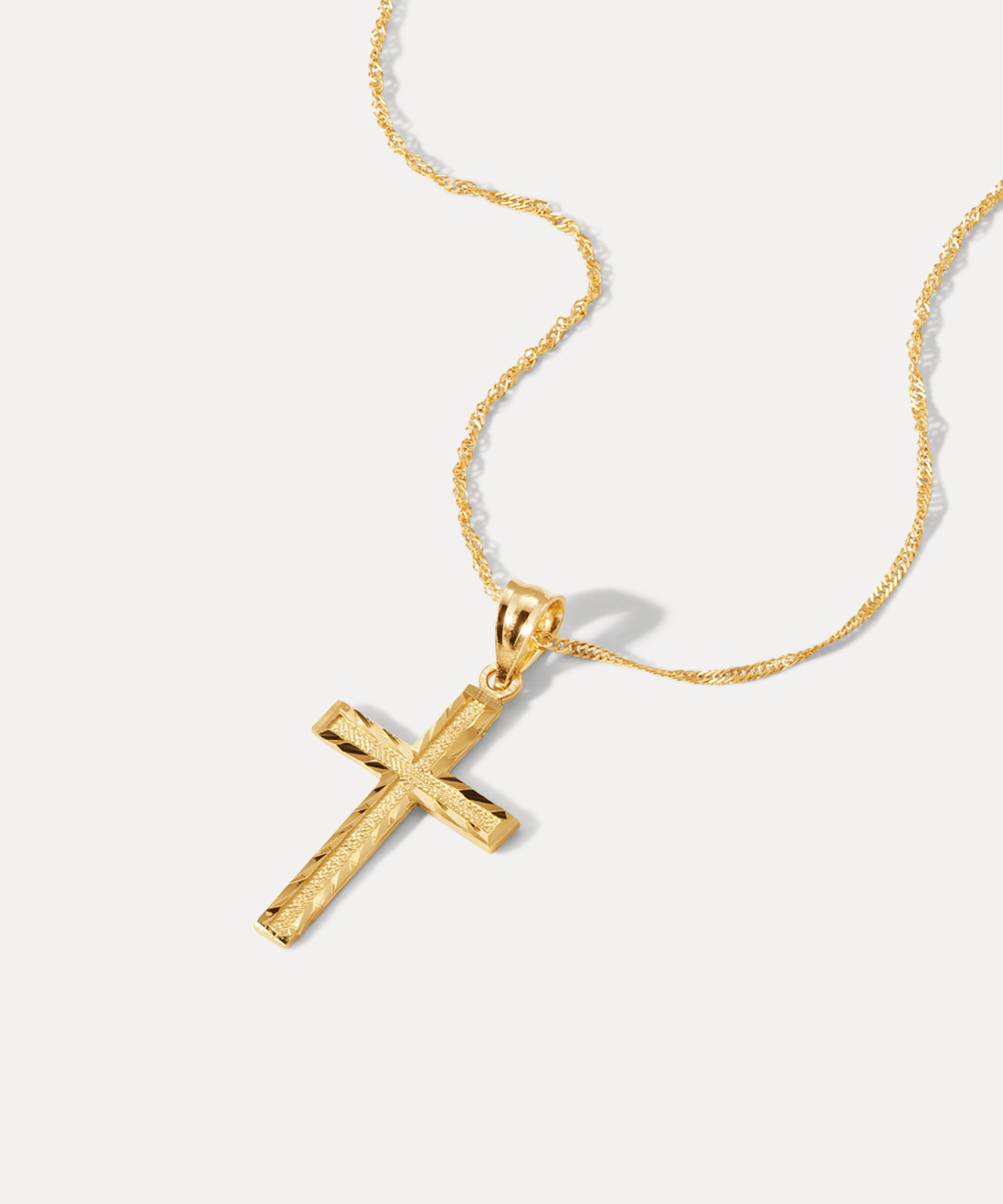 This necklace pairs the Diamond Cut Cross Pendant with our signature Singapore Chain. Cast in solid 14k gold, the pendant features sharp edges with diamond-cut detailing, a stamped center texture, and a high-polish finish that reflects light with every movement.