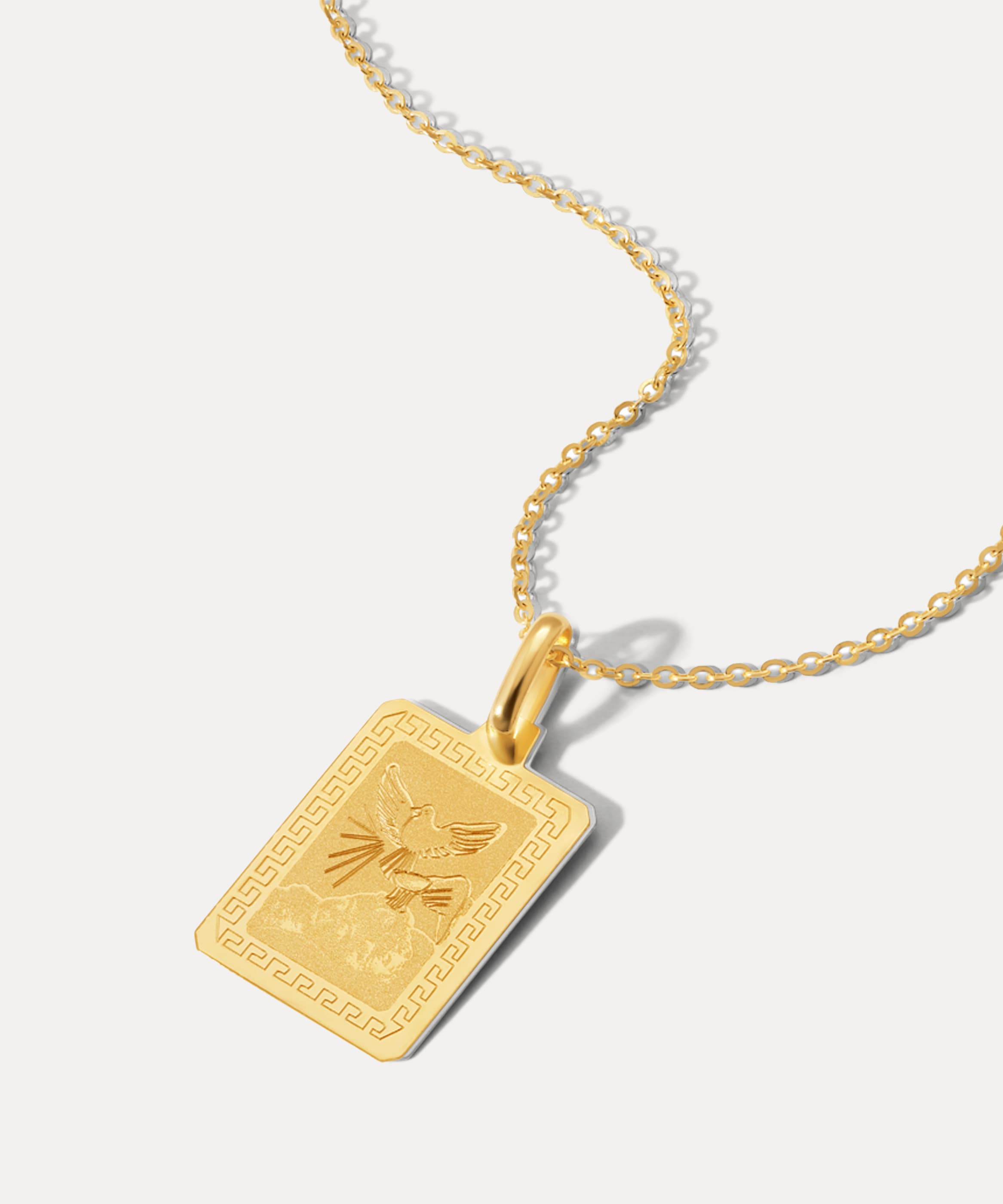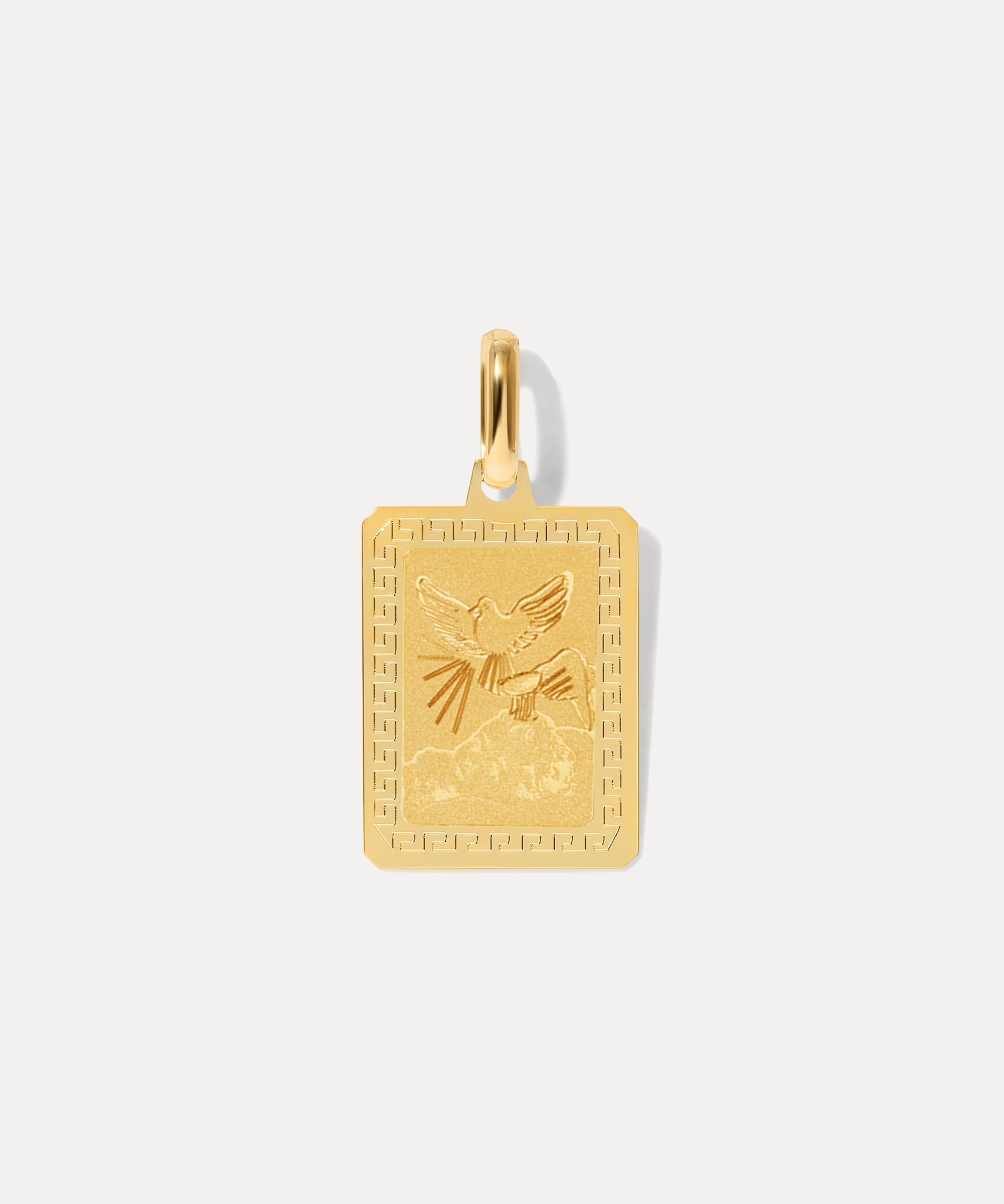 The Born to Fly Pendant features a raised dove in flight — a symbol of freedom, hope, and renewal, gently nodding to the tradition of baptism. Framed within a beveled square and finished with a soft meandering border, it adds texture and movement to this lightweight, meaningful piece.