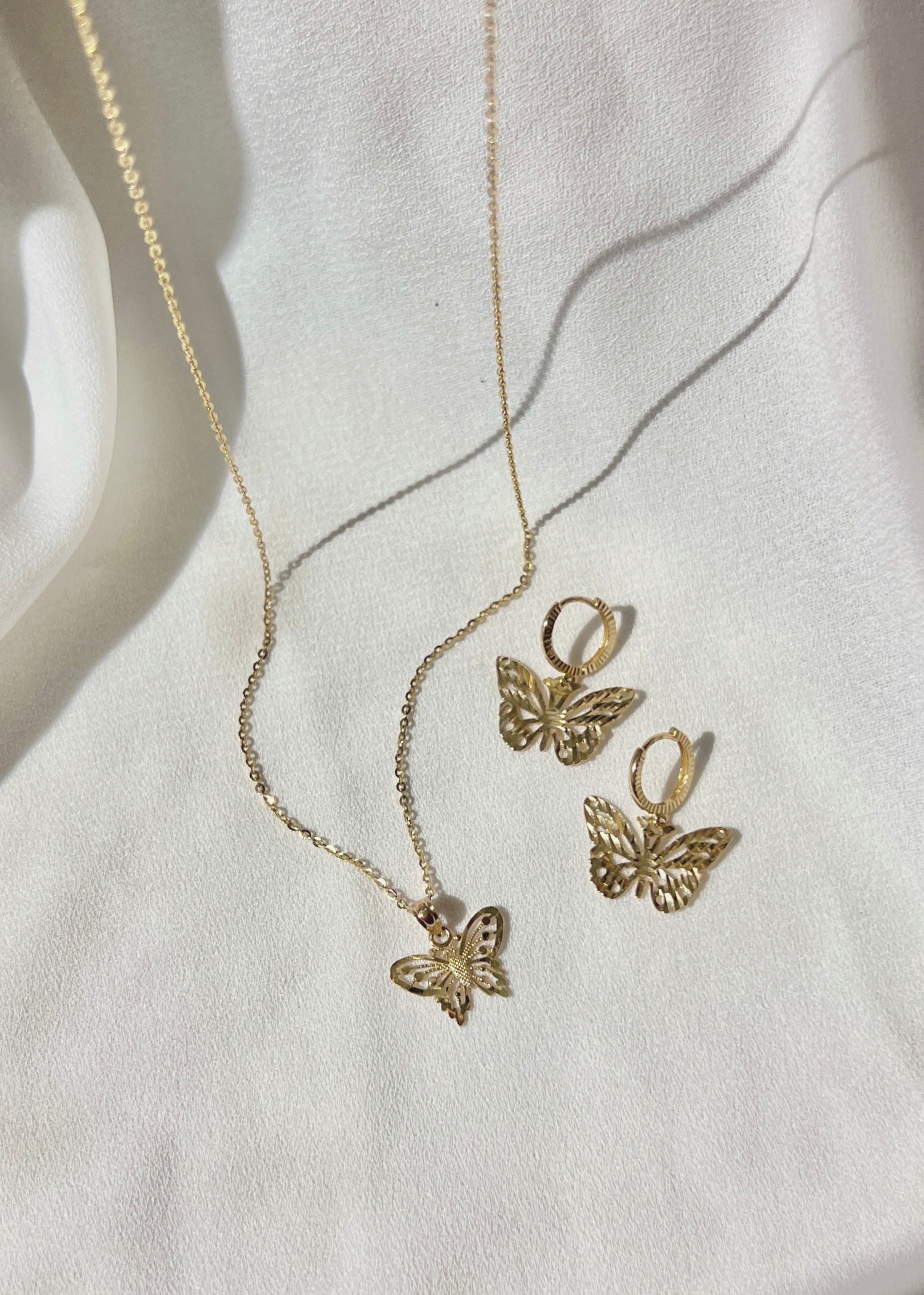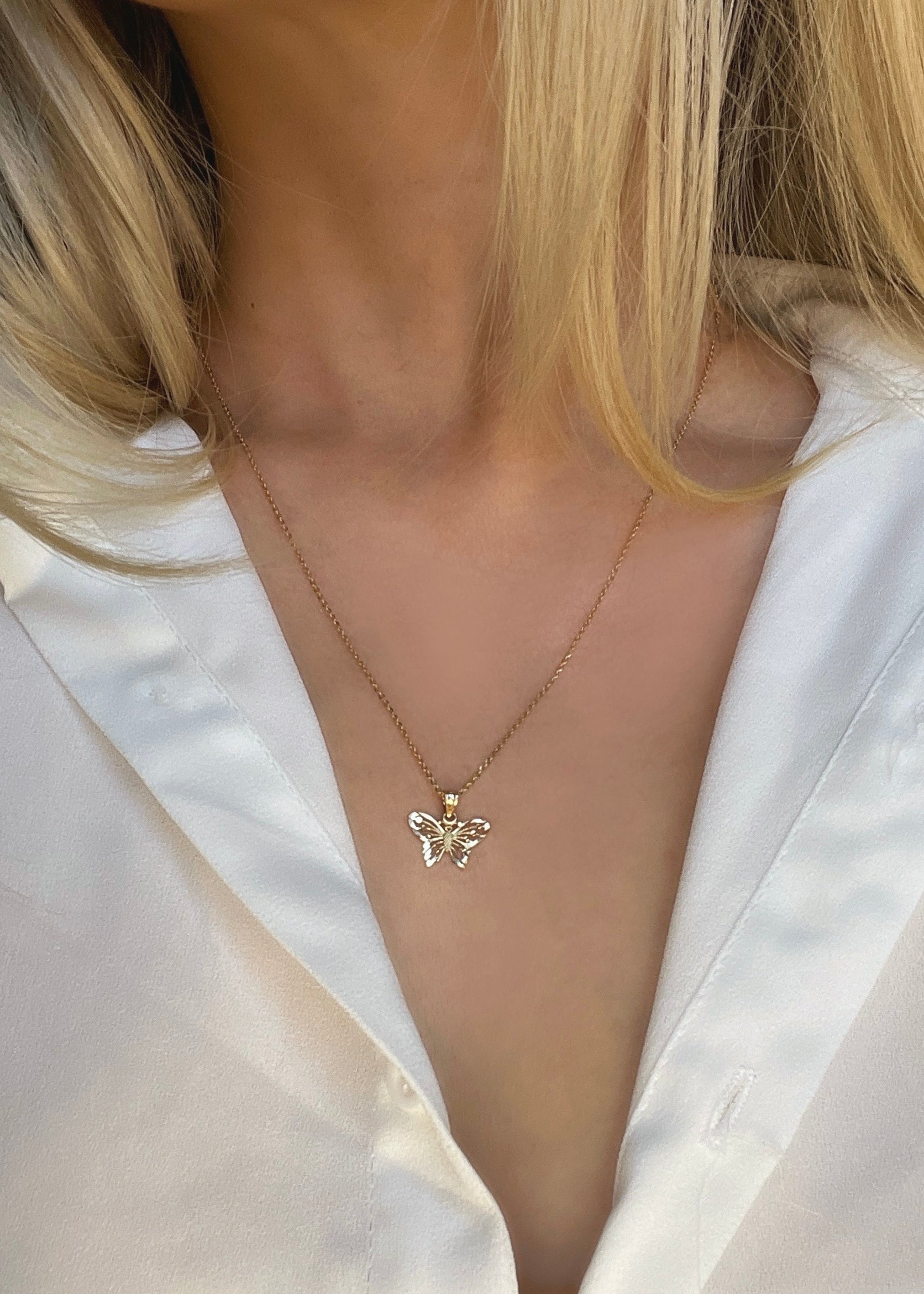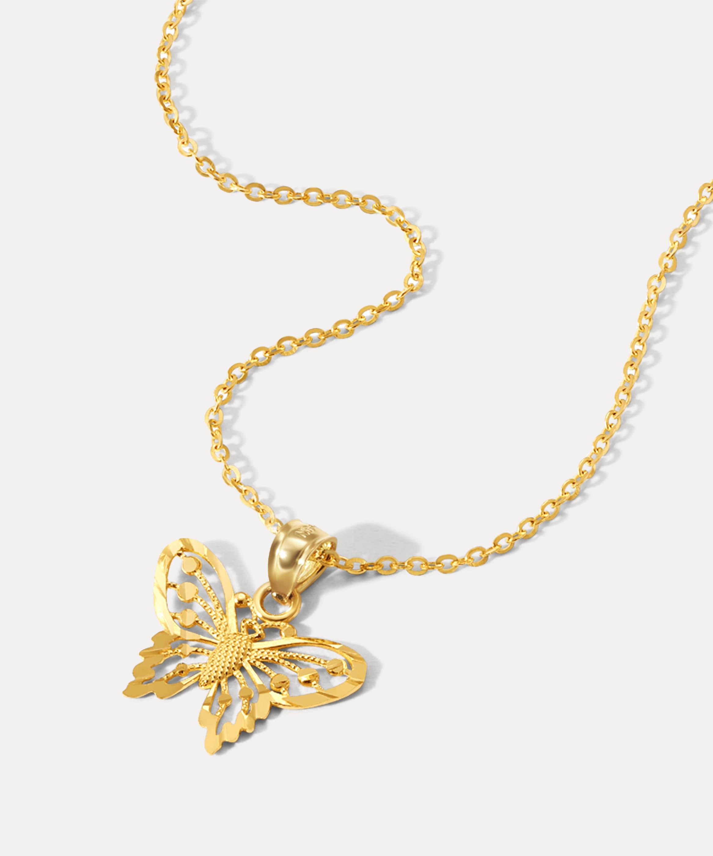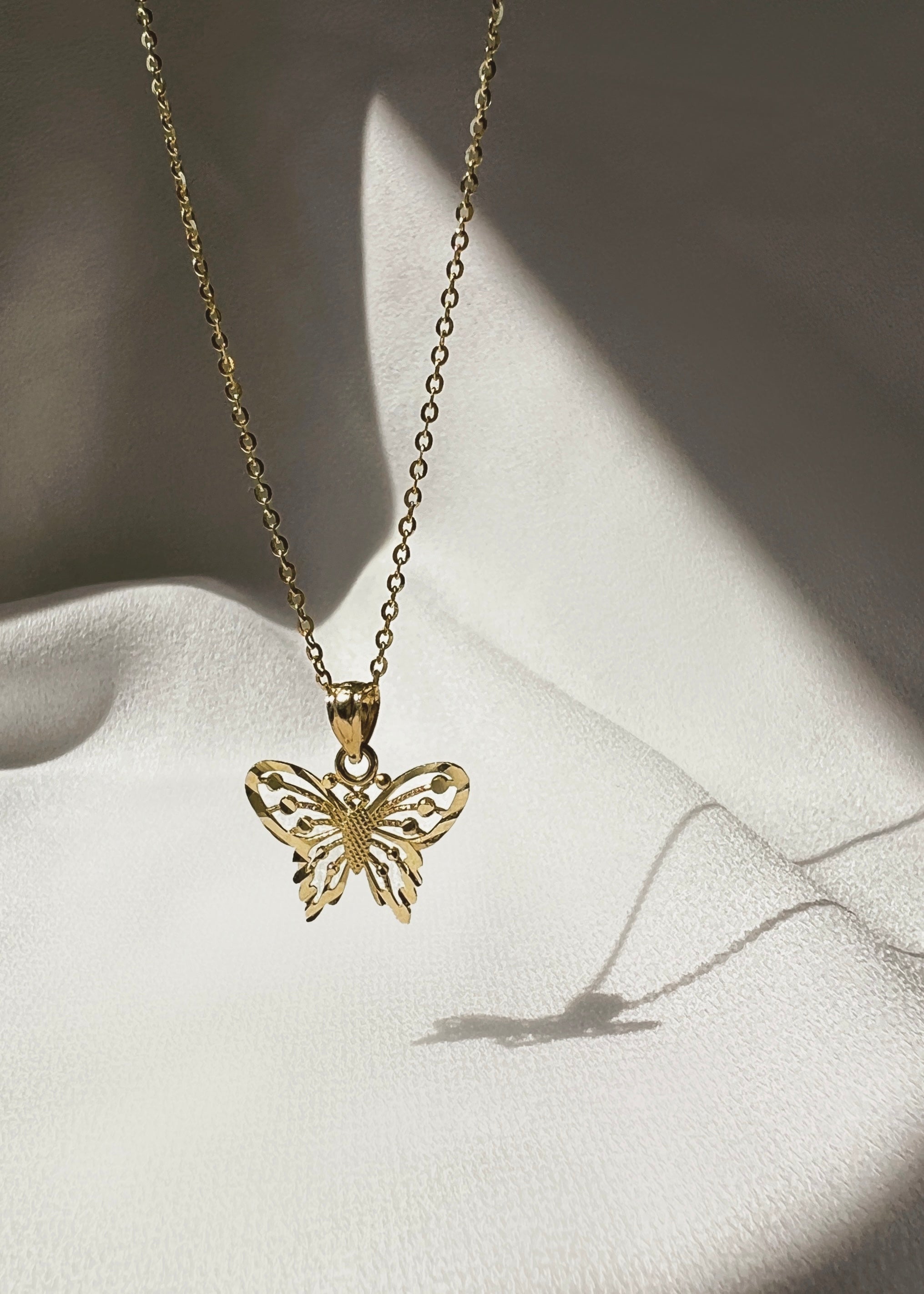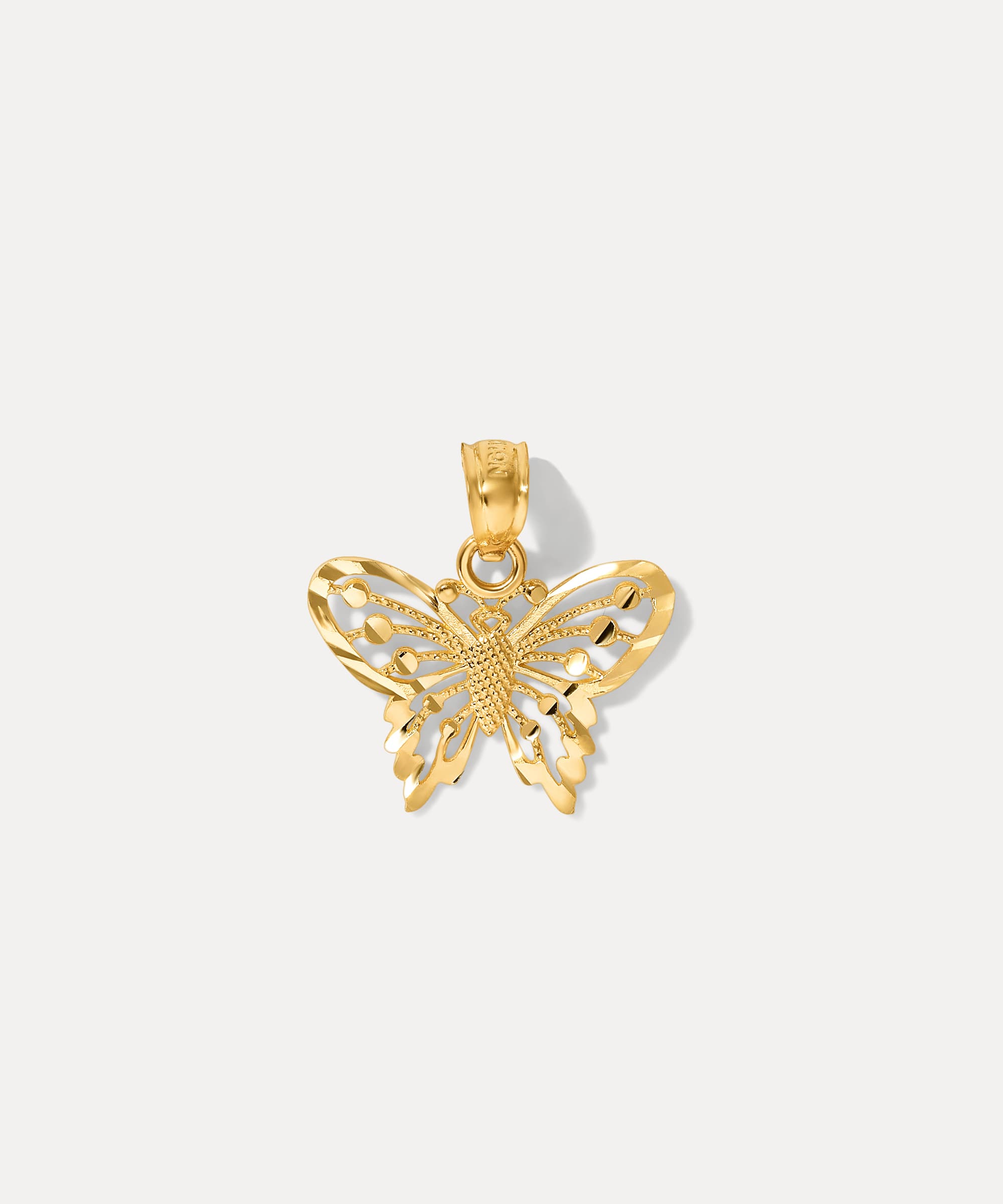 This pendant celebrates the butterfly, nature’s most graceful metamorphosis. Intricately crafted in solid 14k gold with diamond-cut texture and airy cutouts, it balances lifelike detail with everyday wearability.