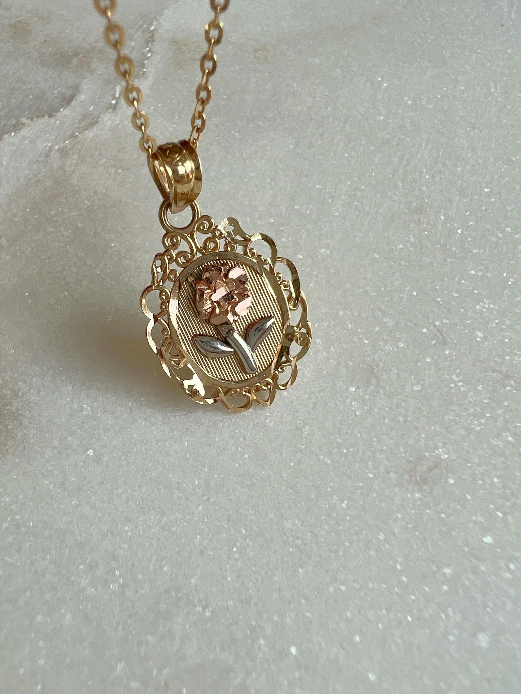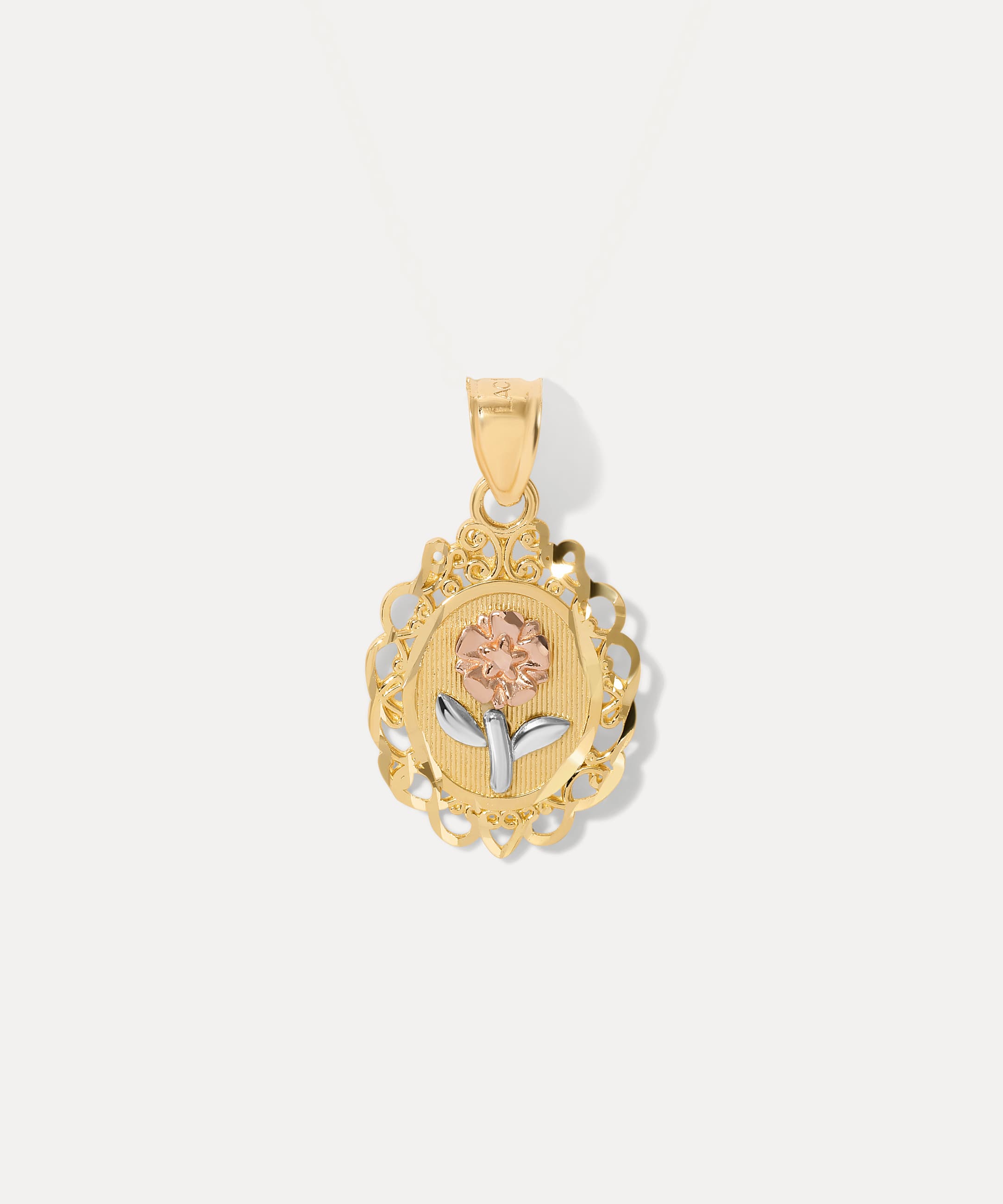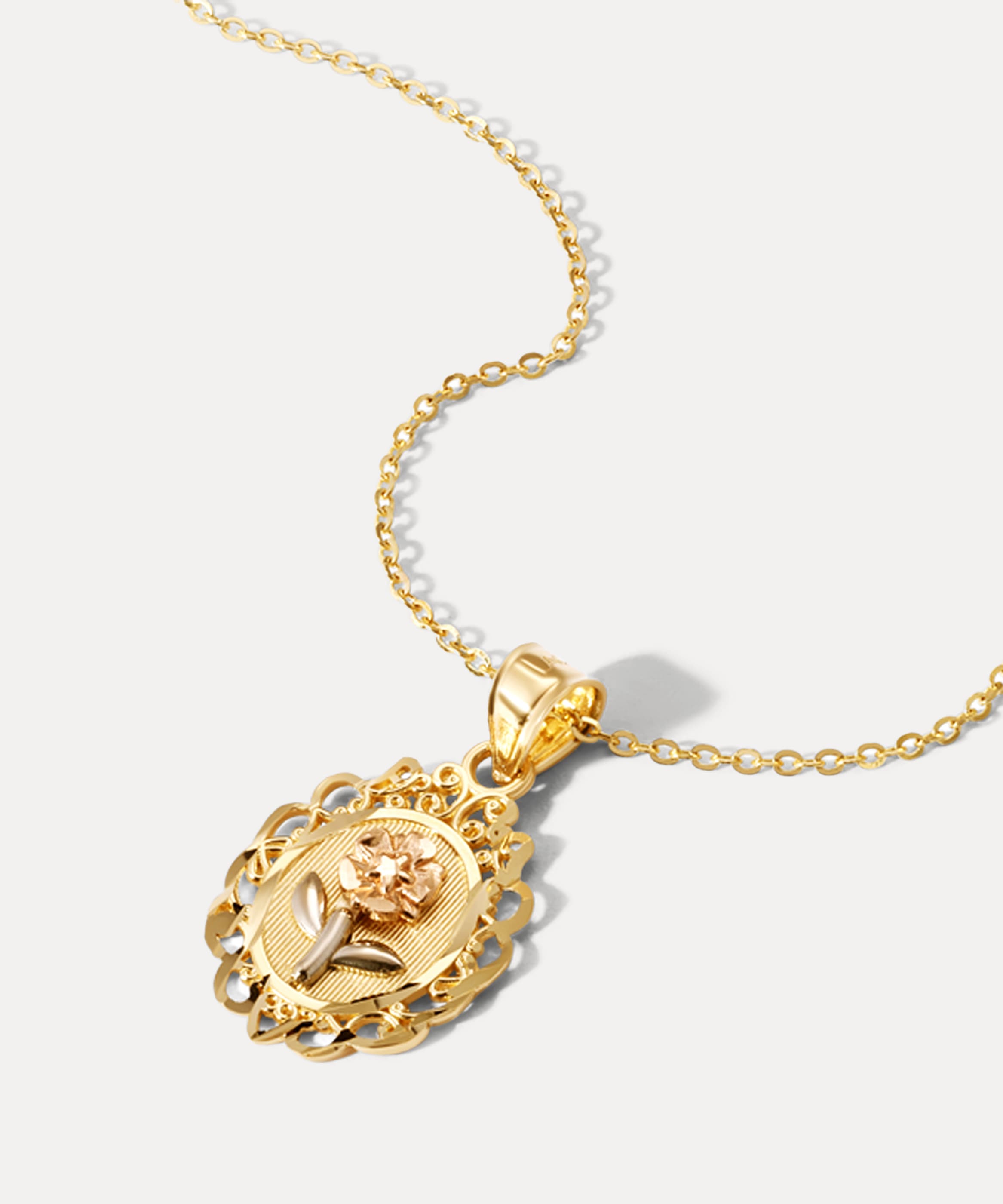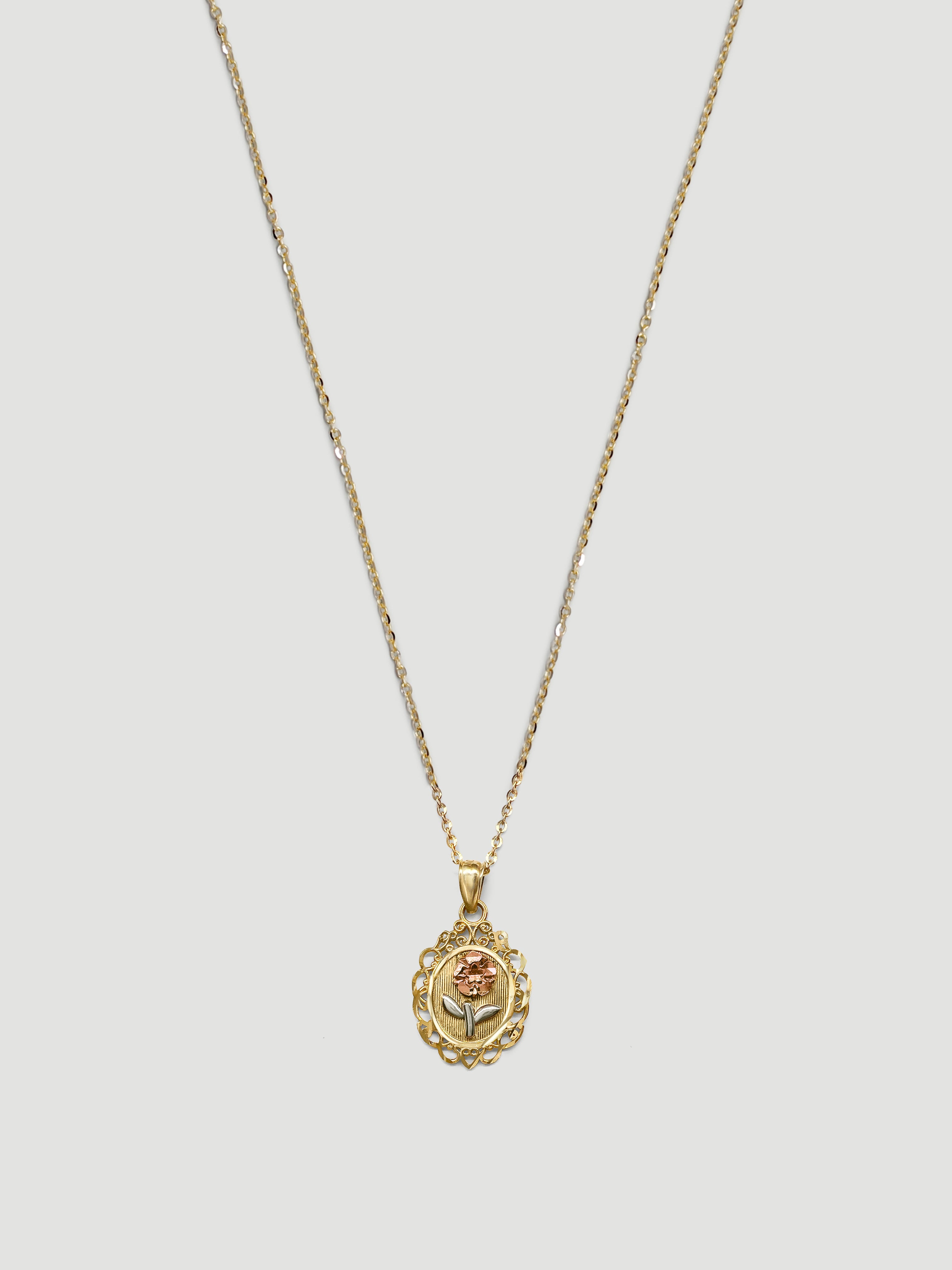 Inspired by vintage portraiture, this necklace blends old-world charm with modern craftsmanship. At its center, a three-tone floral motif—rose gold flower, white gold leaves, and a yellow gold base—rises above a textured gold backdrop. The scalloped, lace-like frame is finished with filigree details that echo Victorian-era design.