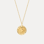 The Angels From Above Necklace features a solid 14k gold medallion with an intricate engraving of two angels in flight, framed by a delicate lace-like border. A symbol of divine protection and spiritual guidance, this piece captures the beauty of celestial beings in motion.