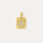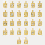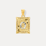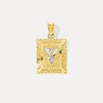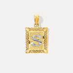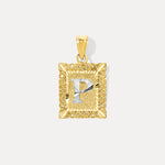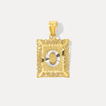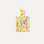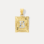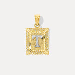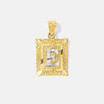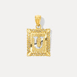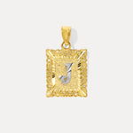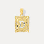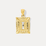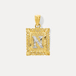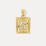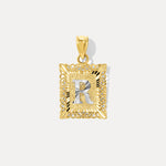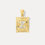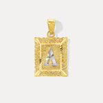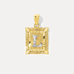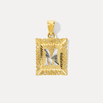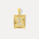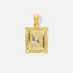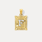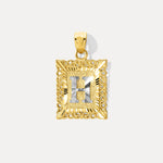 This personalized pendant features your chosen initial in white gold, set within a square 14k gold frame. Intricate scrollwork and a hammered, radiant-pattern background add vintage texture and shine — a signature piece with heirloom energy.