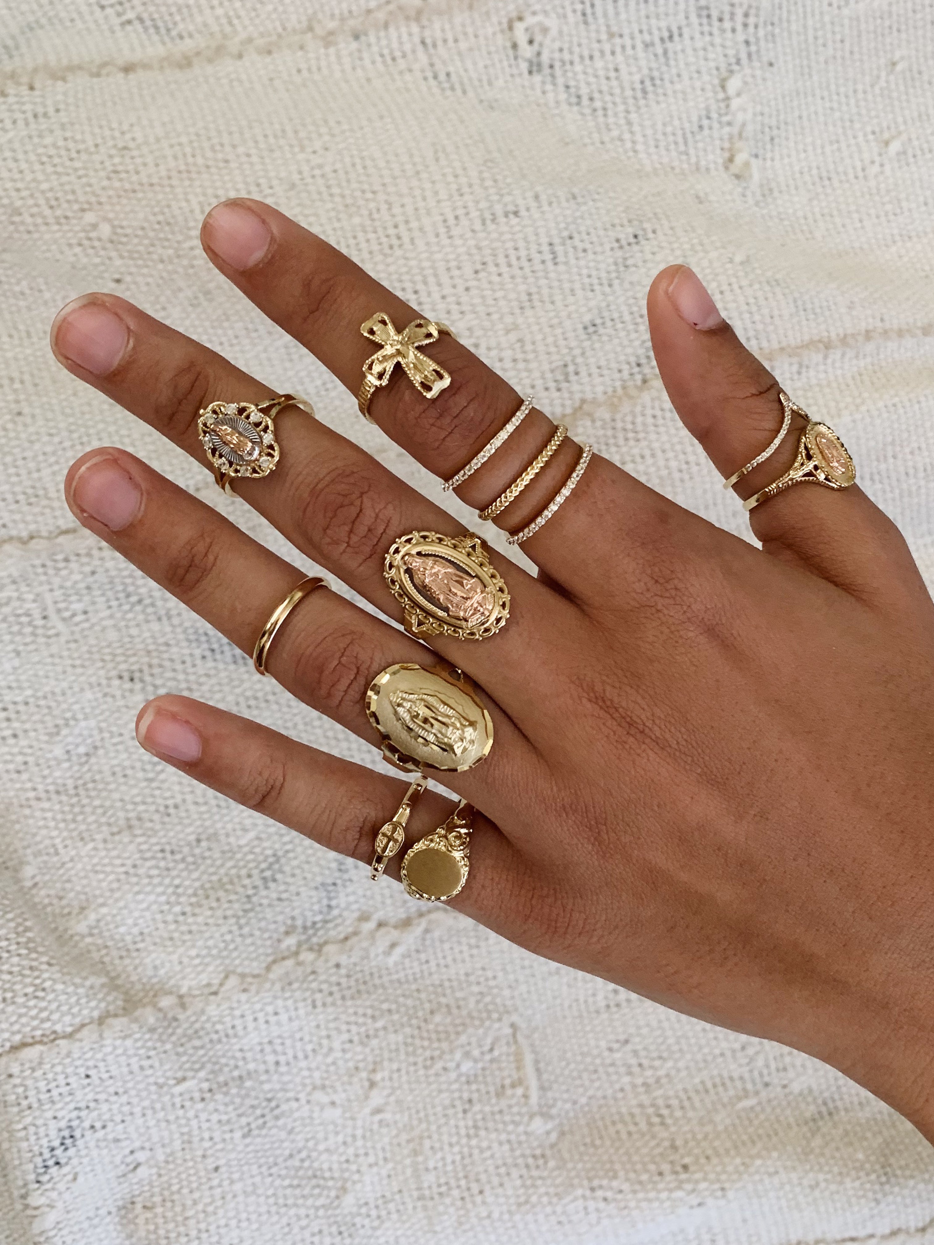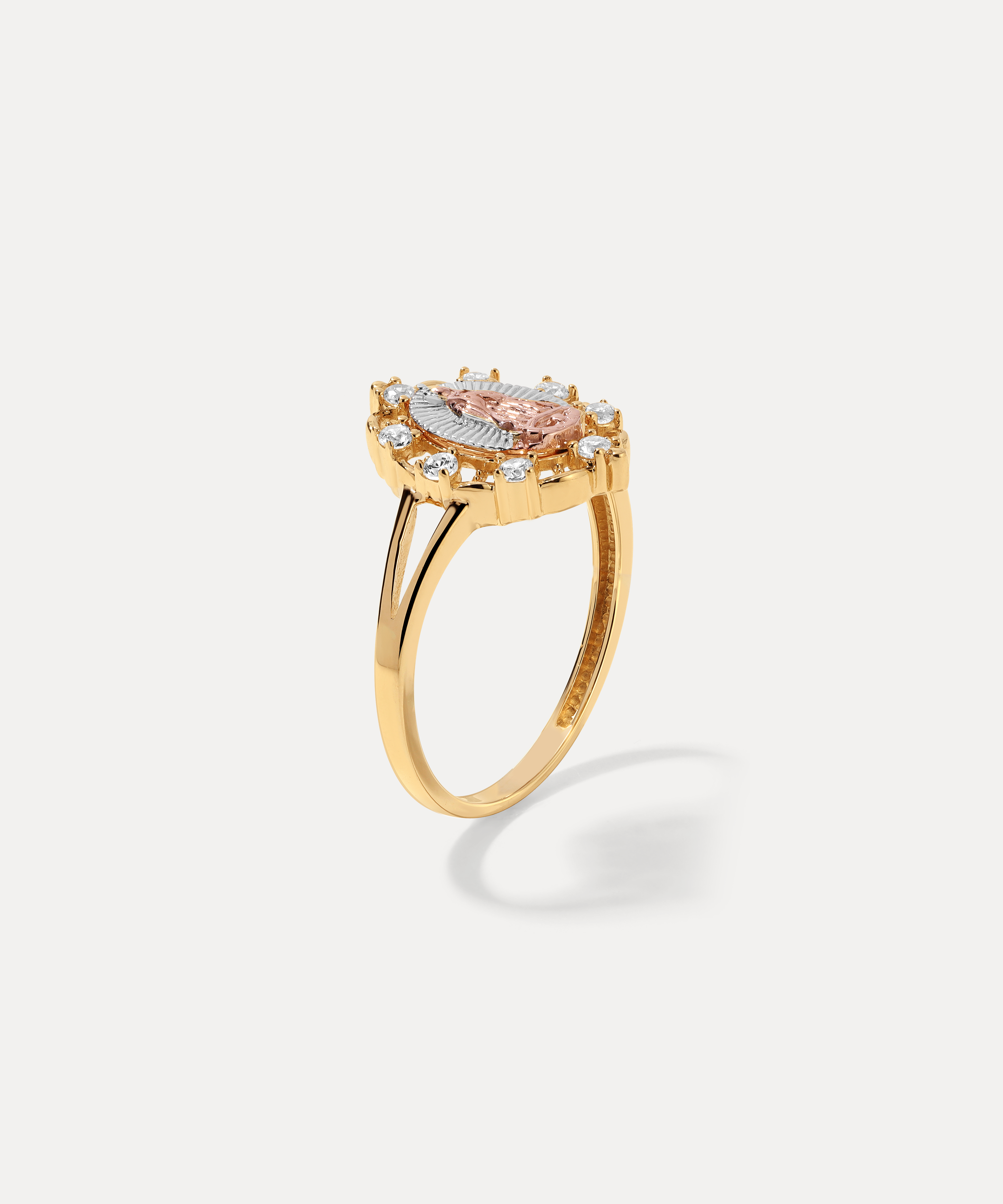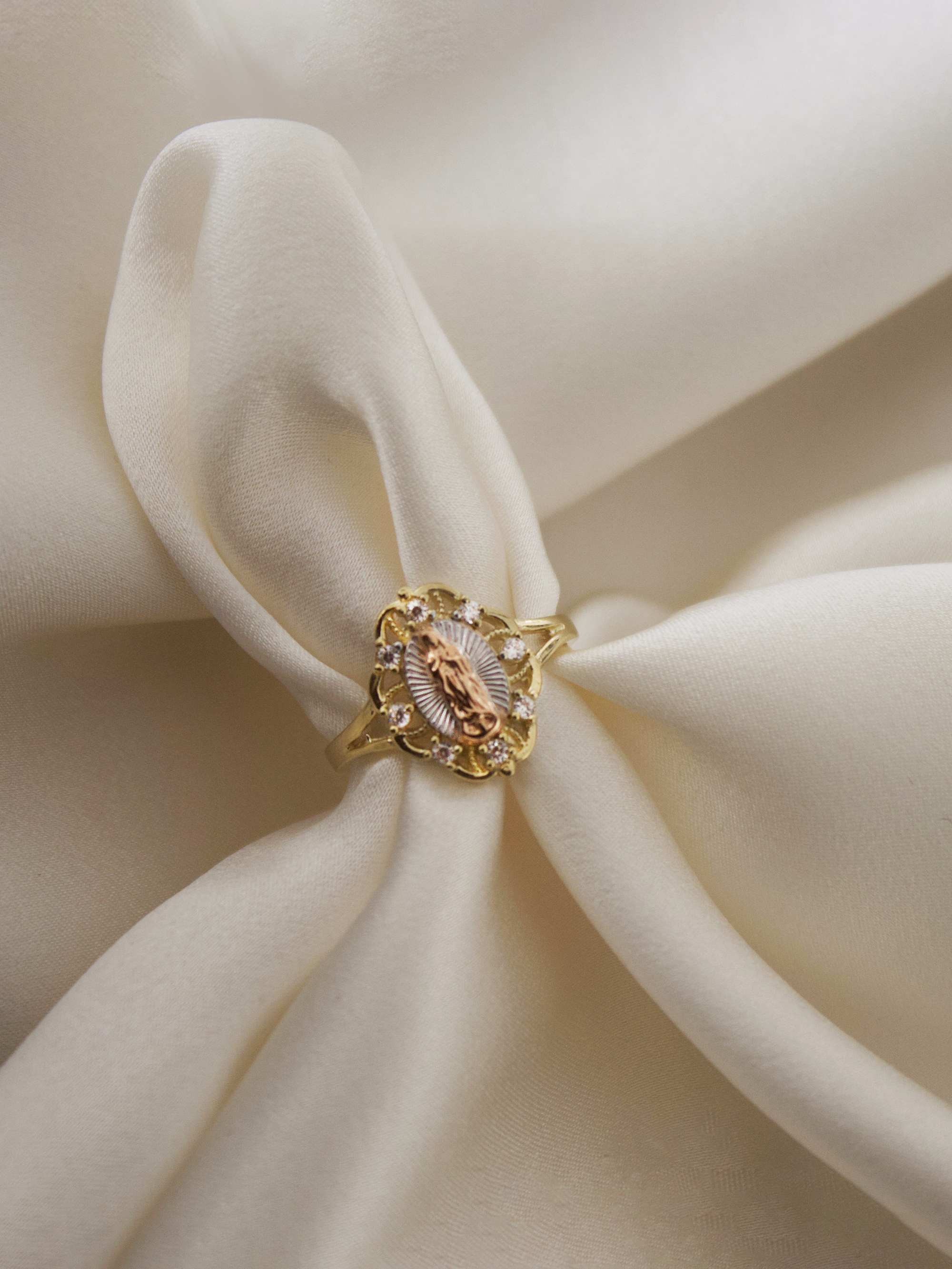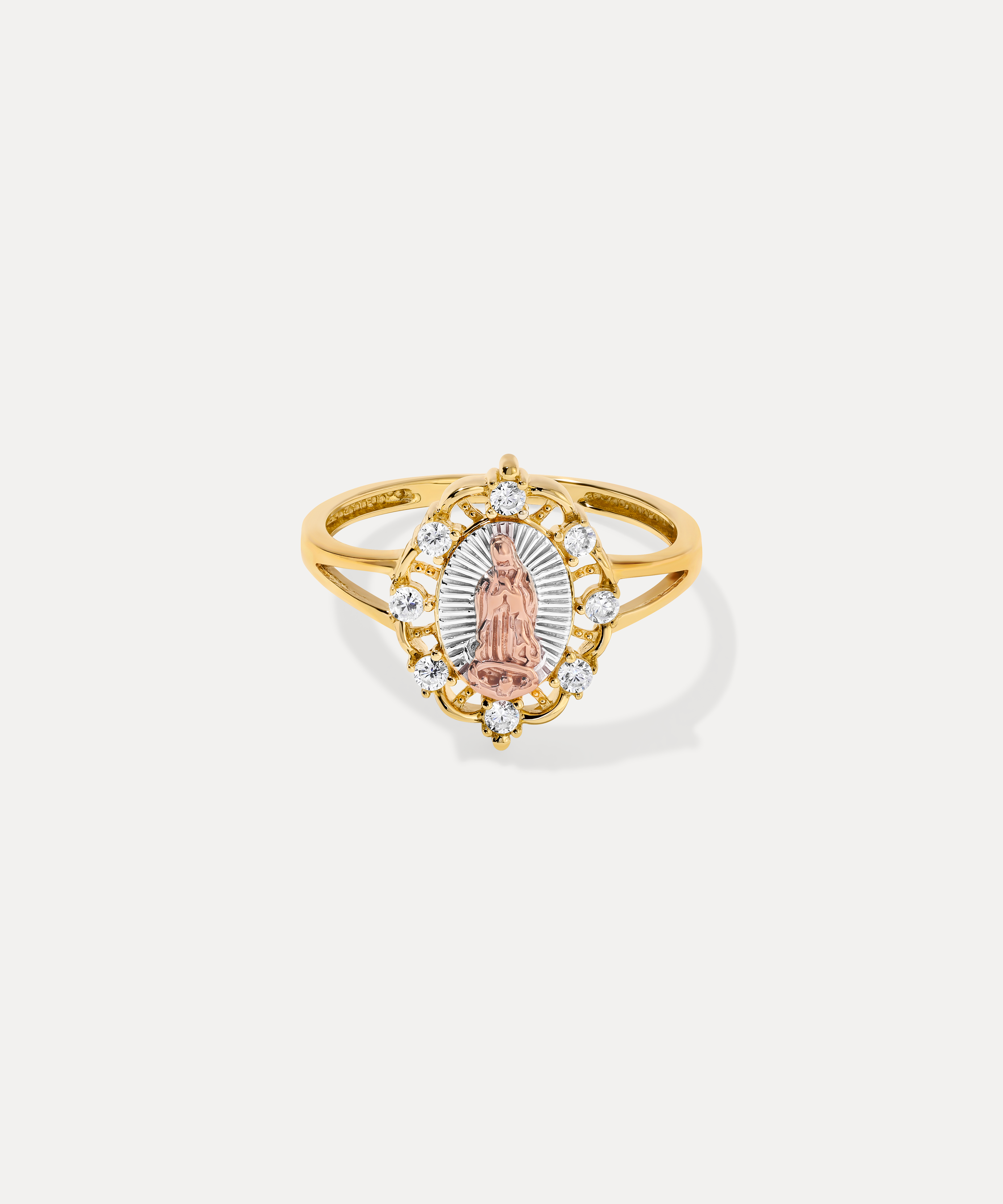 The Celestial Mary Ring features a radiant rose gold Virgin Mary surrounded by eight sparkling CZ stones, set against a starburst white gold background. A split band offers subtle detail and all-day comfort — crafted in solid 14k gold.