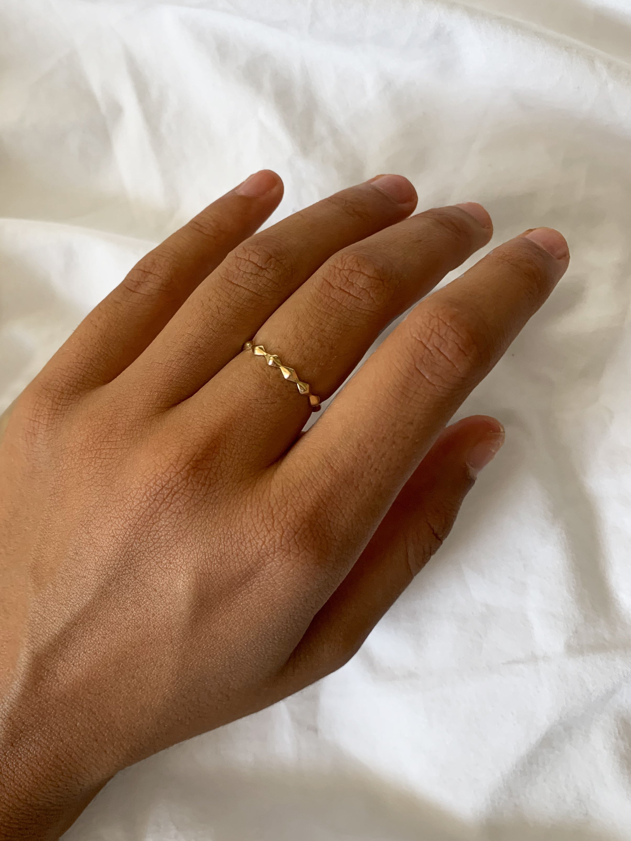 The Bump Band plays with dimension through a rhythmic pattern of soft-edged chevrons, giving it a sharp shimmer and sculptural feel. Crafted in solid 14k gold with a contoured interior, it’s comfortable enough for everyday, striking enough to wear solo — this is minimalism with an edge.