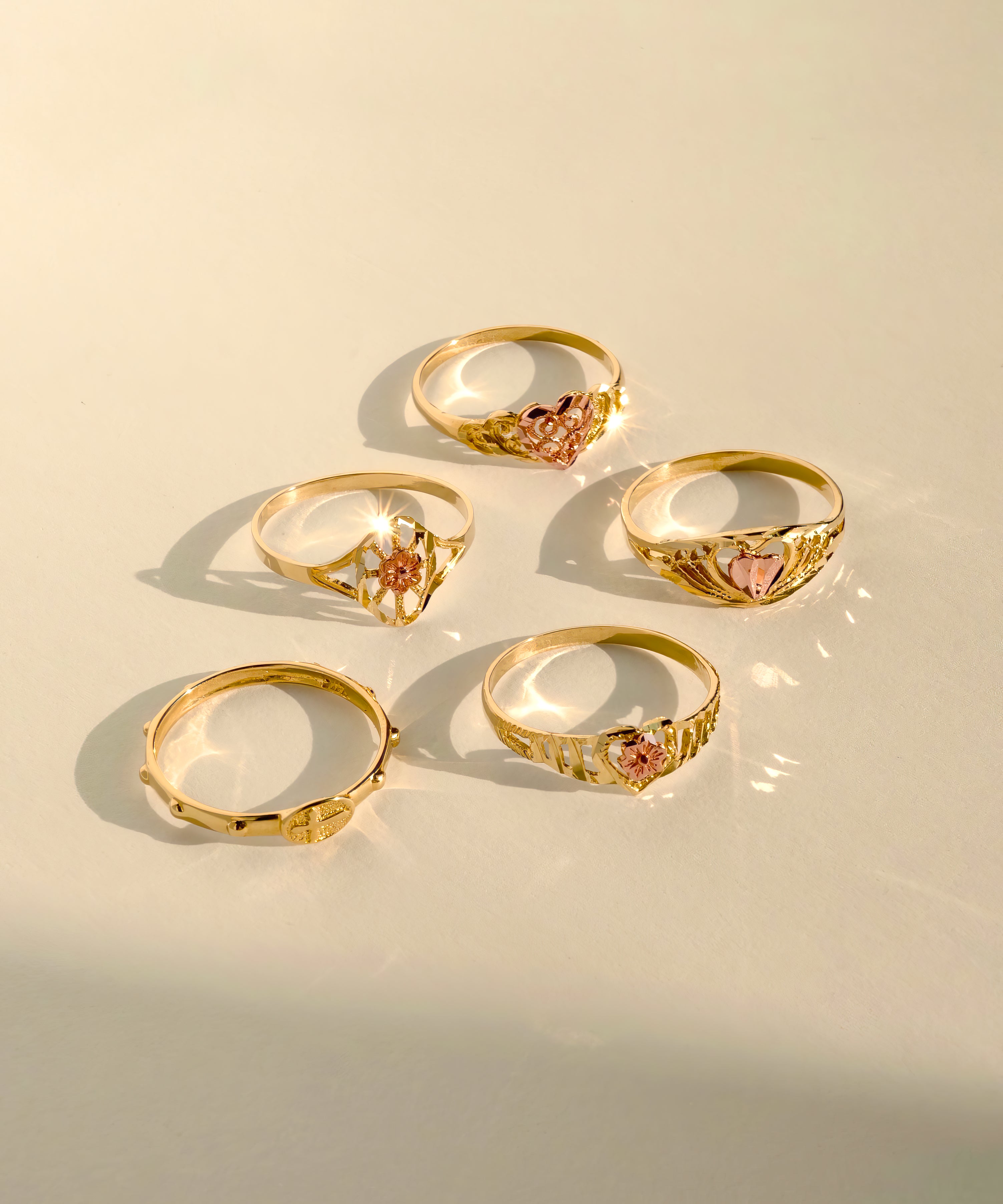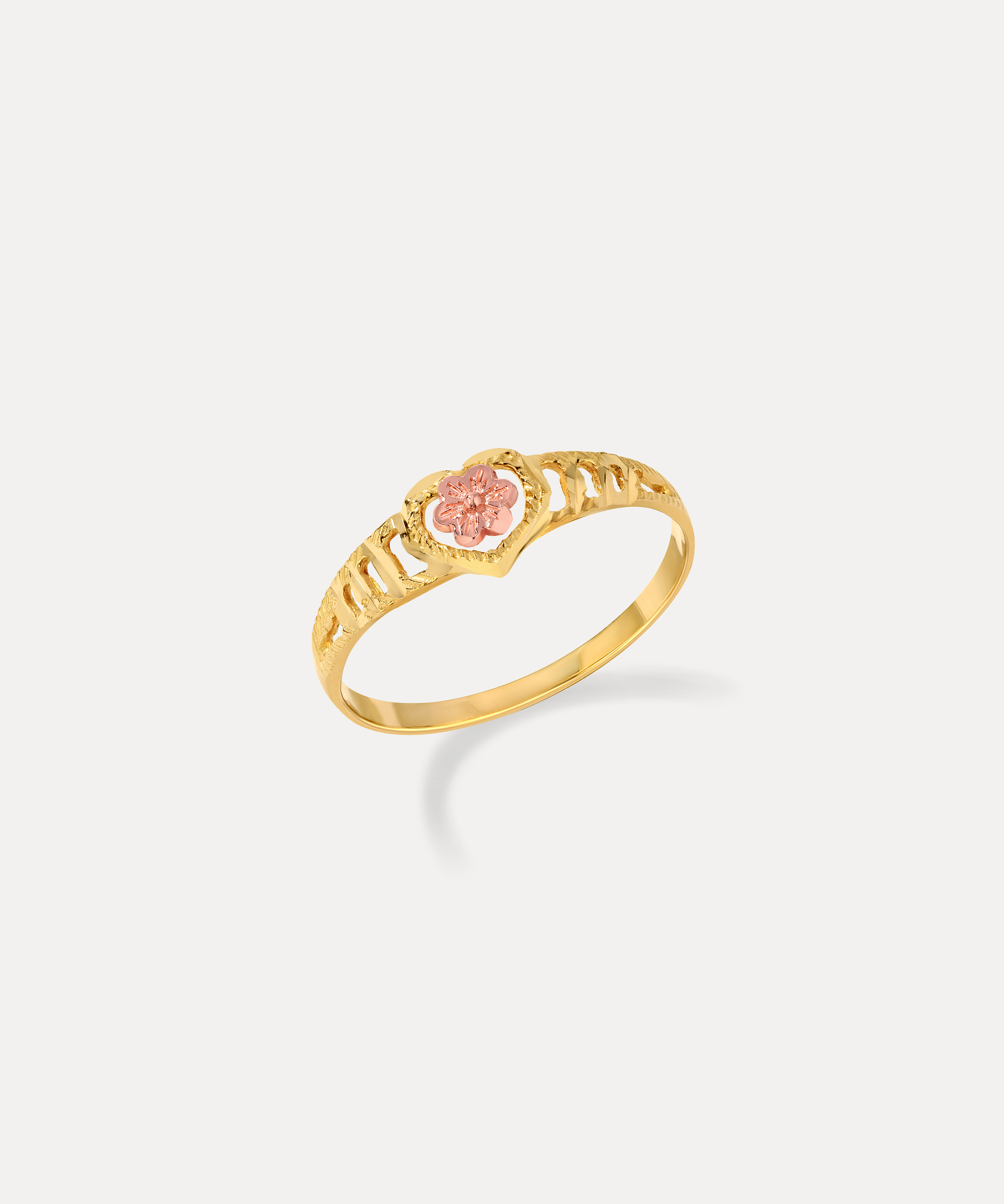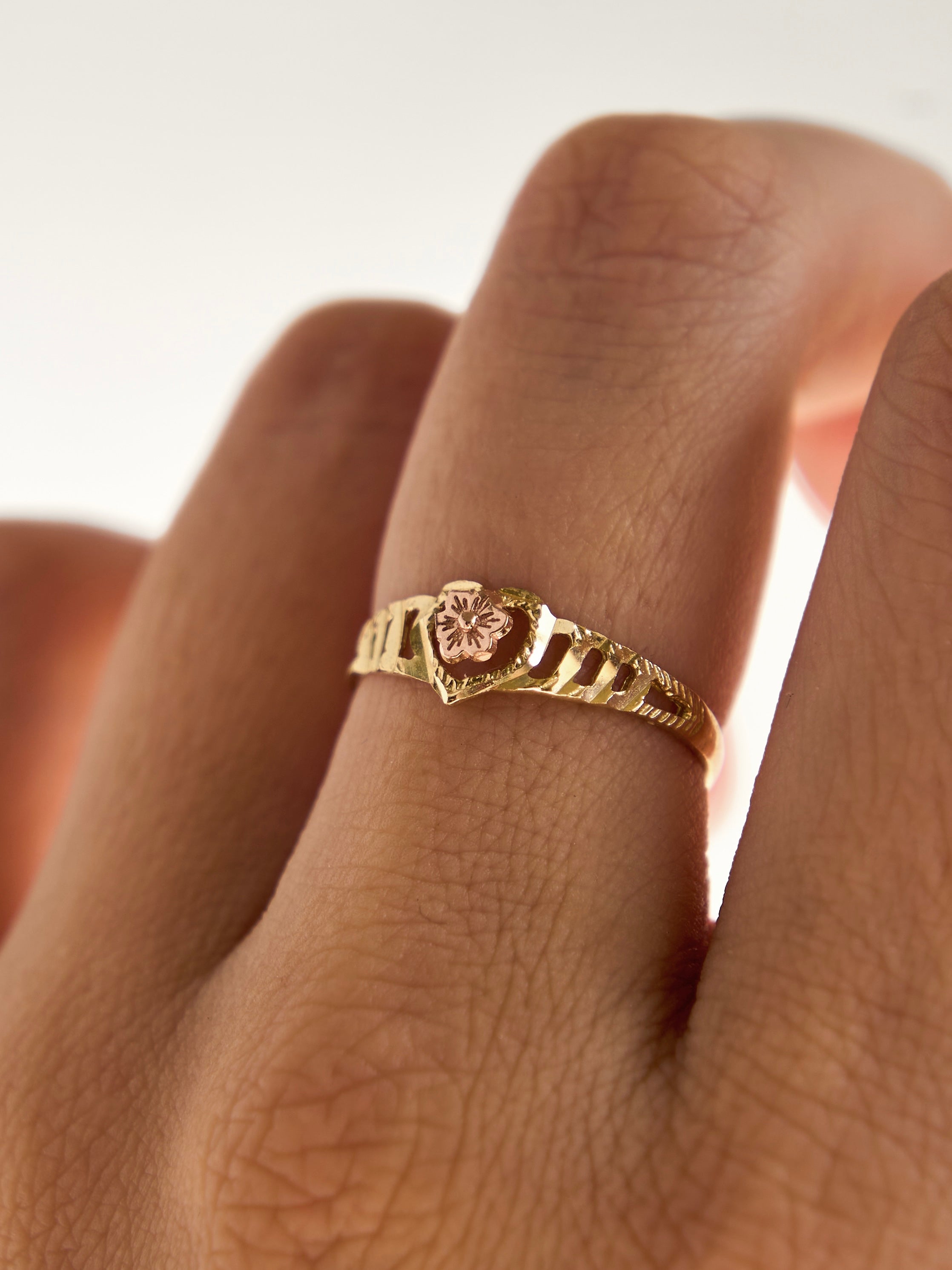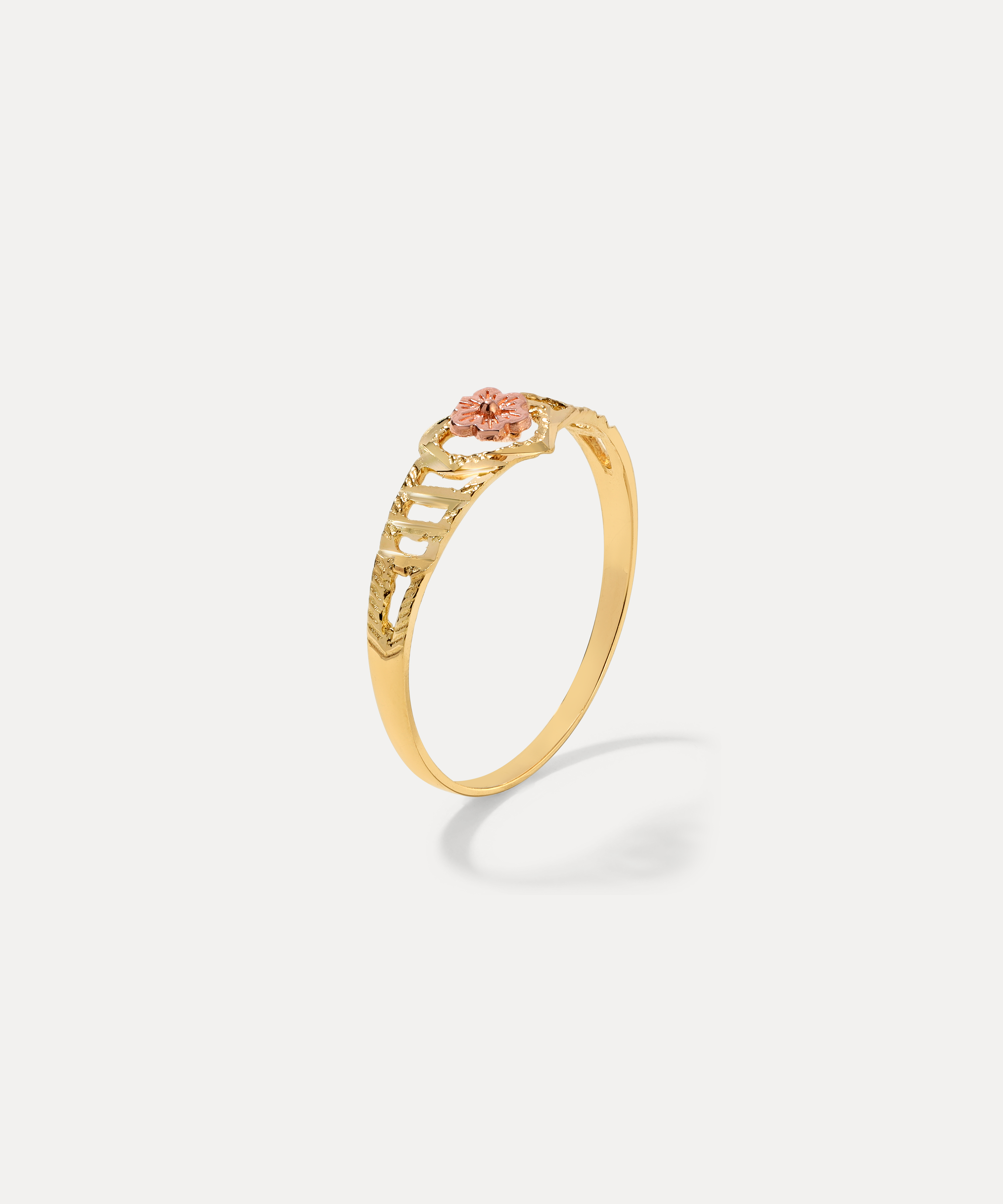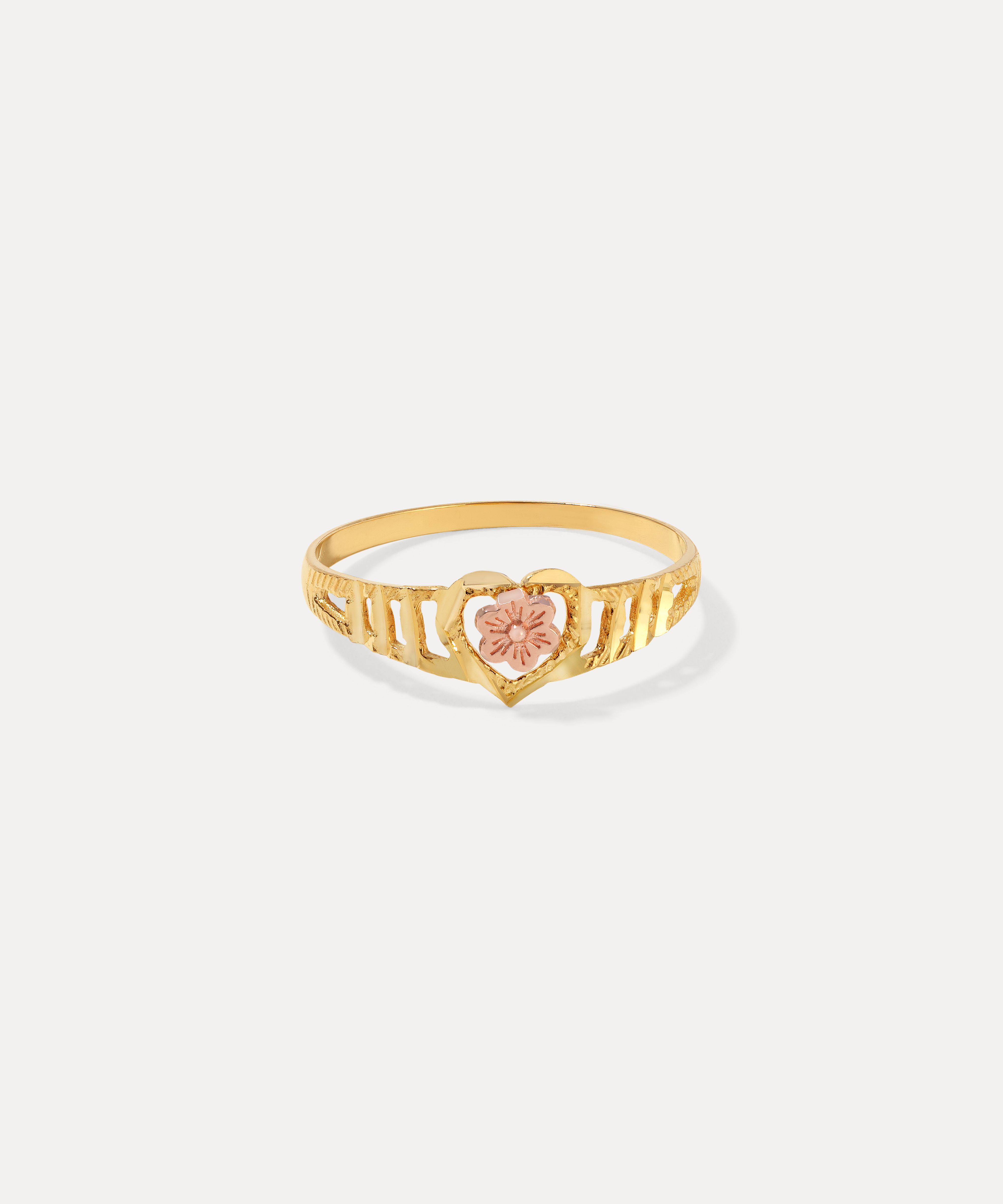 A romantic gesture captured in solid gold. The Blooming Heart Ring features a delicate 14k rose gold flower — etched in detail and framed within a polished yellow gold heart. The heart becomes part of the diamond-cut band, catching light at every angle for a brilliant finish. Whether gifted or chosen for yourself, it’s a symbol that never fades.