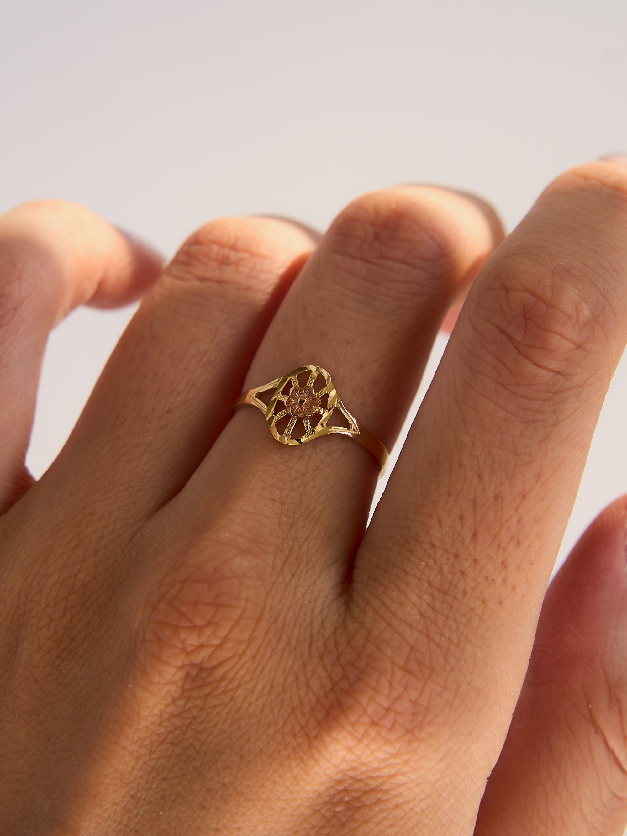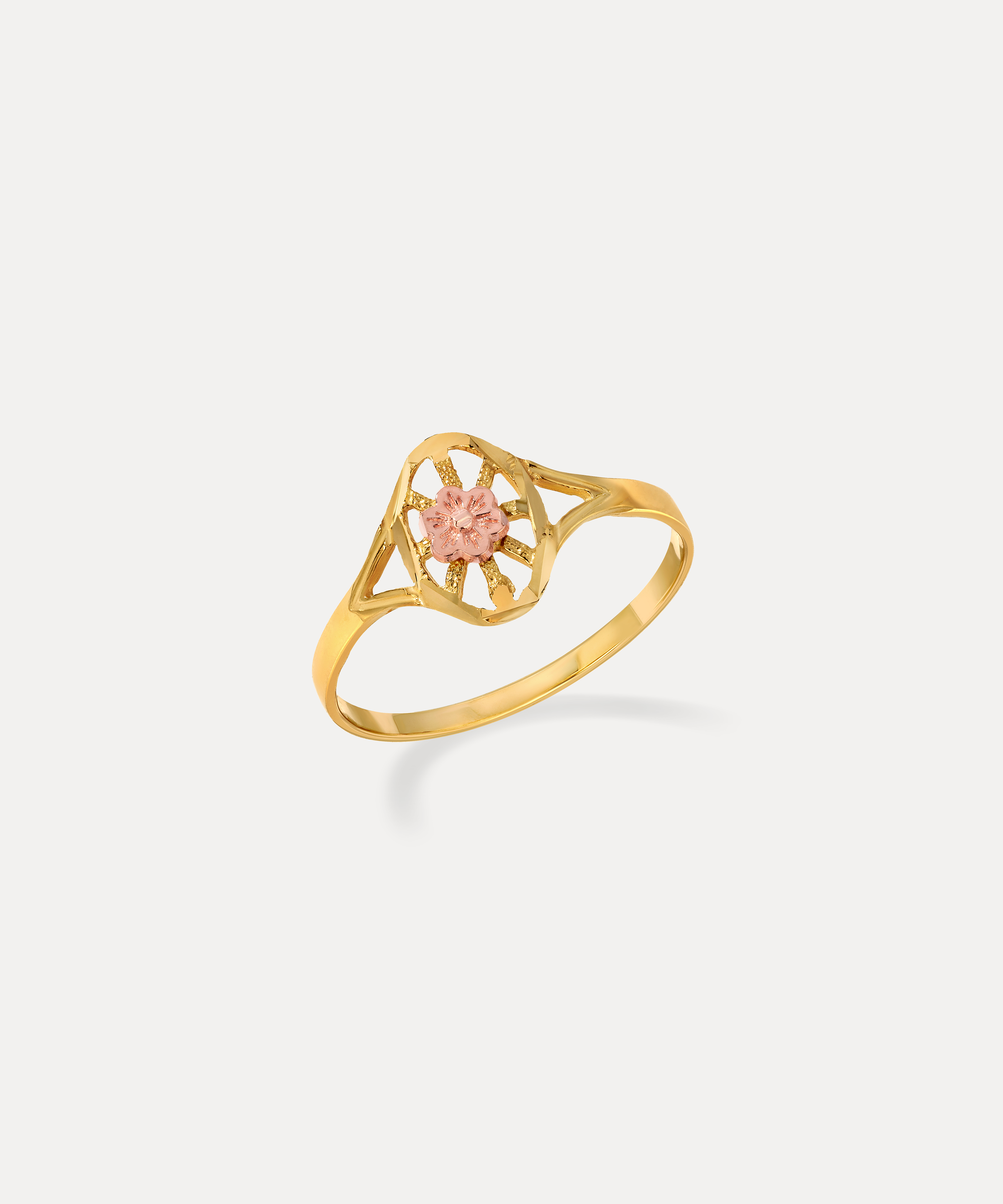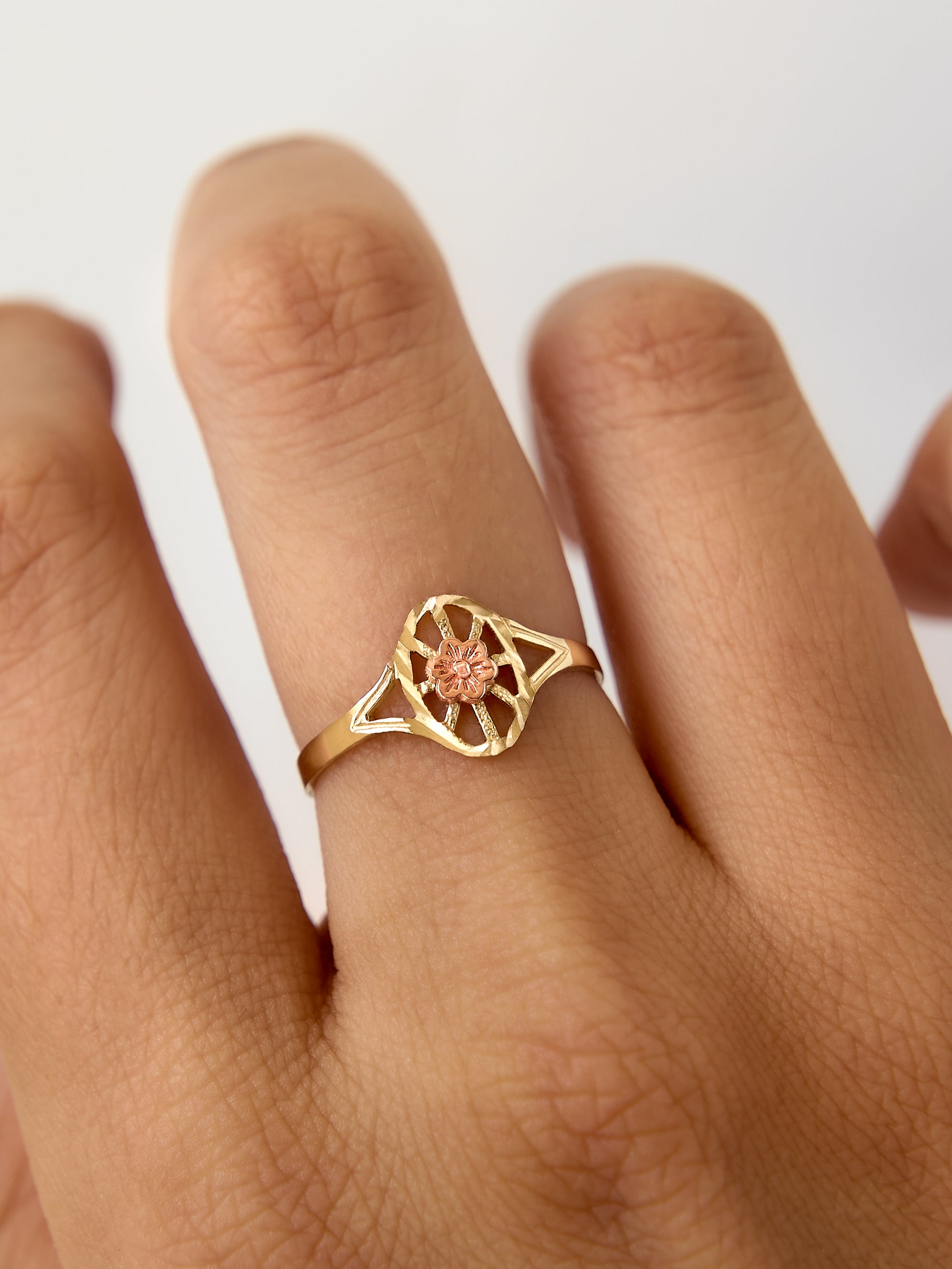 Centered with a faceted floral motif in warm 14k rose gold, the Flower Power Ring plays with shape and texture. The openwork fan setting and precision-cut accents reflect light from every angle, giving the design a dynamic, dimensional feel.