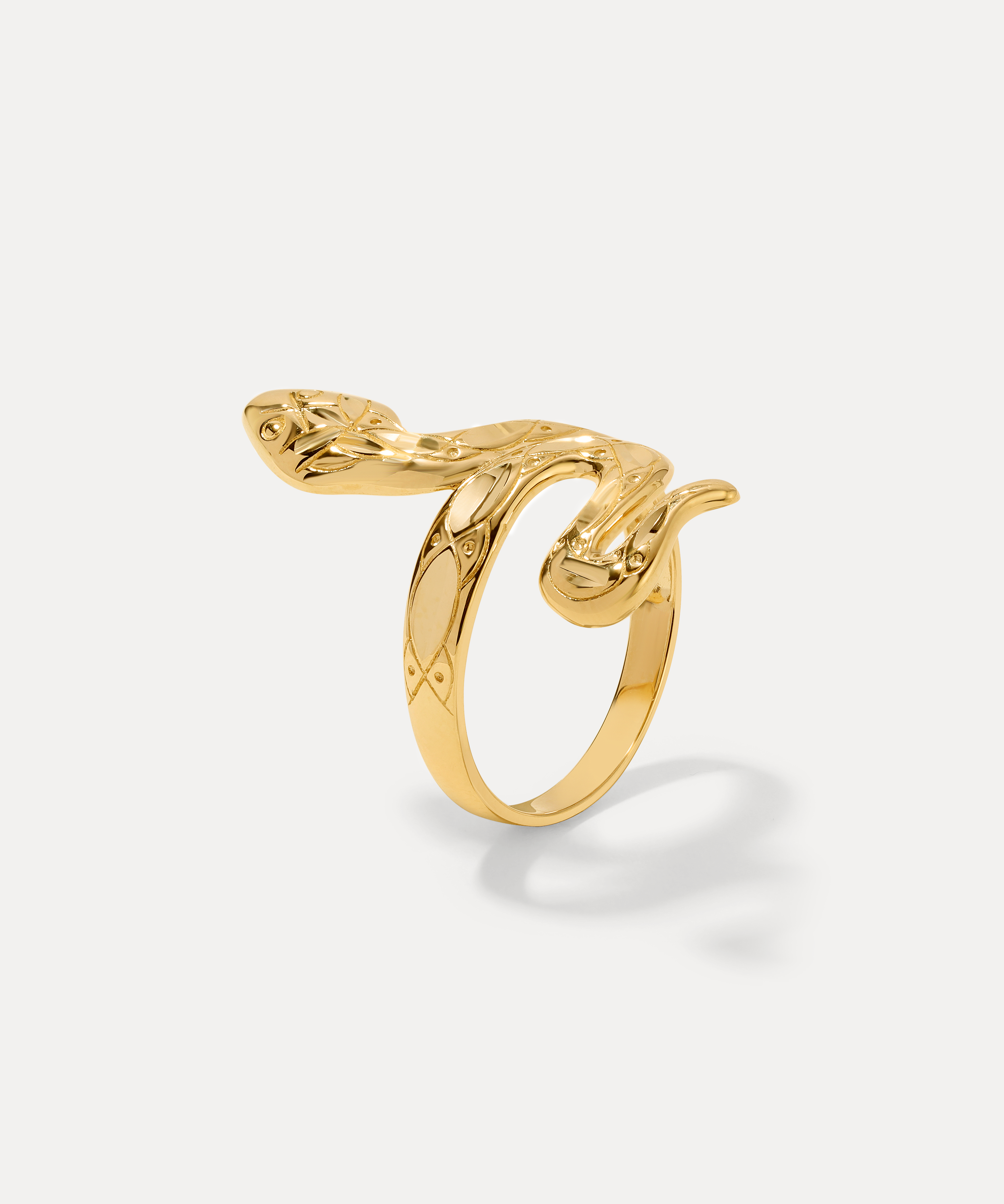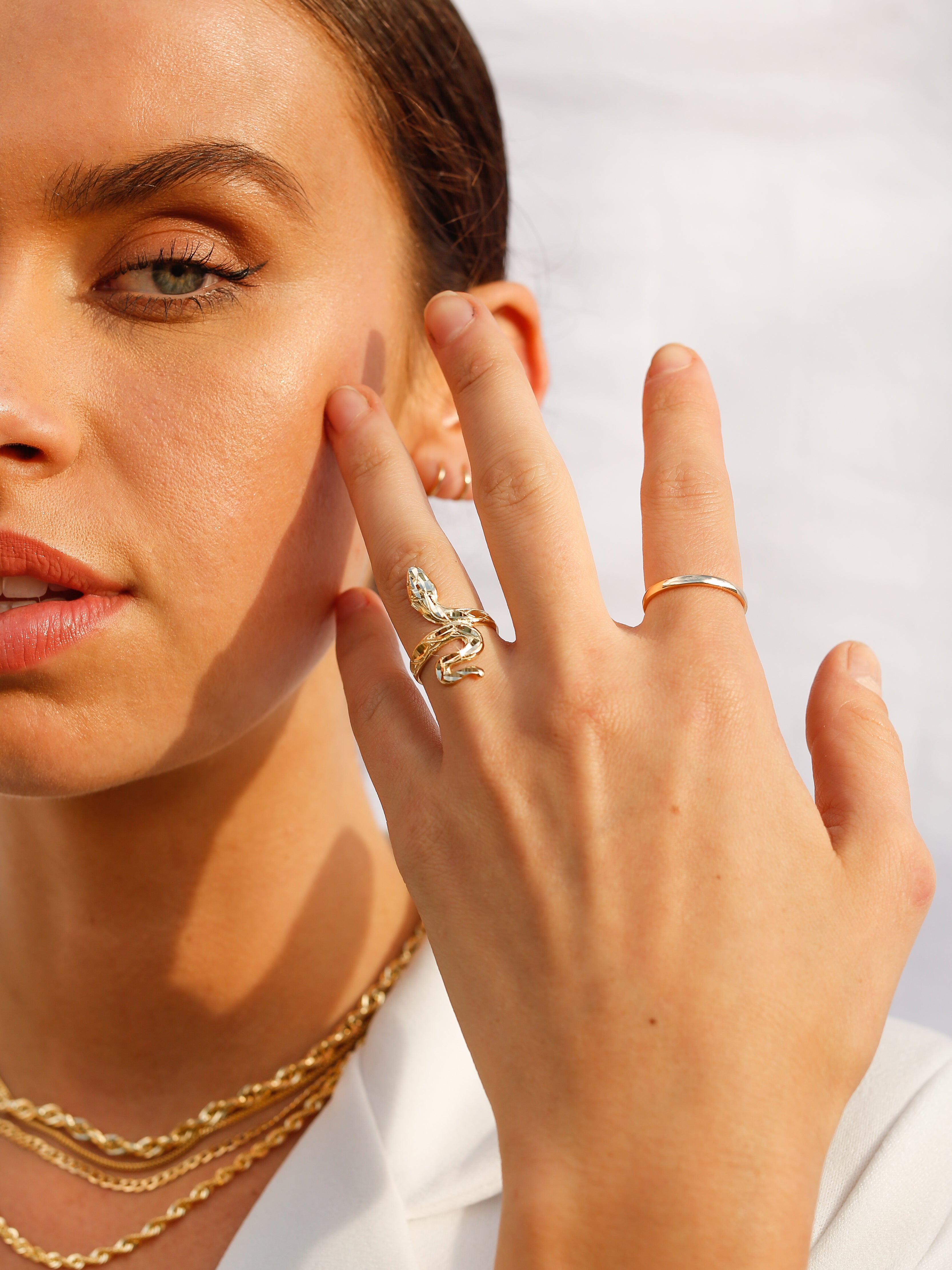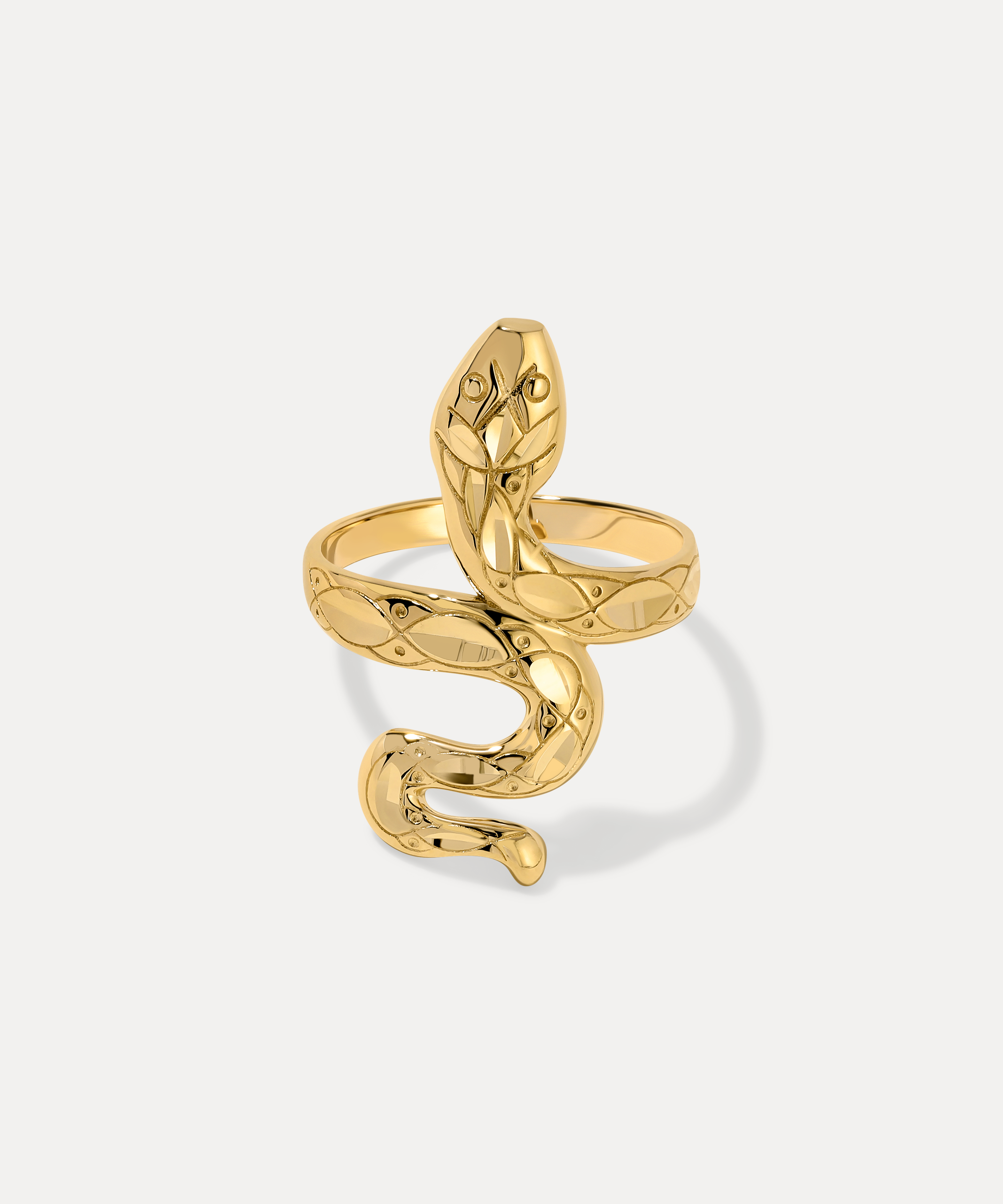 A symbol of transformation and eternal renewal, this 14k gold serpent coils around the finger with sinuous elegance. Etched with a pattern of scales and crowned with two piercing eyes, it’s a bold statement ring that commands attention — equal parts mystic and modern.