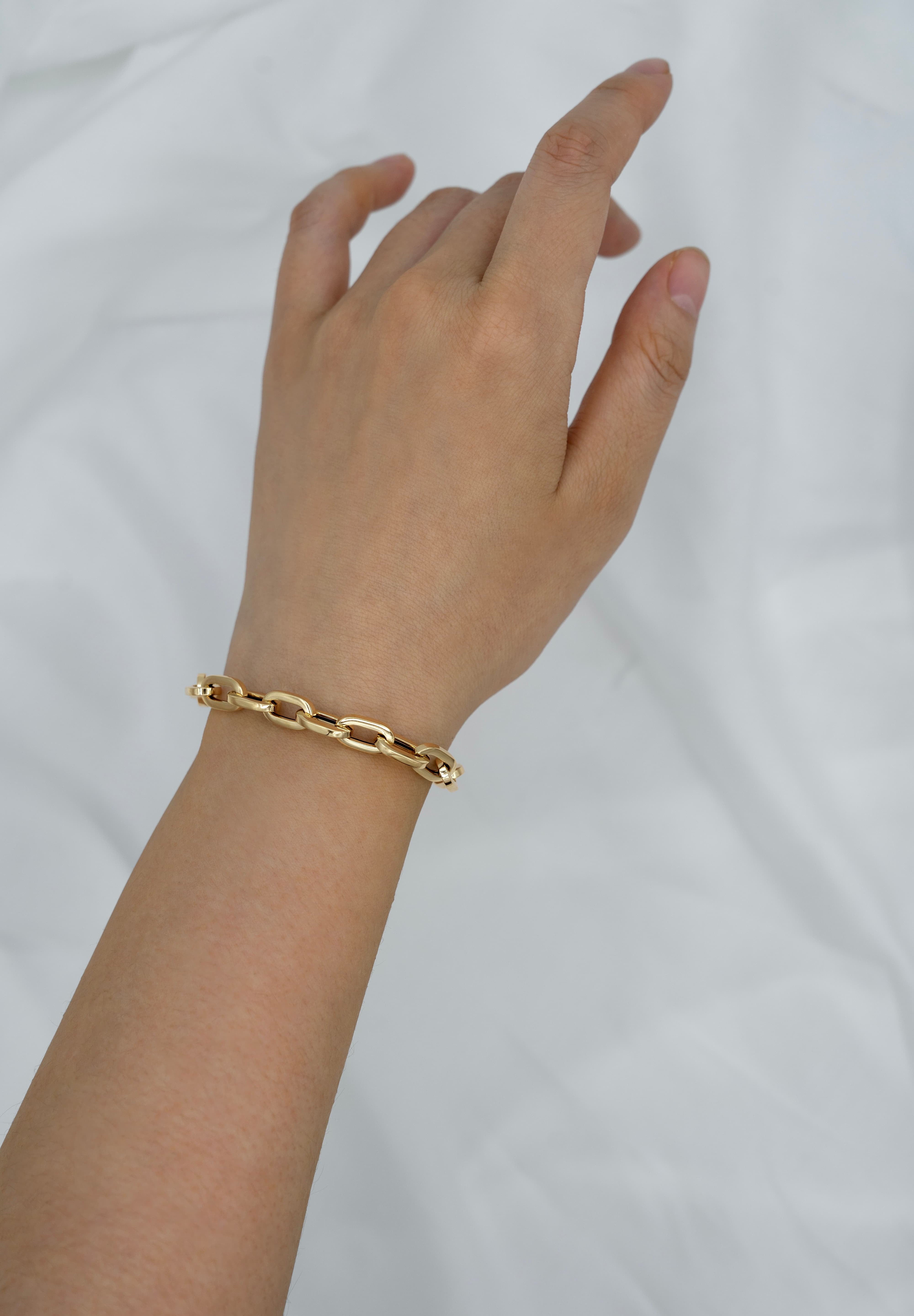 The Bold Link Bracelet features solid 14k gold links with smooth contours and generous spacing, giving it a strong silhouette without feeling heavy. With its open oval chain structure and high-polish finish, it’s designed to elevate your everyday — worn solo or layered with intention. A modern essential with a classic edge.