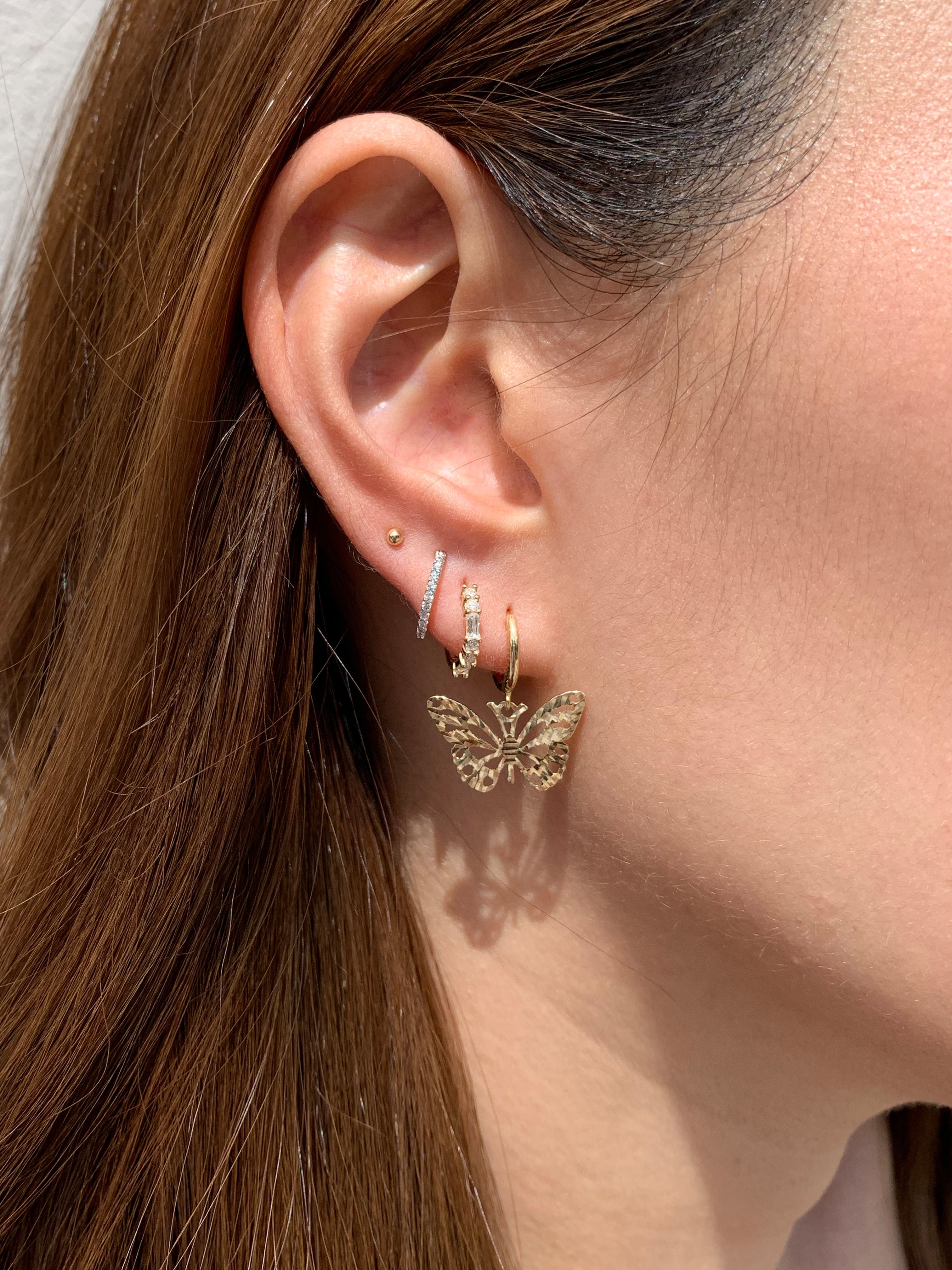 Delicate, dimensional, and full of movement. The Butterfly Hanging Huggies feature a sculpted butterfly charm with diamond-cut detailing and a hammered finish that catches and reflects light from every angle. Cast entirely in solid 14k gold — from the charm to the textured huggie — these earrings offer shimmer with every step and a secure, comfortable fit thanks to a hinged clasp. A playful take on polished gold, made to flutter.