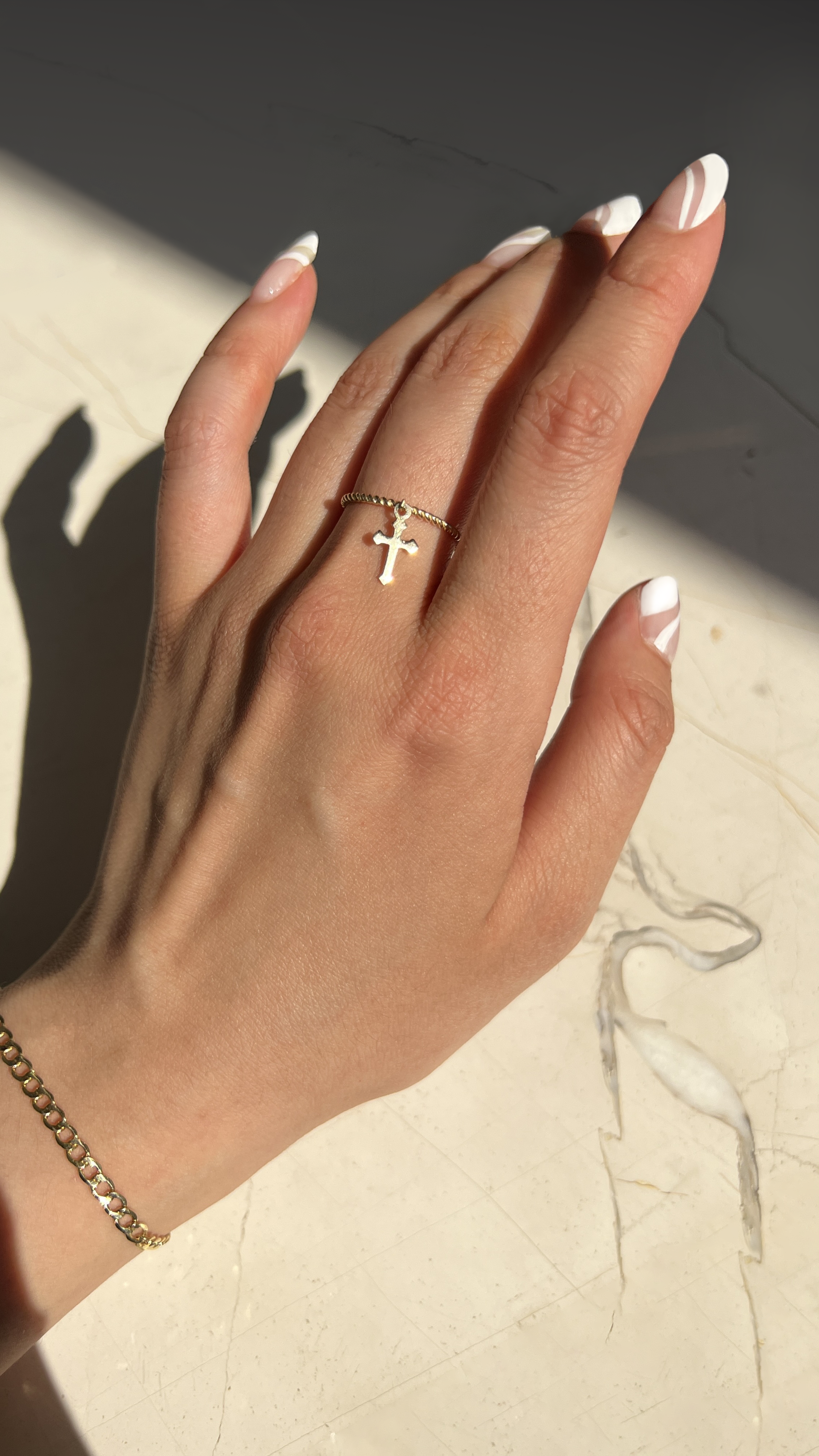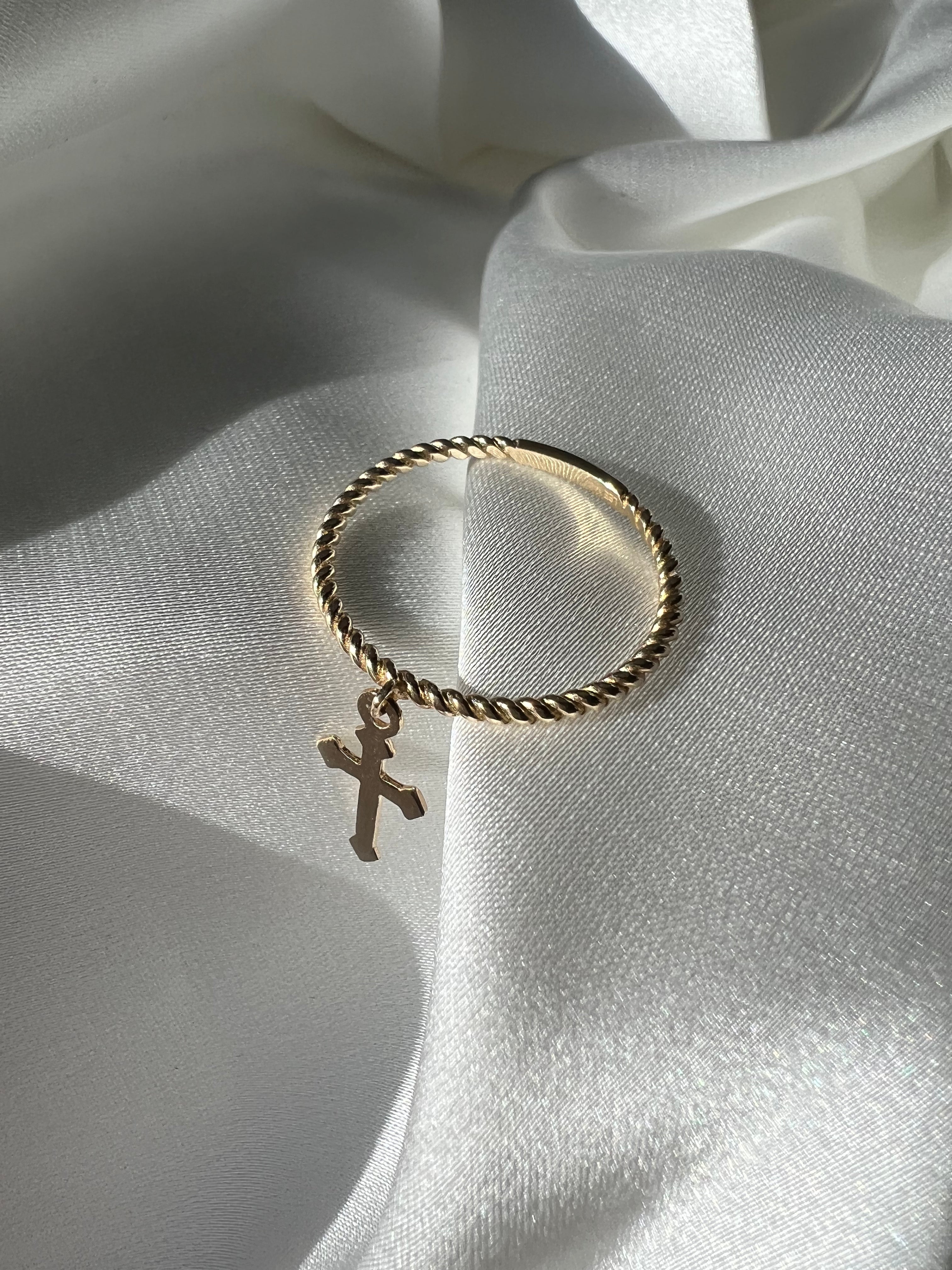 Designed to keep up with your rhythm, this playful ring features a free-moving cross charm suspended from a twisted 14k gold band.