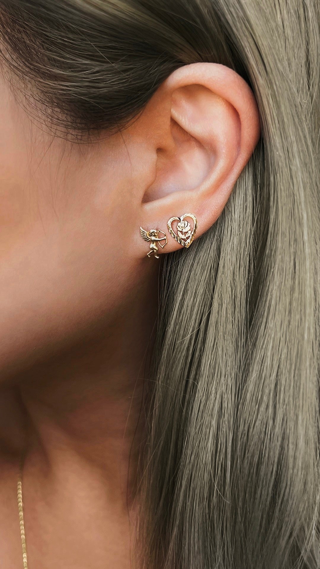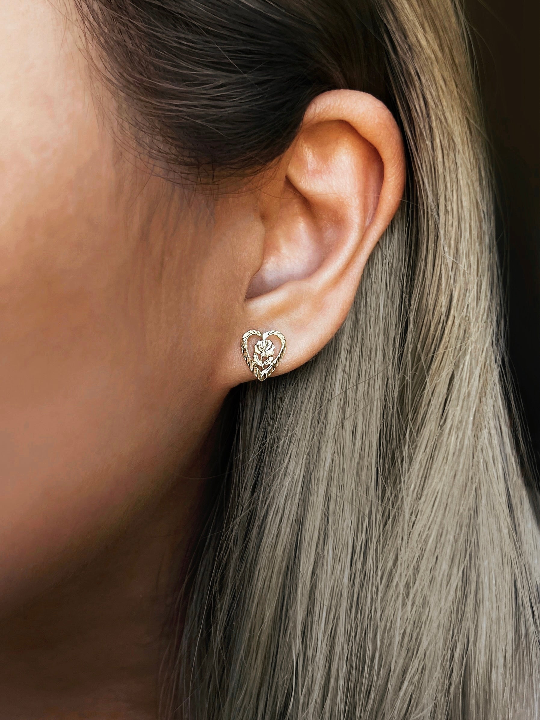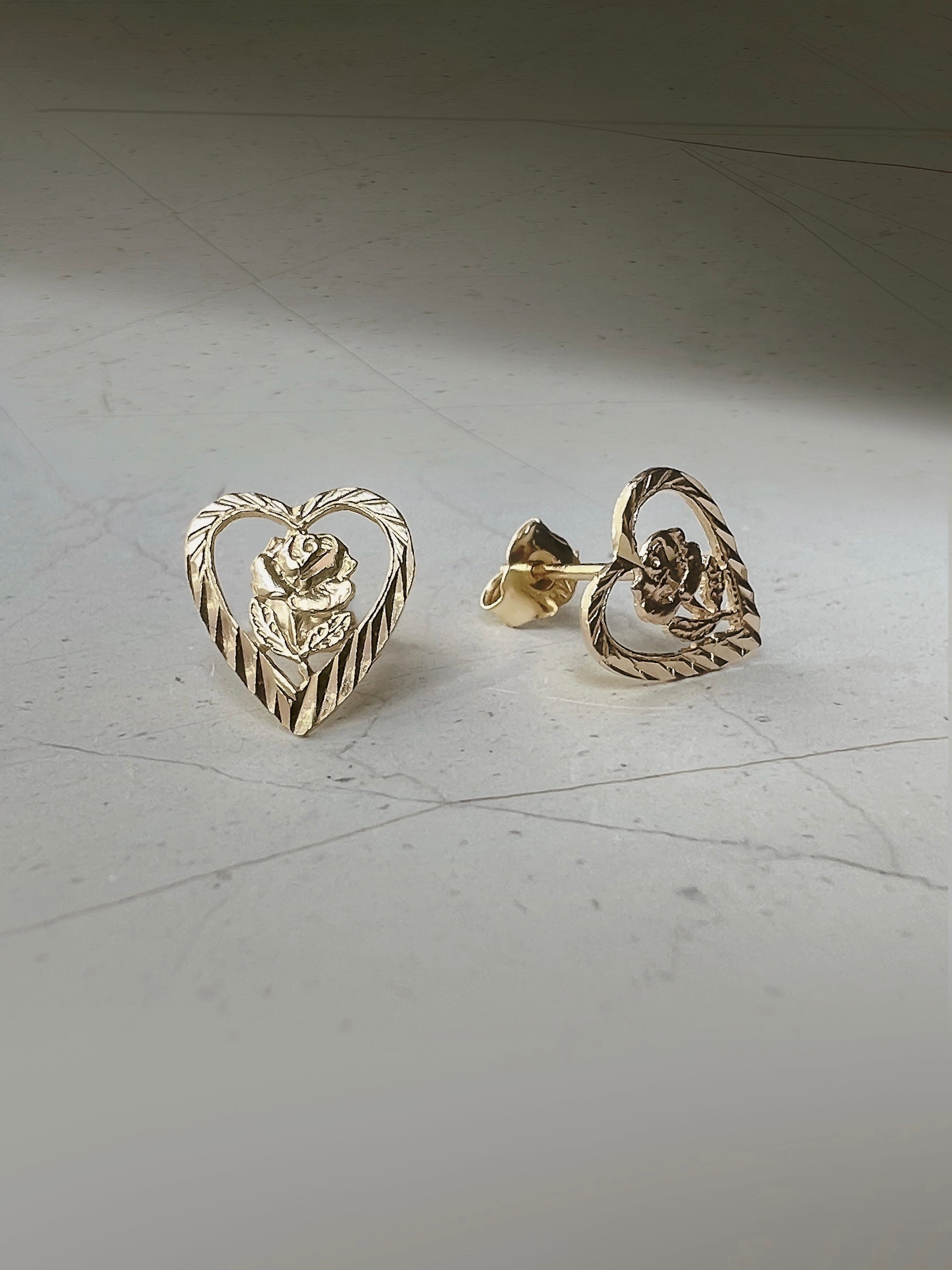 These sweet heart-shaped studs pair two timeless symbols — love and roses — in a design that feels both nostalgic and enduring. The rose is carefully sculpted with its stem and leaves, cradled inside a diamond-cut frame that sparkles with every turn.